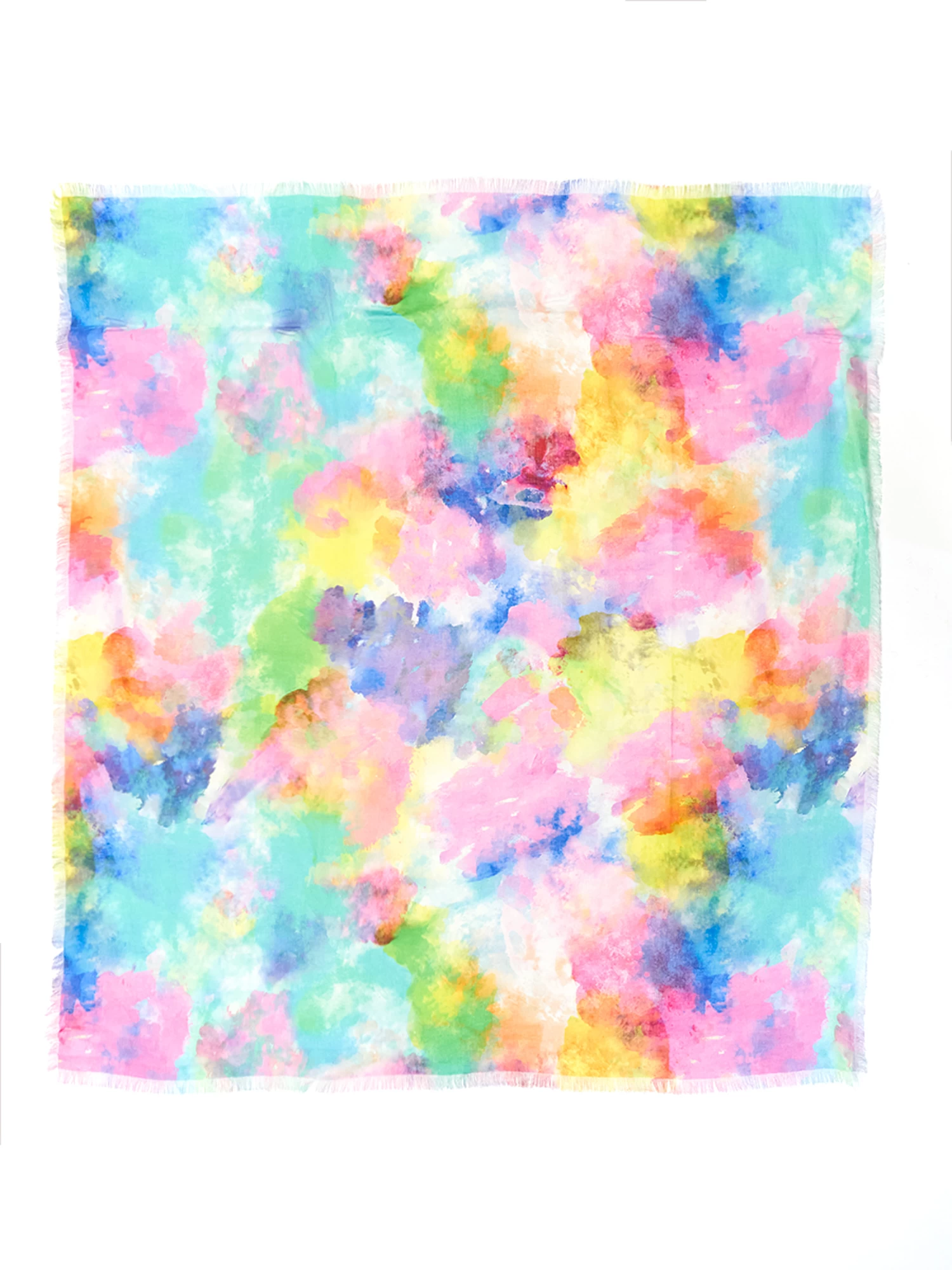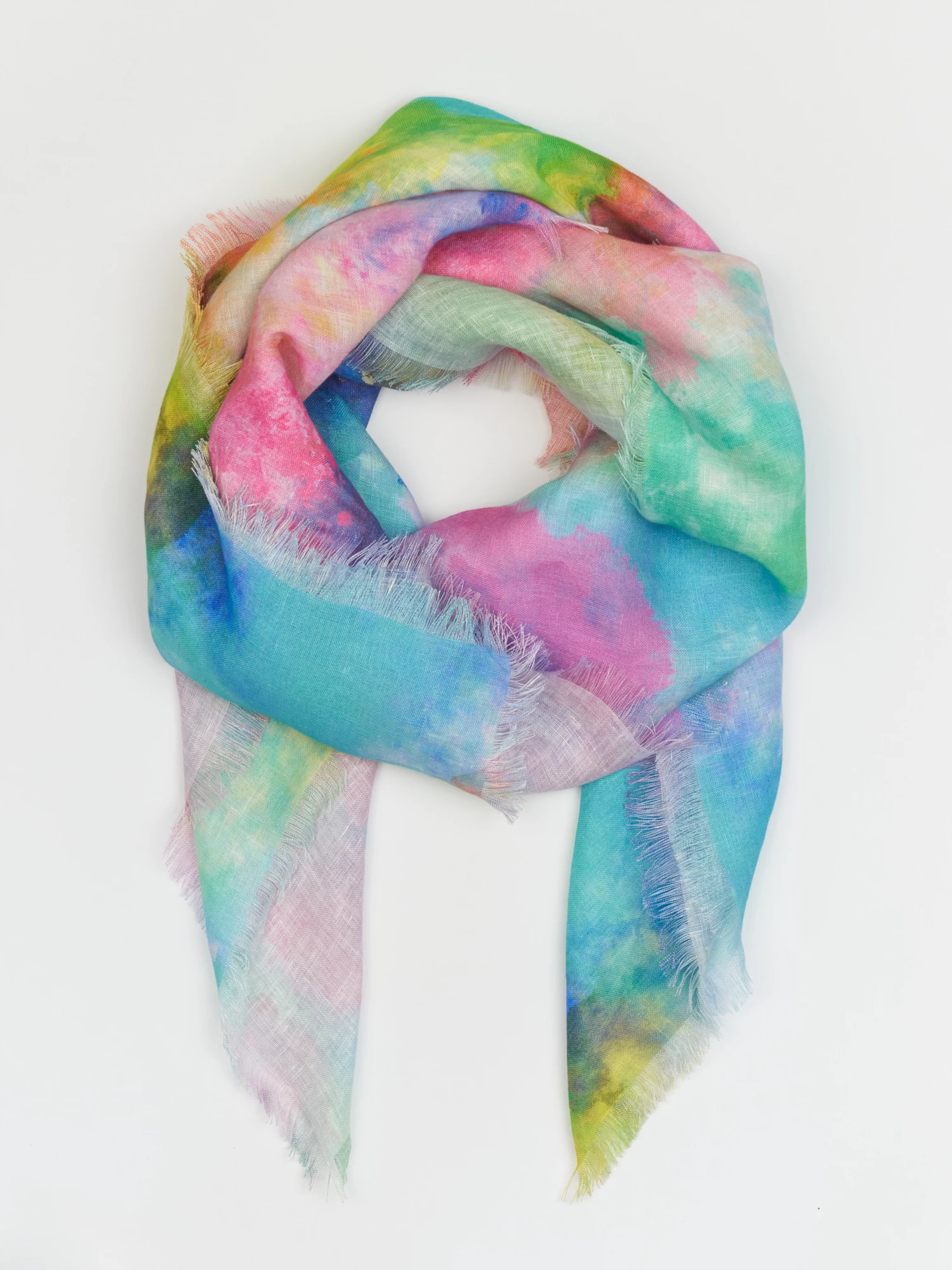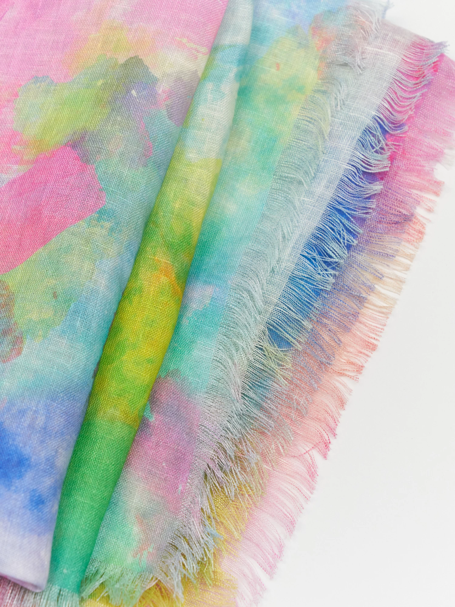 Linen scarf with a hand-painted design in multi colors with fringe edges.