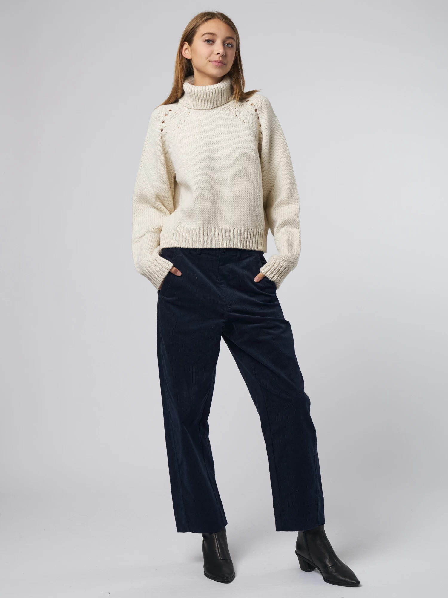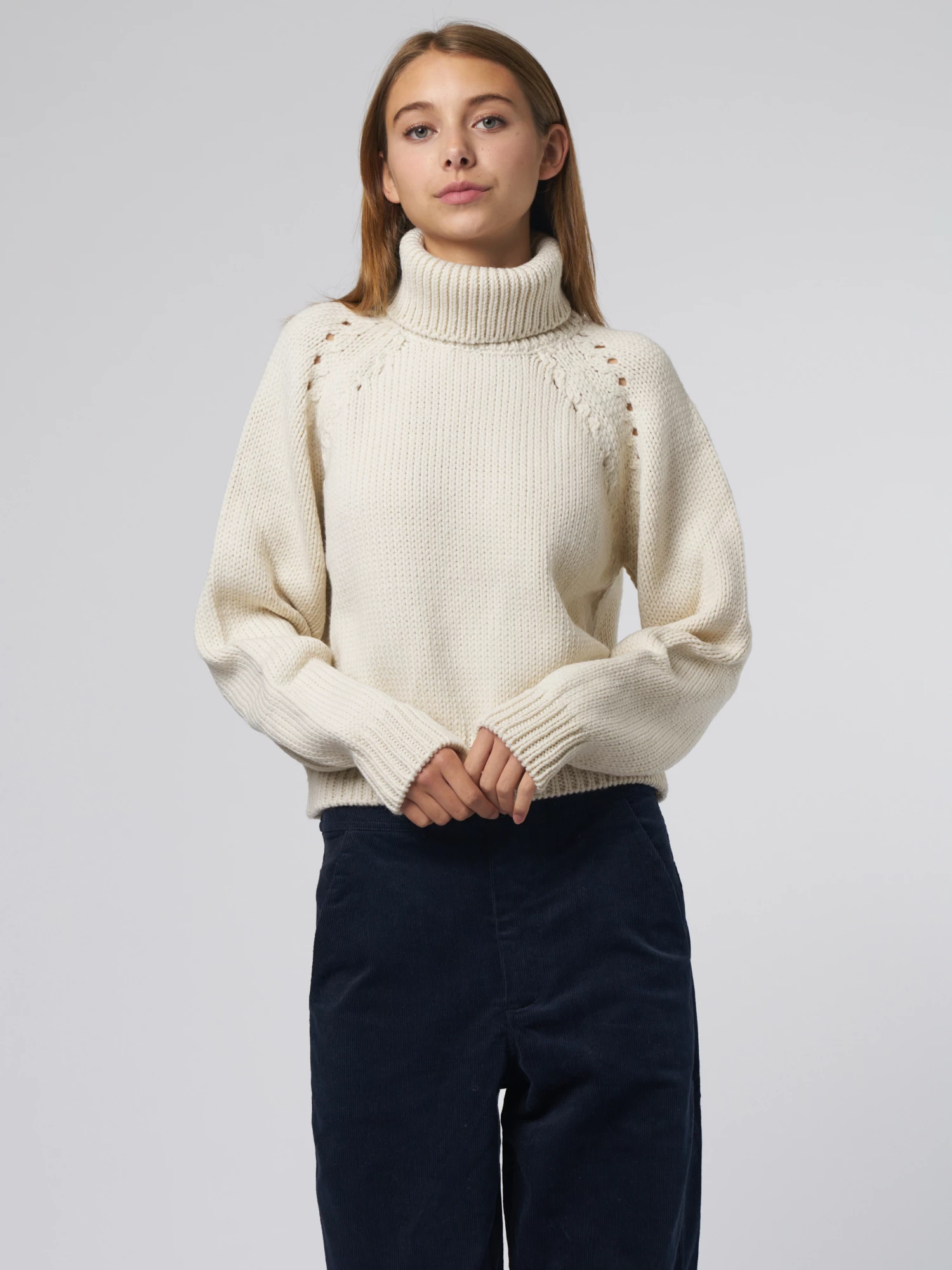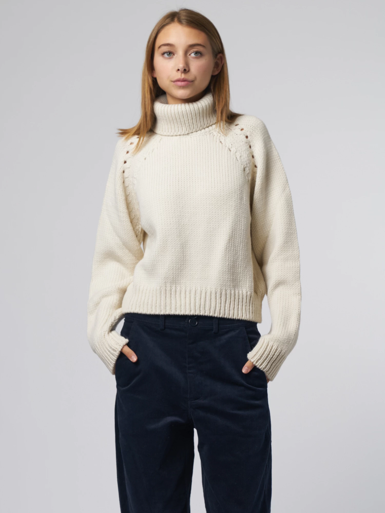 Very soft merino wool sweater features cropped, straight fit, fold-over turtleneck, full-length sleeve