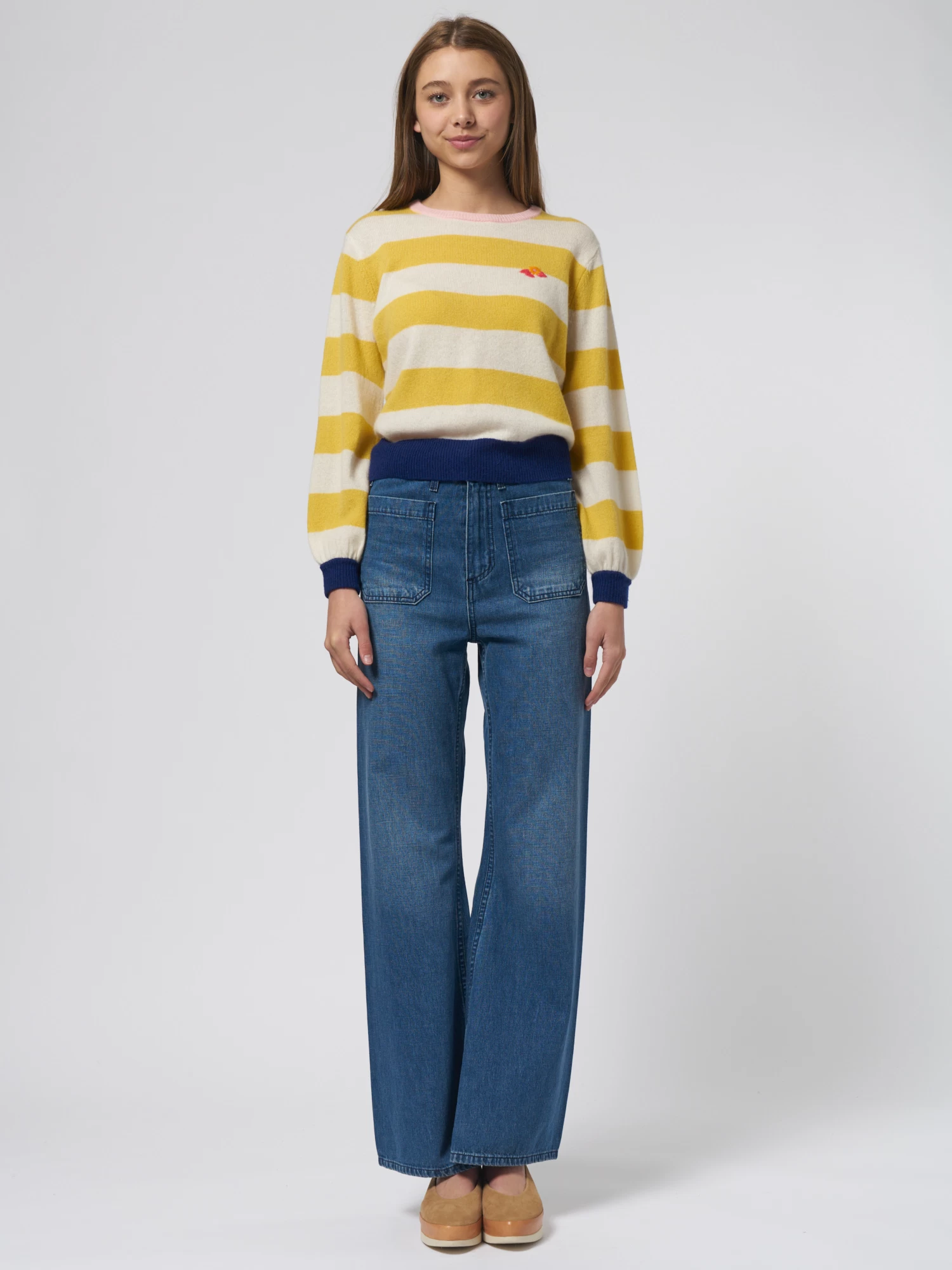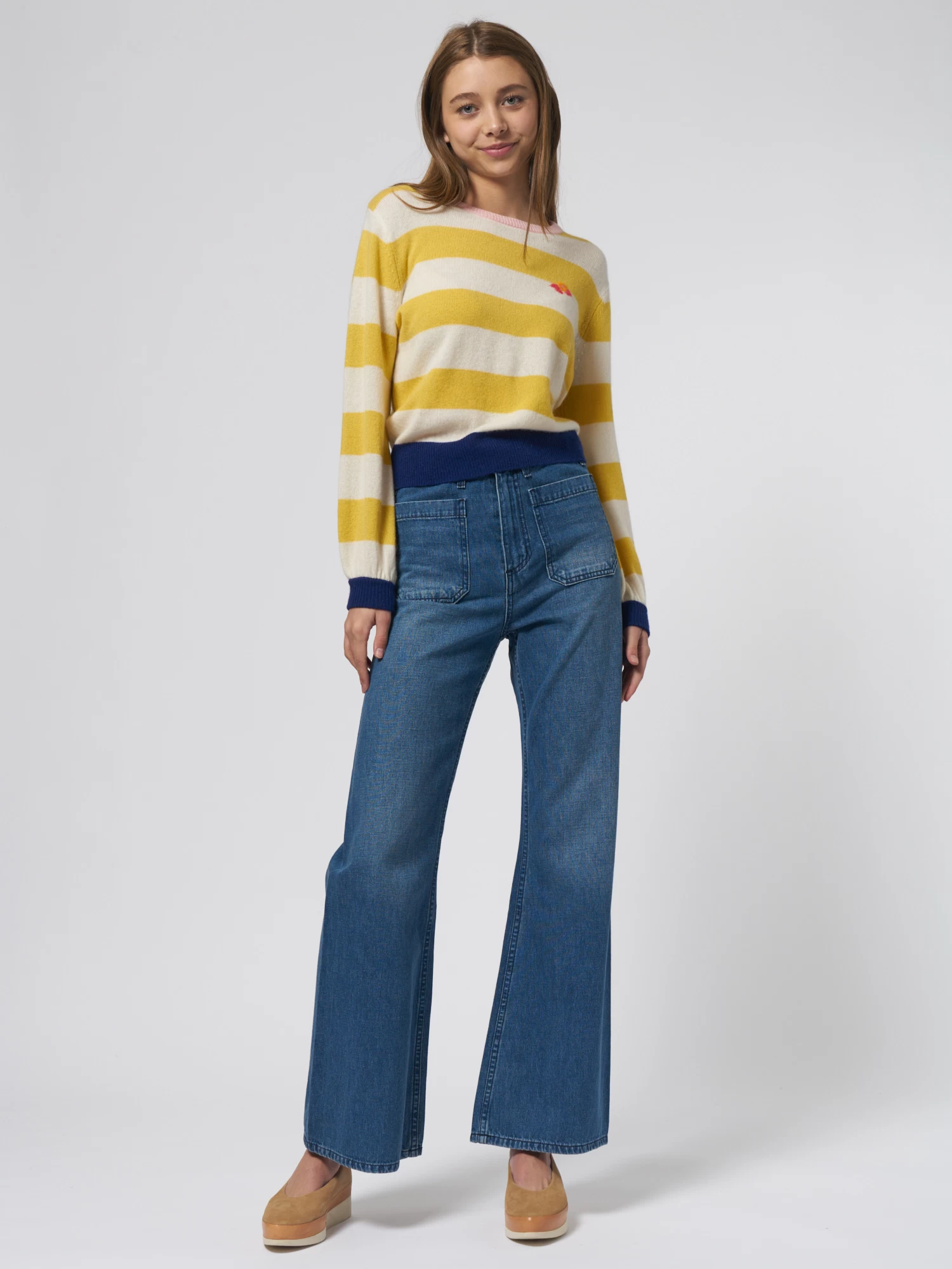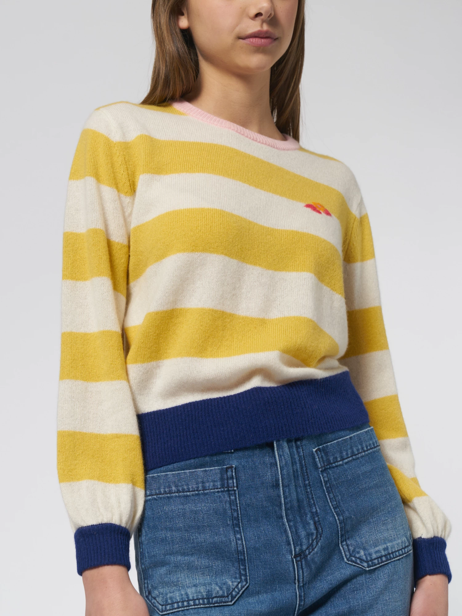 The lightweight cashmere crew in a yellow-white stripe with a pink contrasting collar, navy cuffs, and embroidery flowers