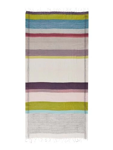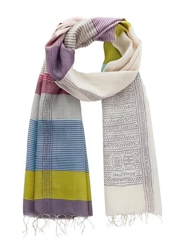 Cotton-silk blend scarf with fringed edges and multi-color stripe print throughout.