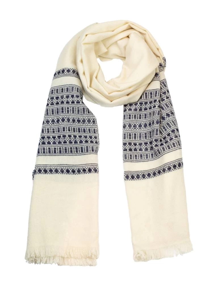An oblong pashmina scarf with contrasting patterns and fringed trim.