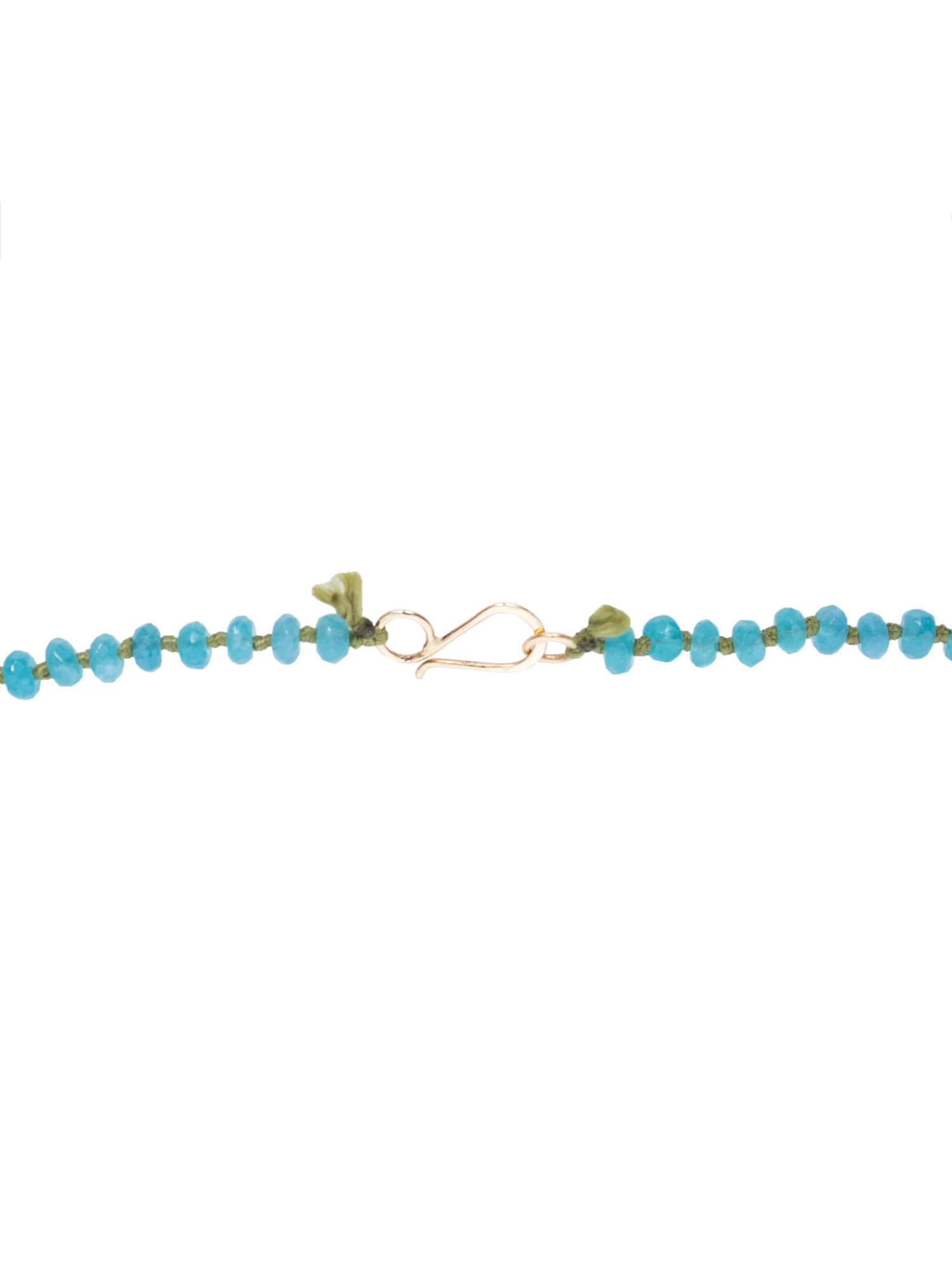A tourmaline pendant necklace with sea agate and opal beads knotted on silk with a 14K gold clasp.