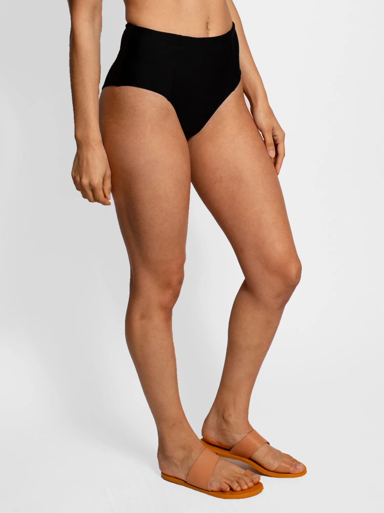 Bikini bottom in black sand. Fit on the hips with a cheeky bum and high waist.
