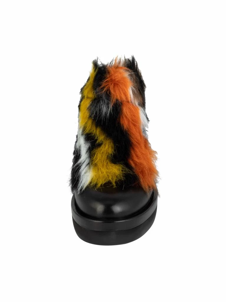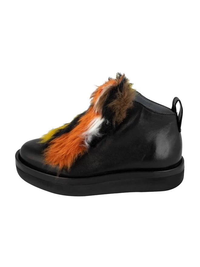 A black leather slip-on platform sneaker with a multi color shearling top.