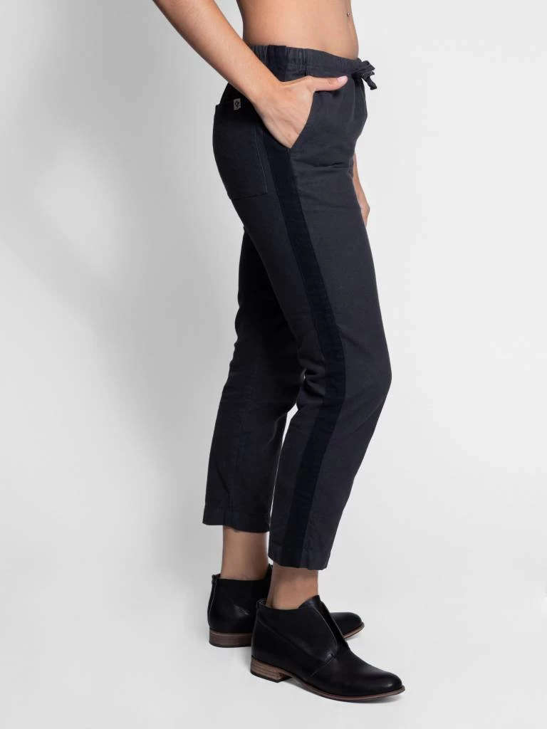 A cropped ankle pant with an elastic waist and side stripe accent.