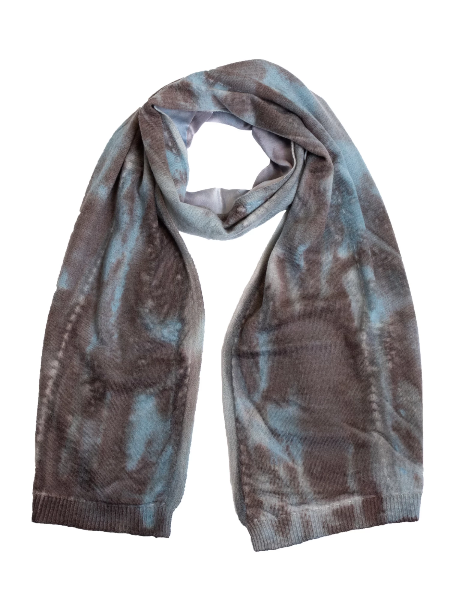 A cashmere scarf features a silk back with an abstract taupe and blue dye pattern.