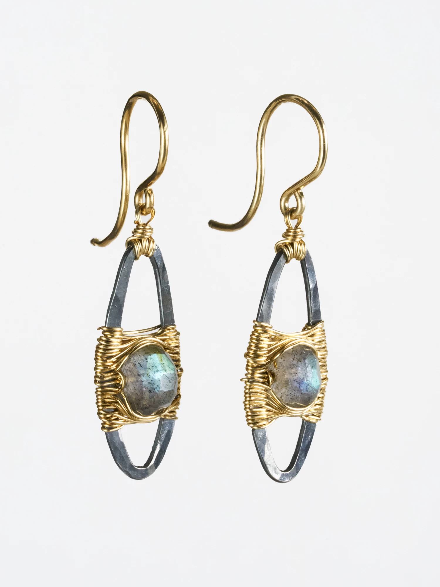Fascinated Labradorite wrapped with gold wire and surrounded with silver metal.