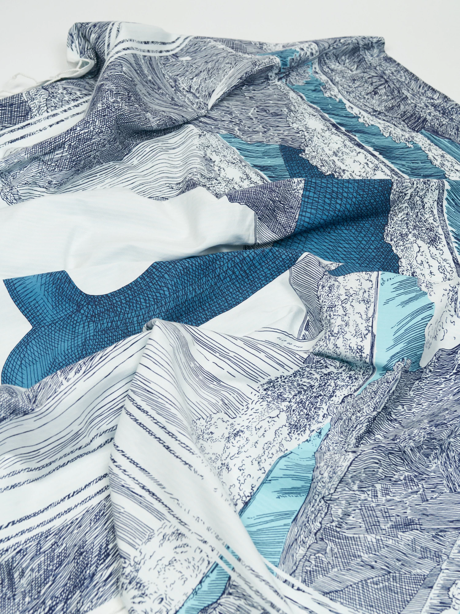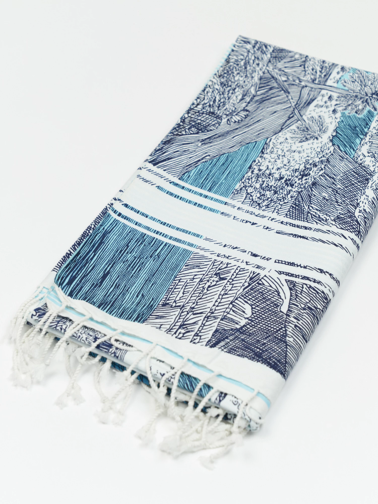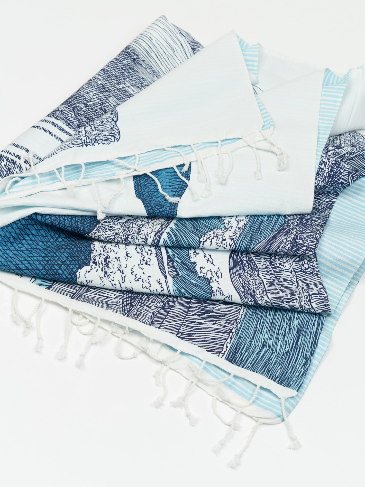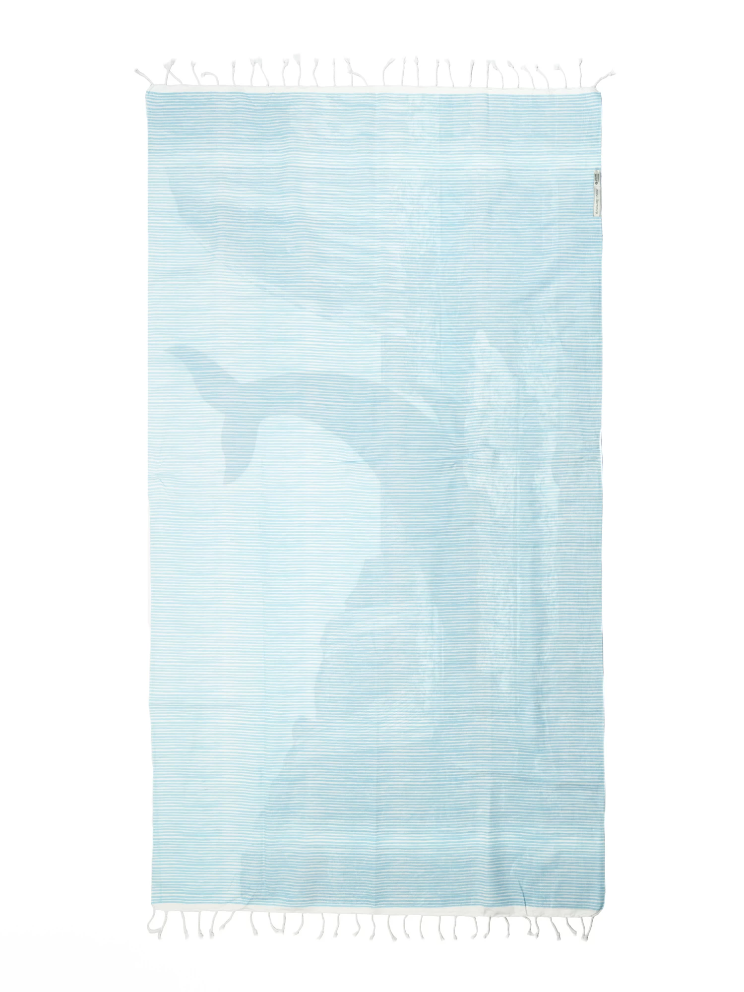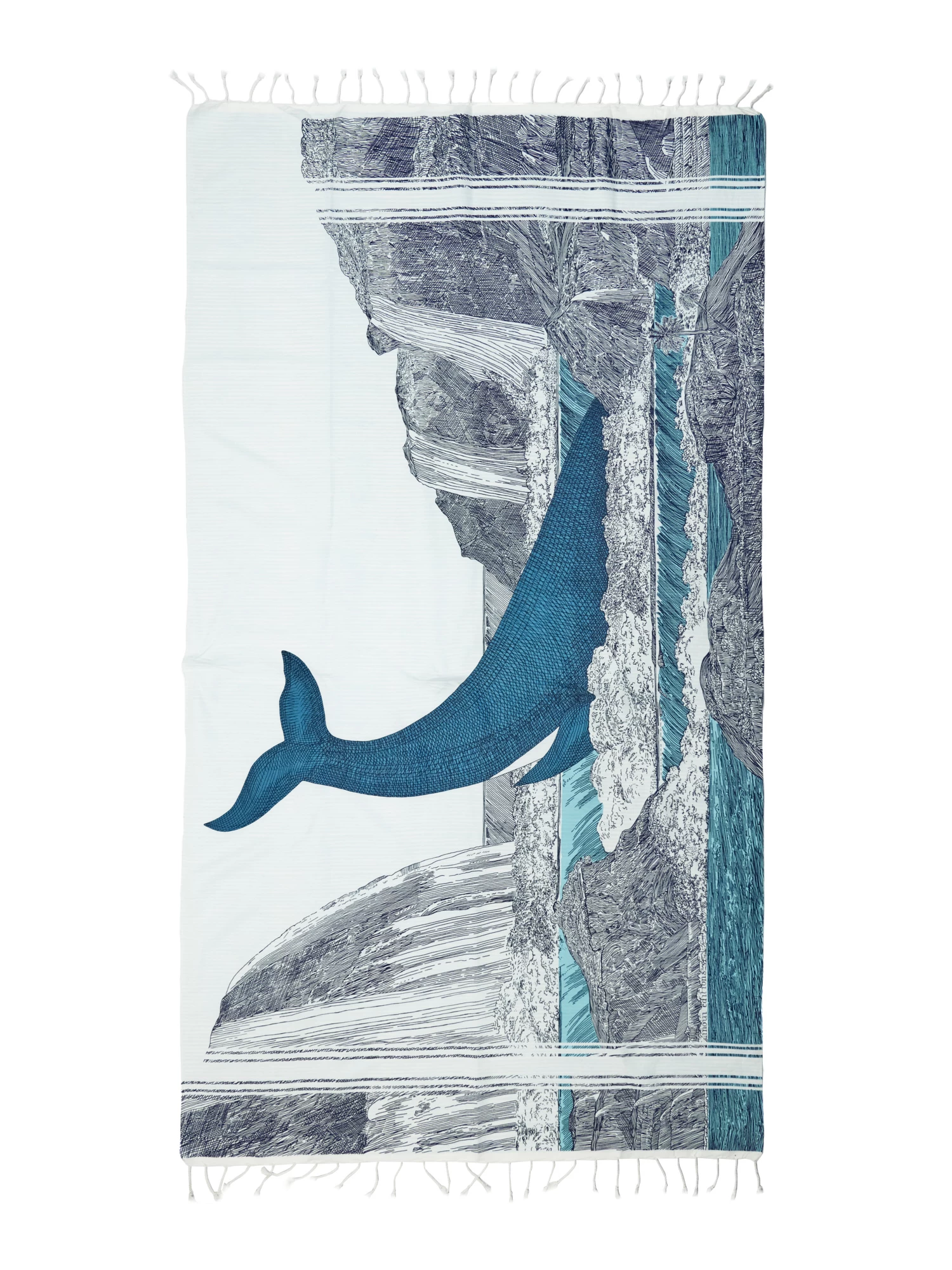 Cotton canvas Fouta with fringed edges and print of whale tale and ribbon throughout. Can be worn as a sarong or used as a beach towel.