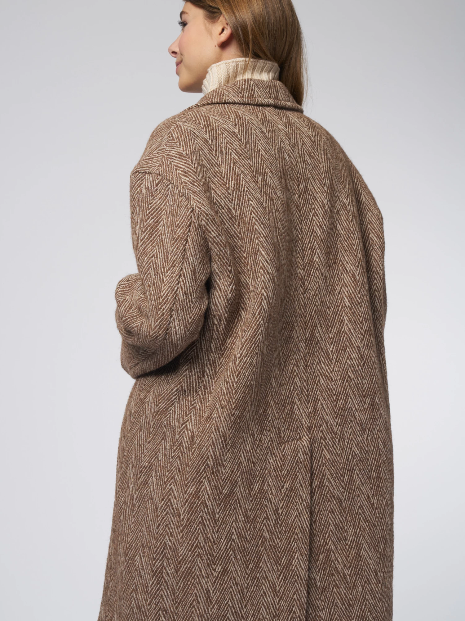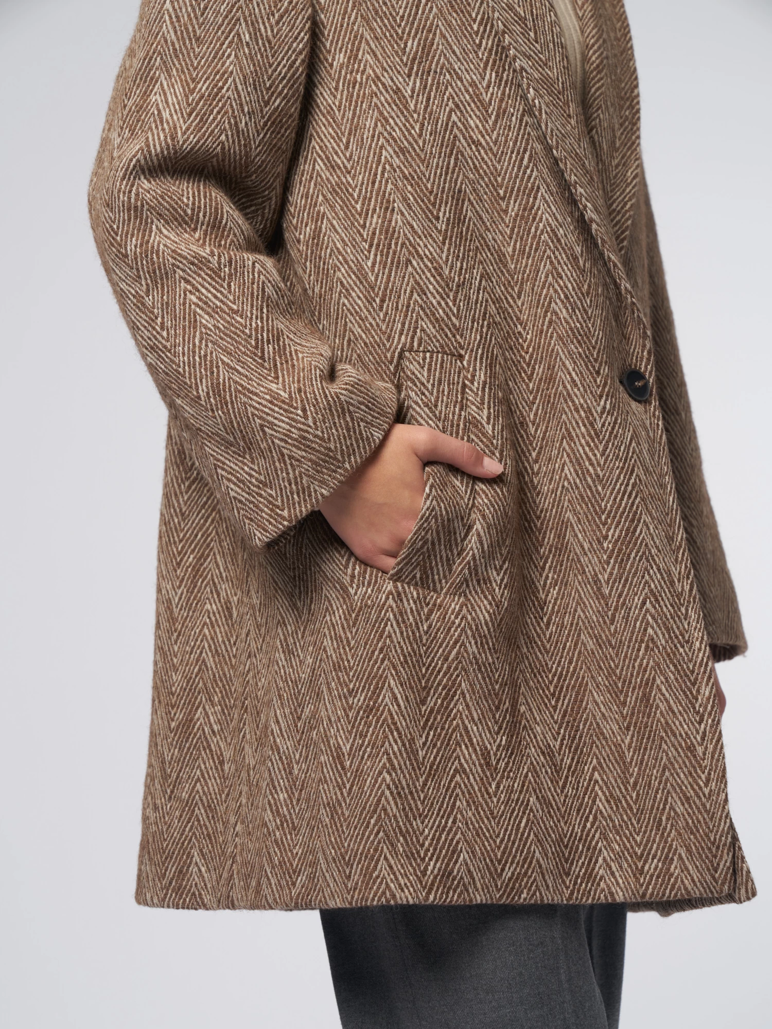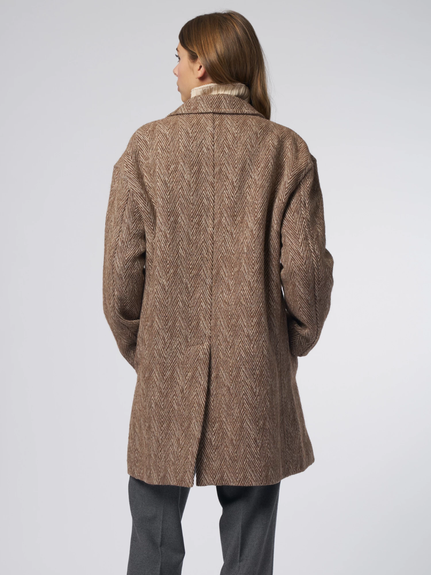 Wool and cotton, herringbone pattern coat features a collar with lapels, dropped buttoning with one button, side pockets, slightly dropped shoulders, large central rear split.
