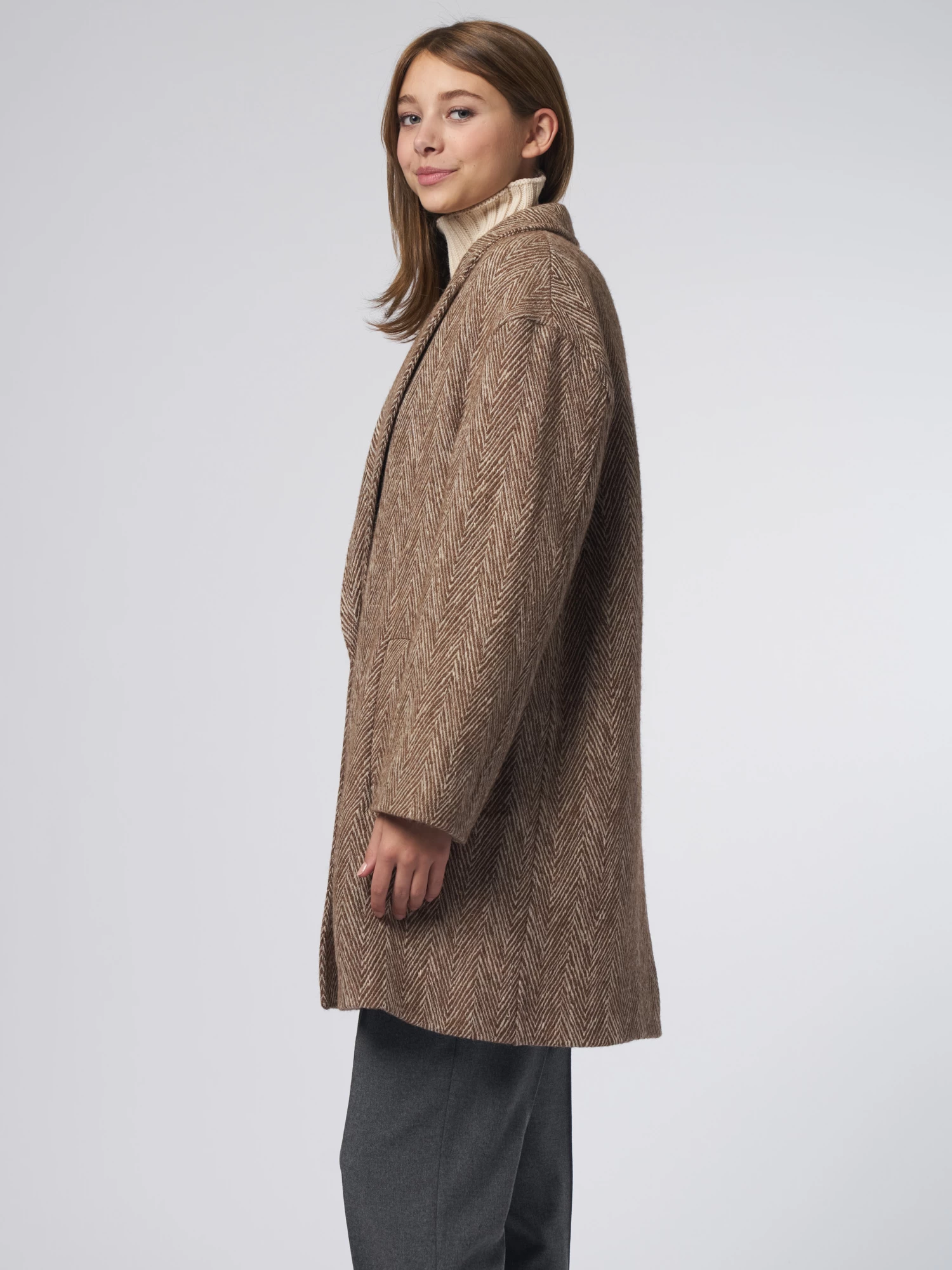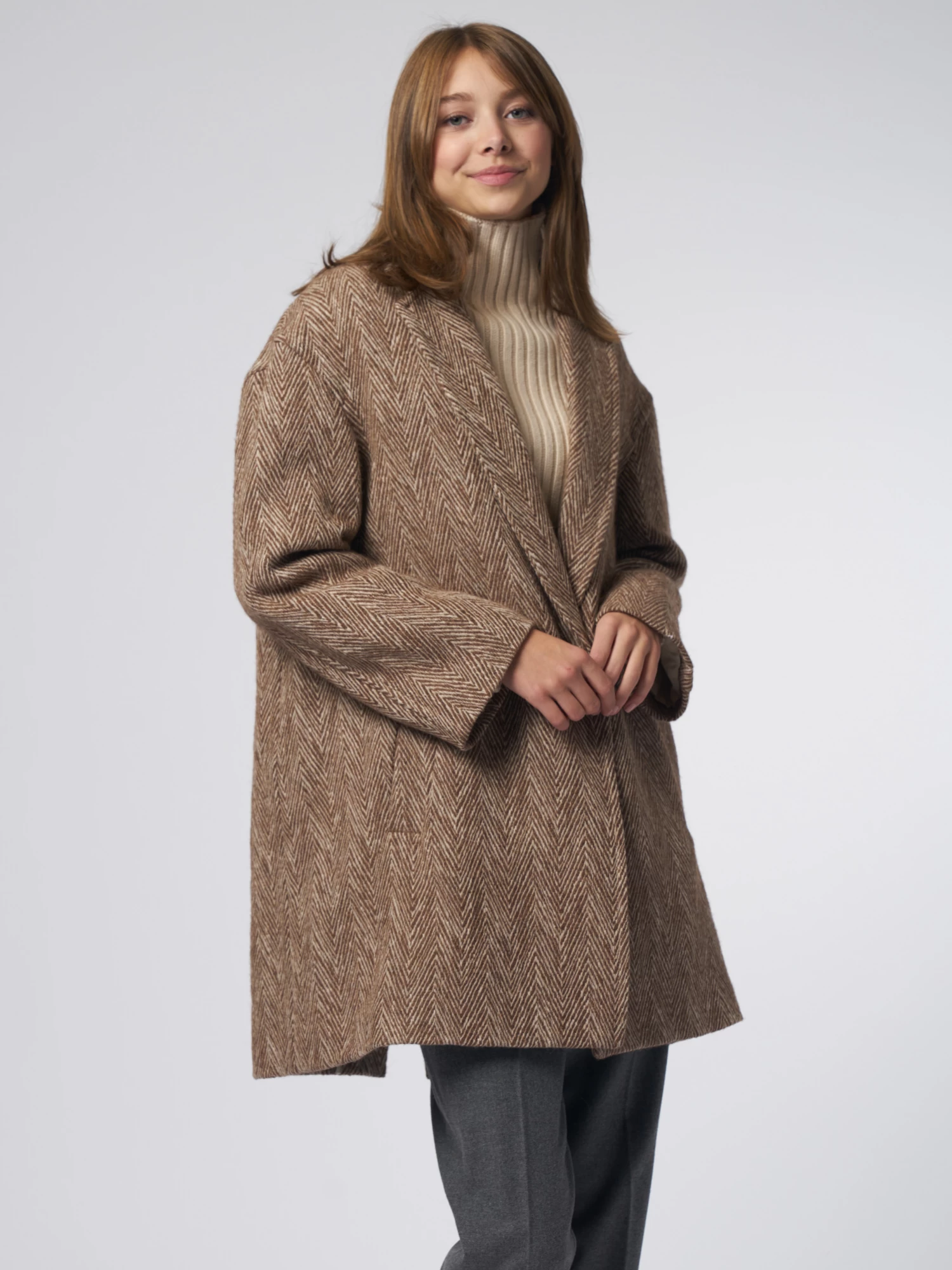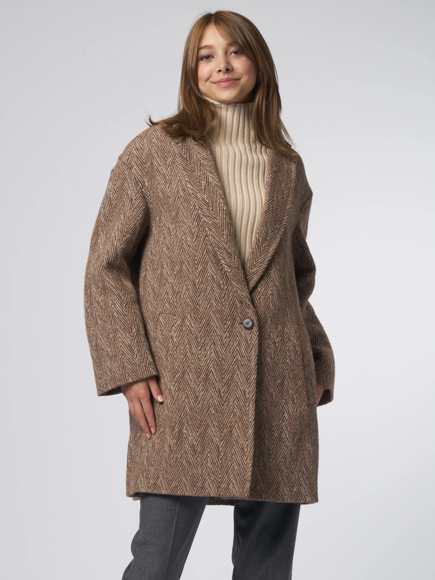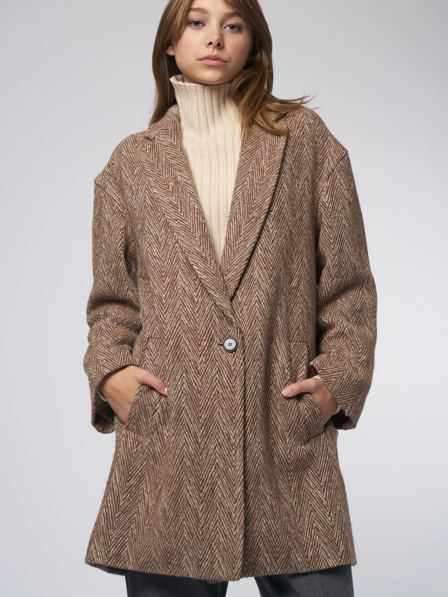 Wool and cotton, herringbone pattern coat features a collar with lapels, dropped buttoning with one button, side pockets, slightly dropped shoulders, large central rear split.