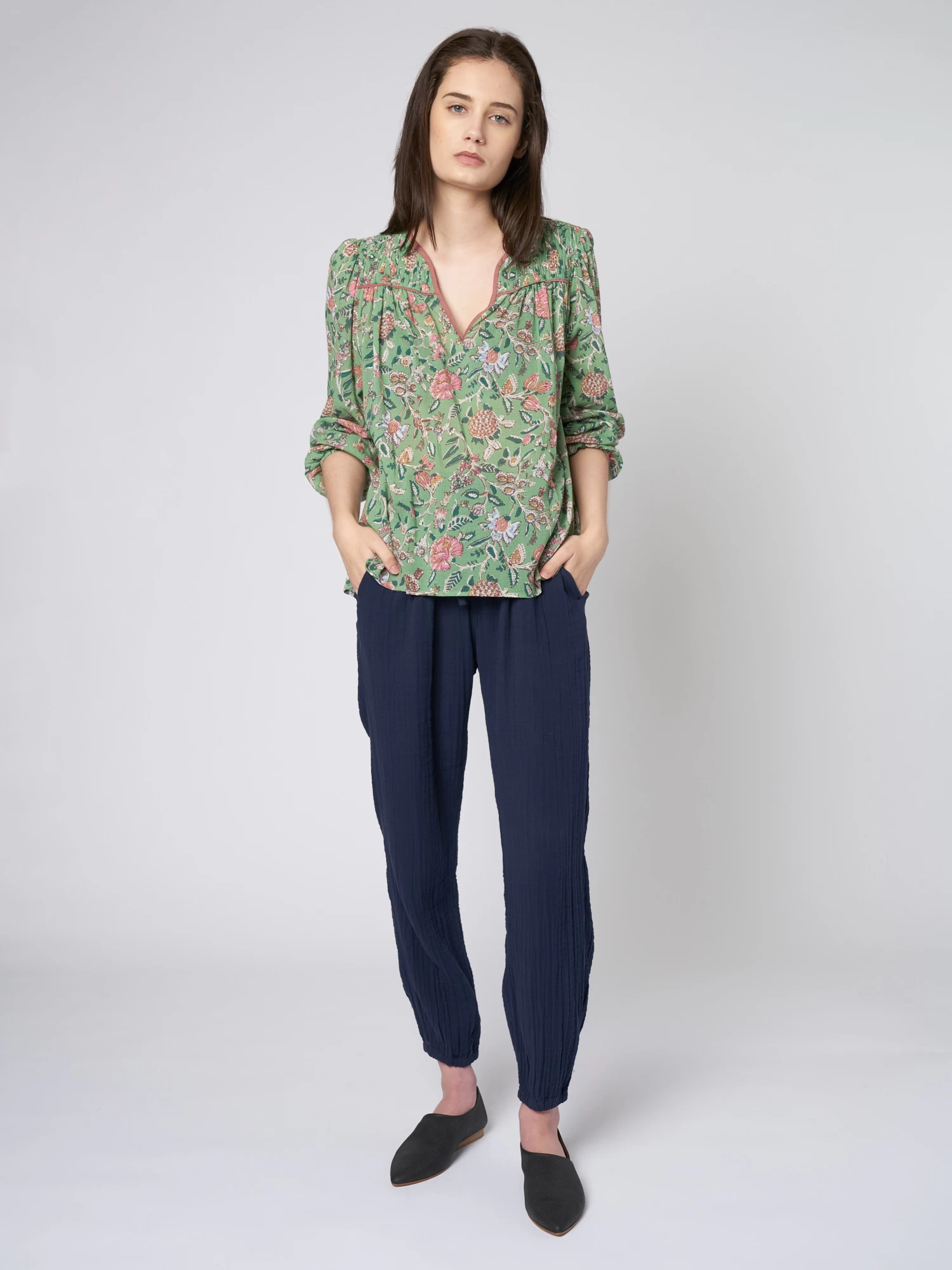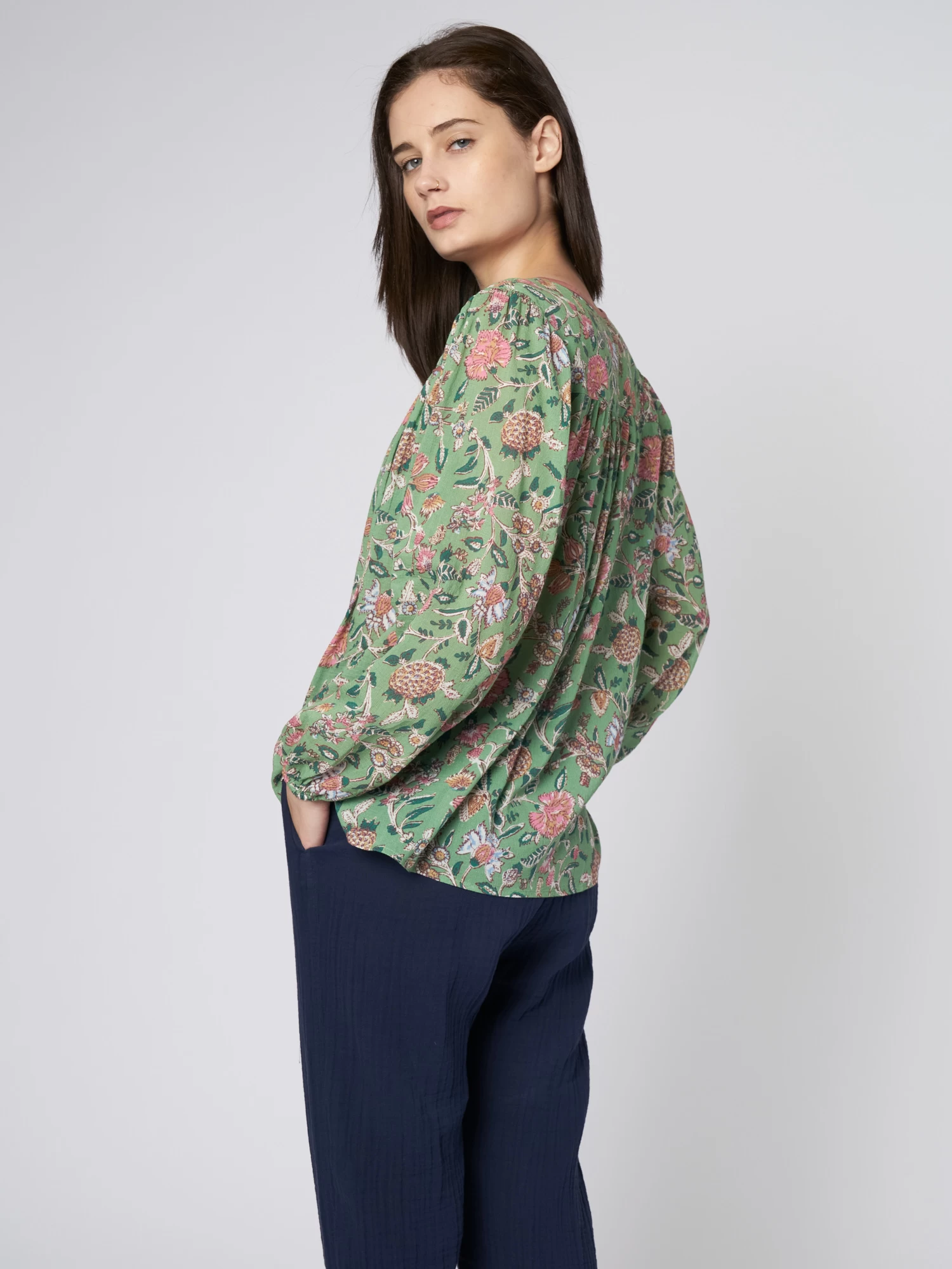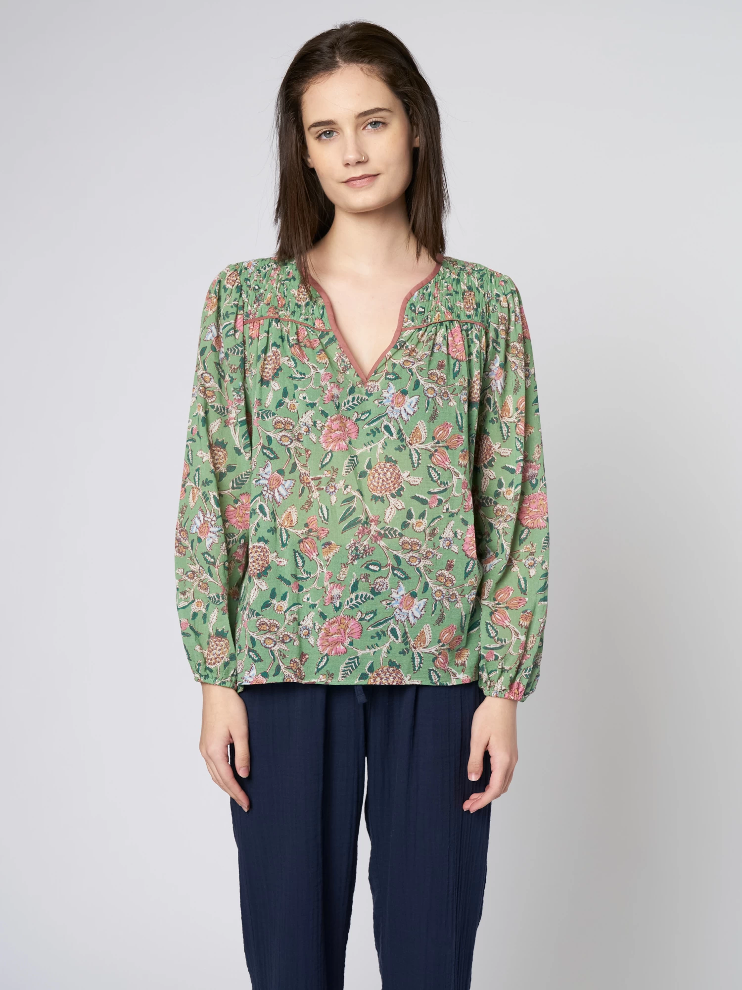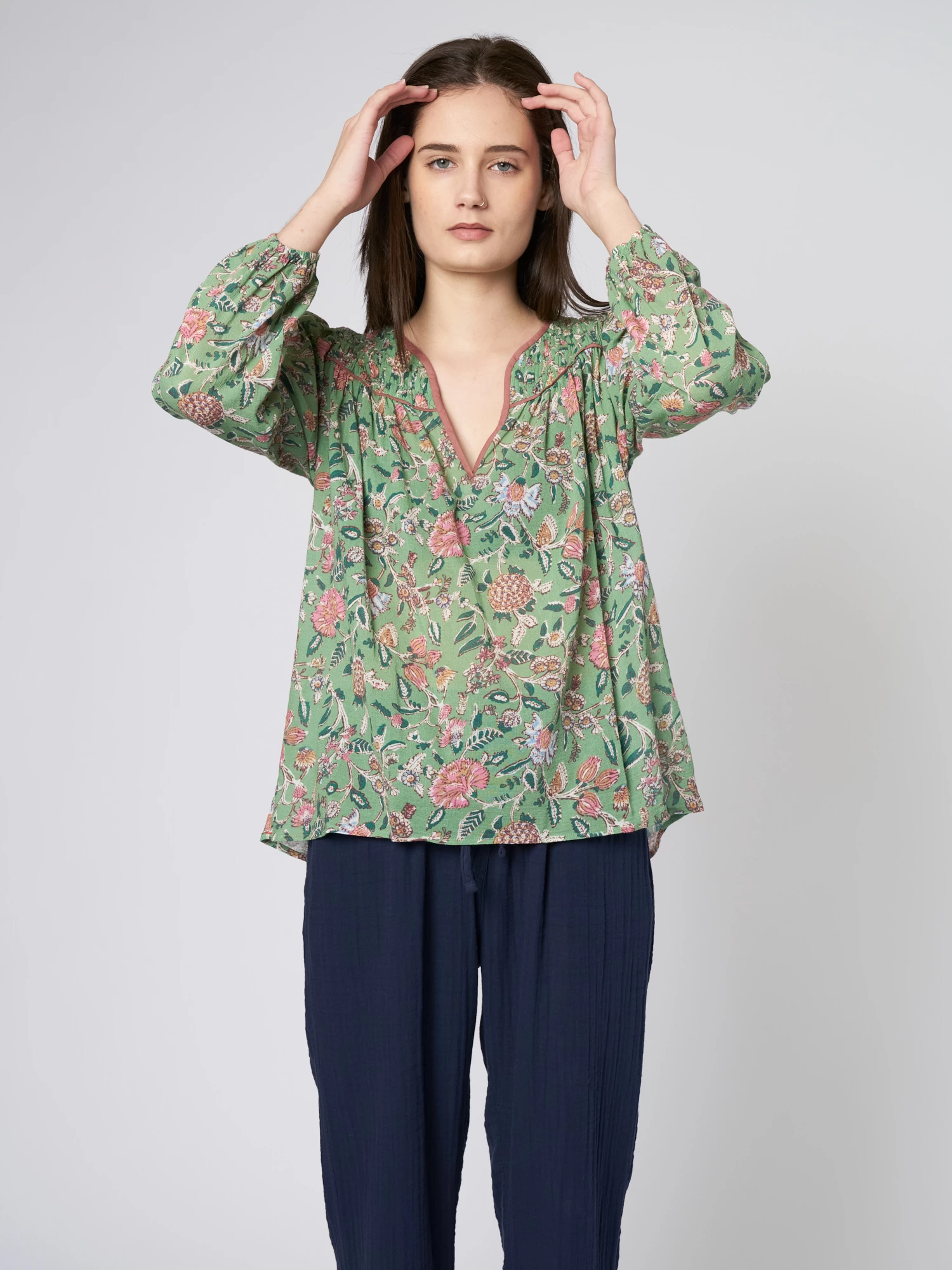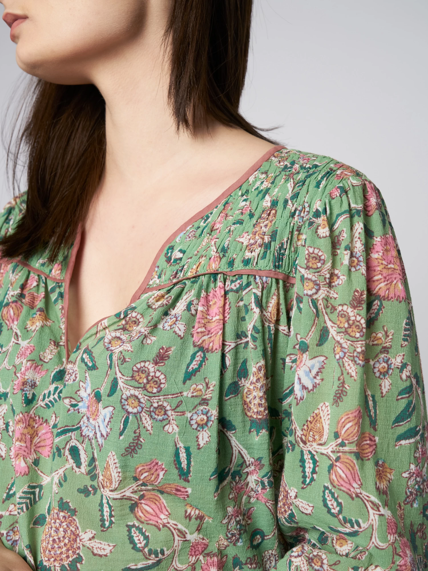 V-neck popover in sun-bleached floral Le Cactus Print has contrast piping, soft elastic cuffs, a high low hem, and a shirred stitched yoke.
