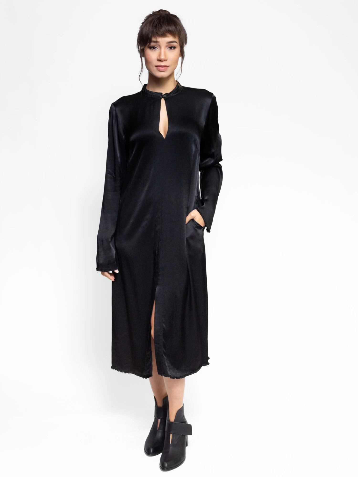 A long sleeve dress with a single button collar features a split front hem, side pockets, and a finished frayed edges in black crepe back satin.