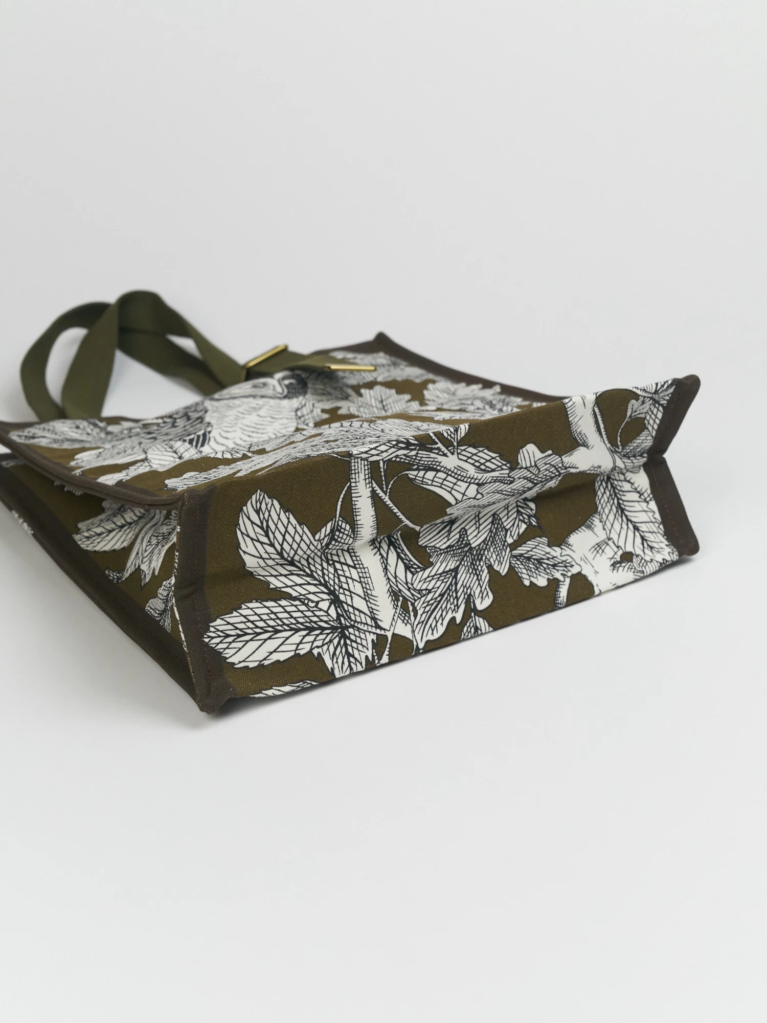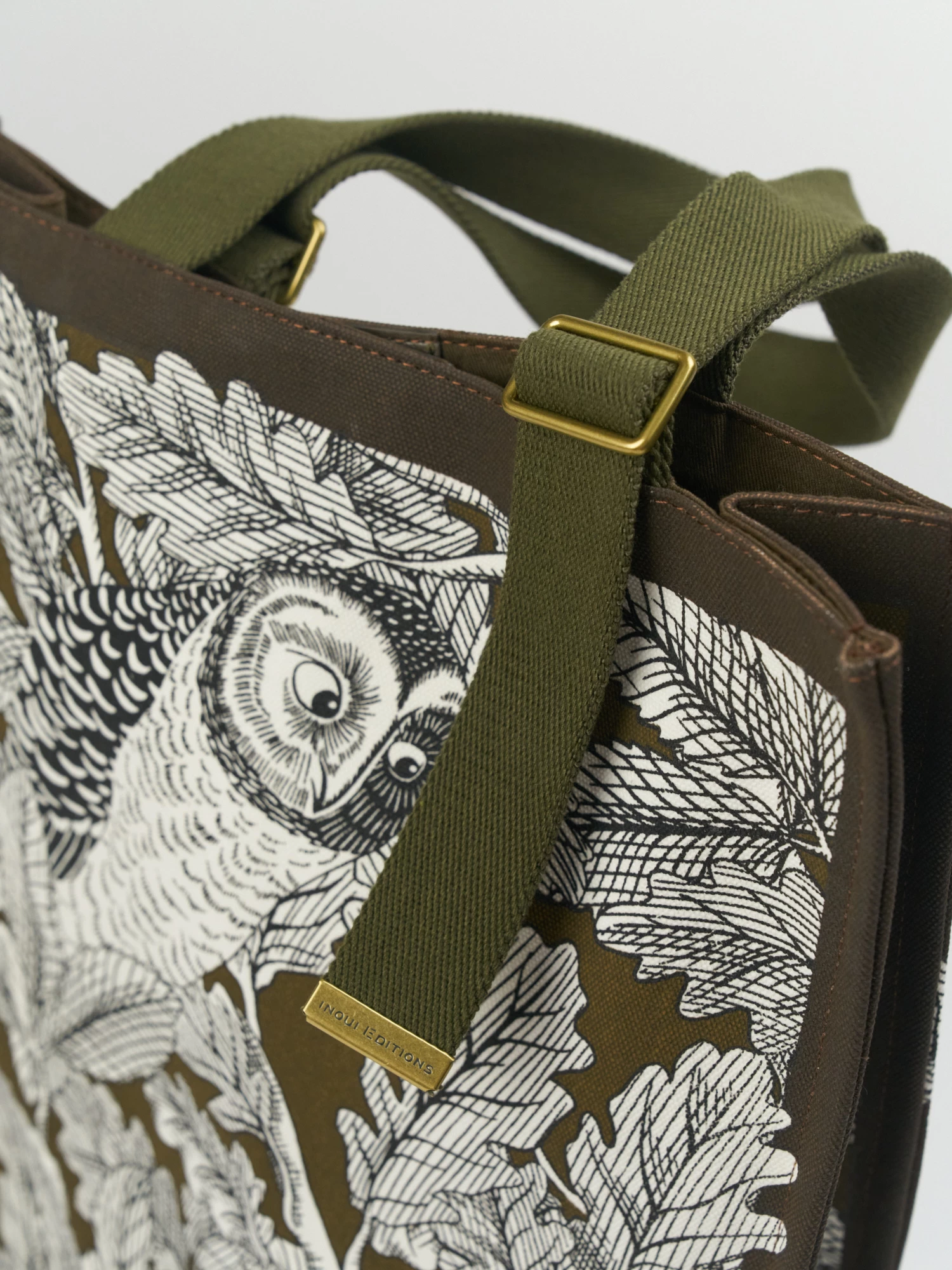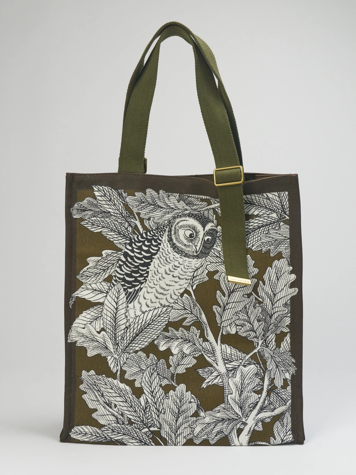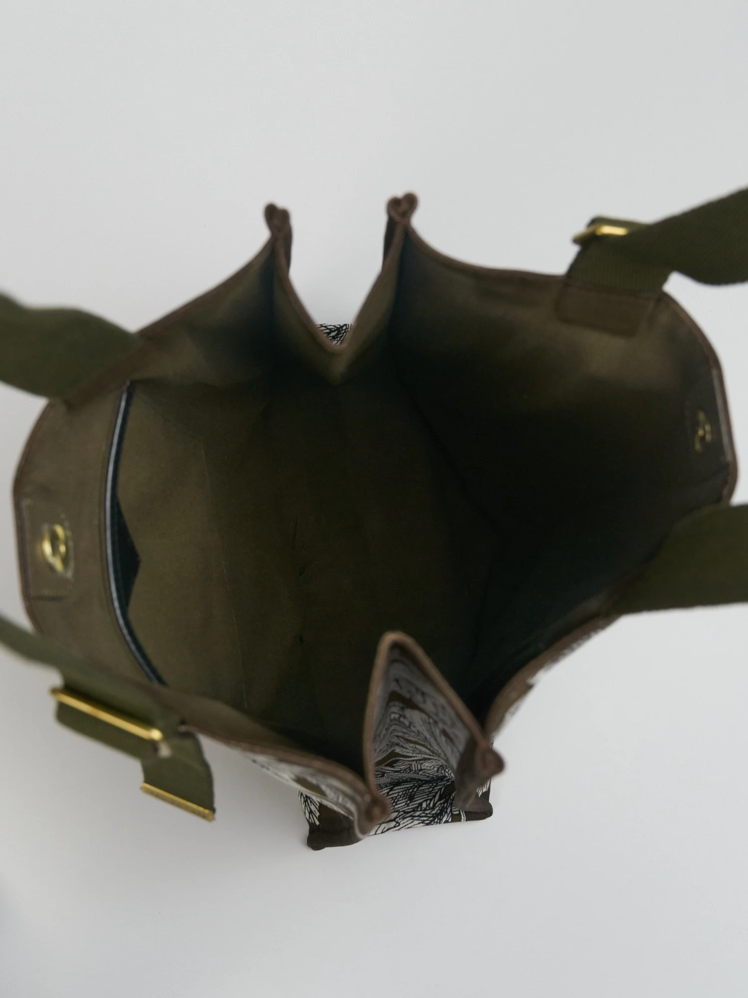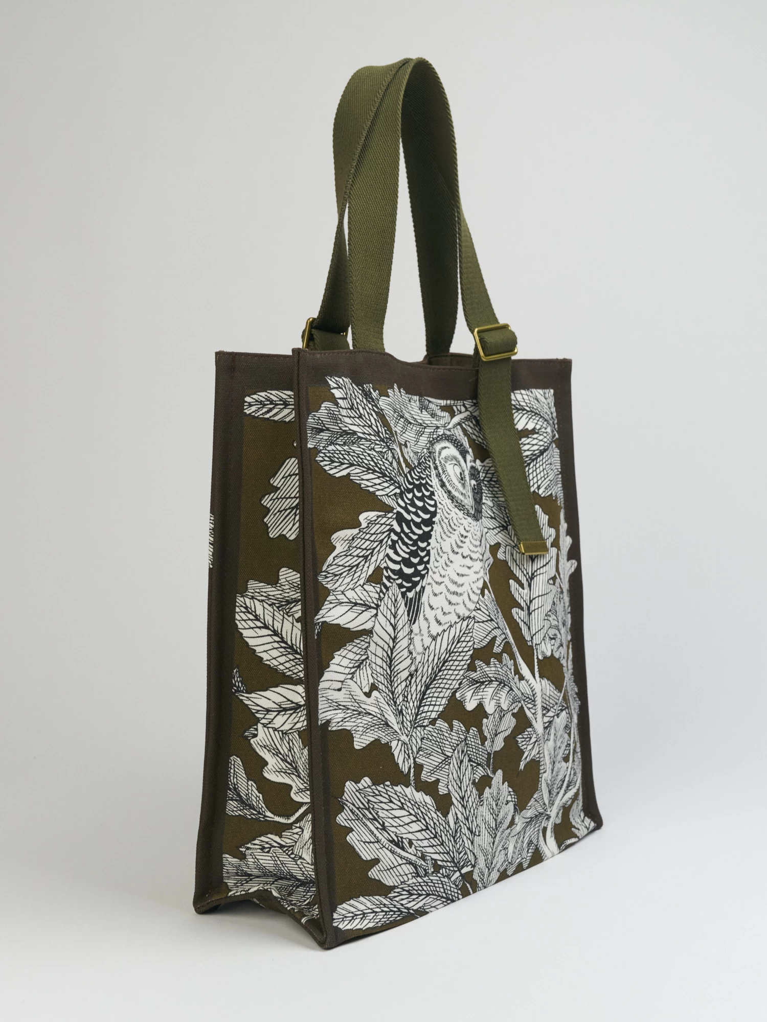 A cotton canvas tote bag, also features polyester handles, magnetic closure, and an inside pocket.