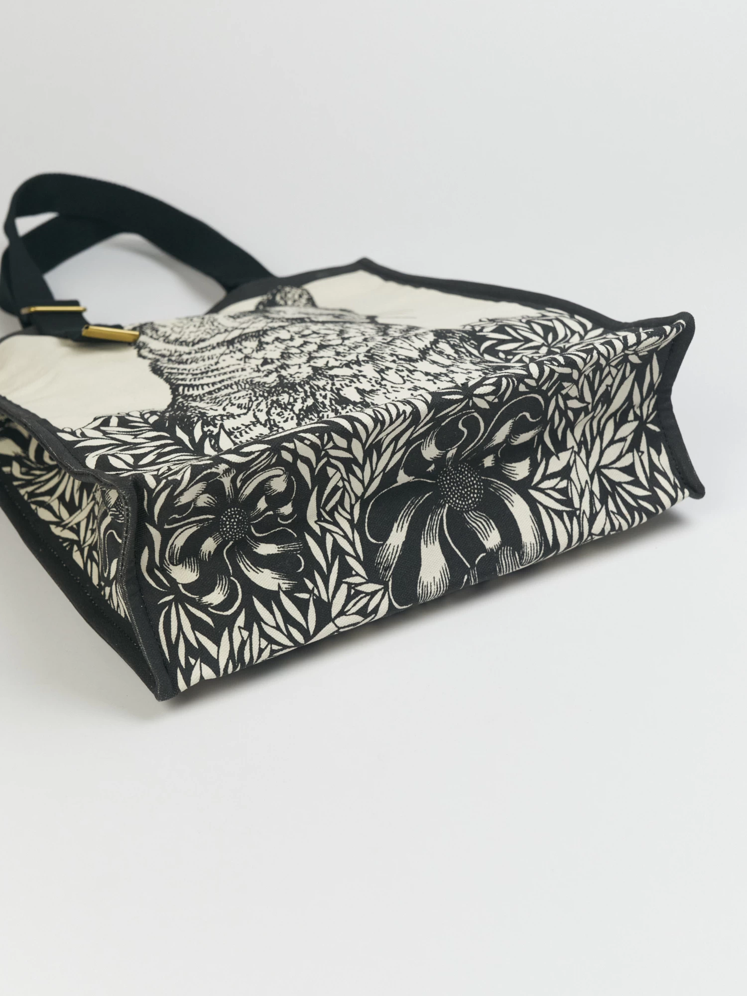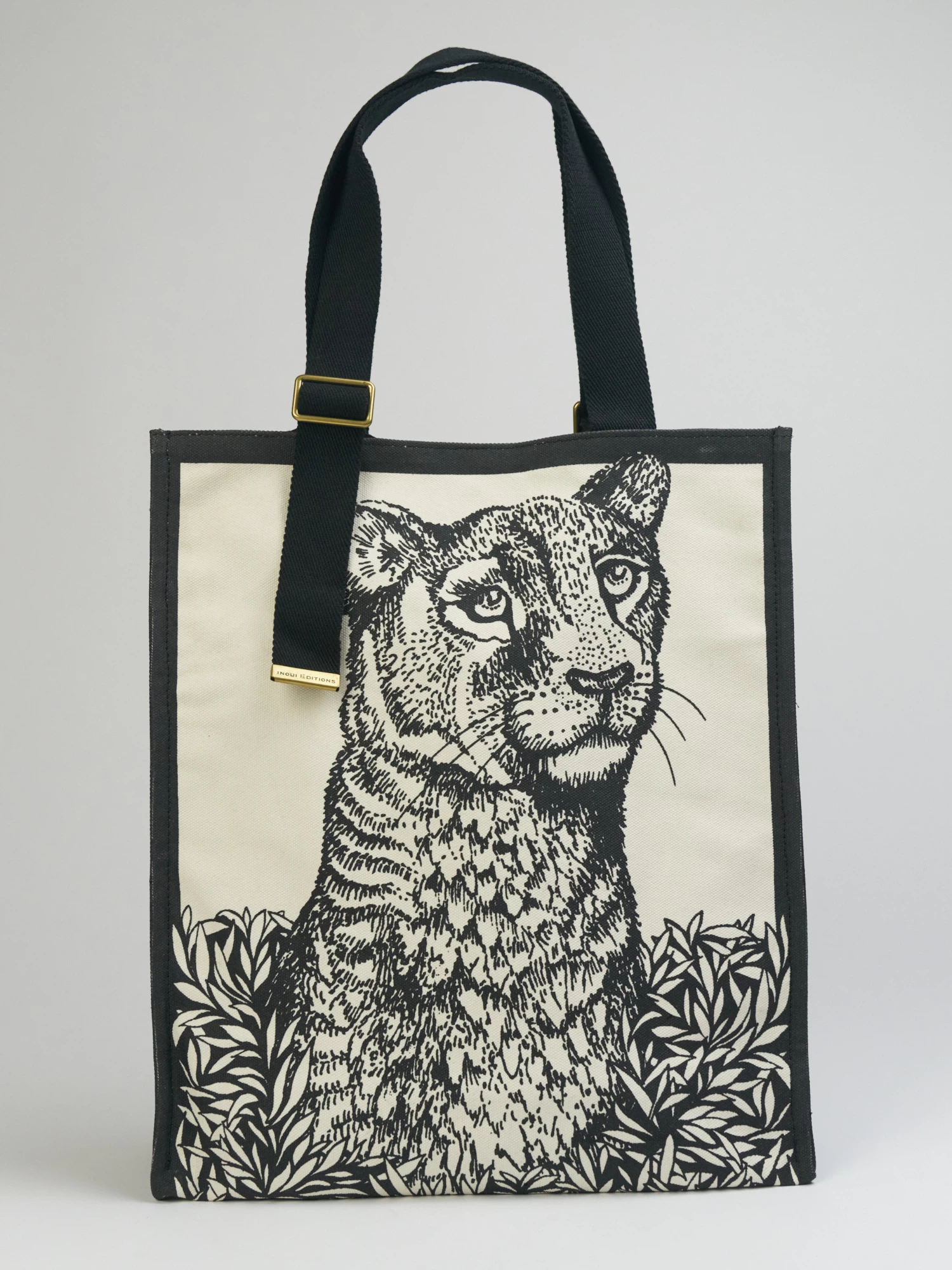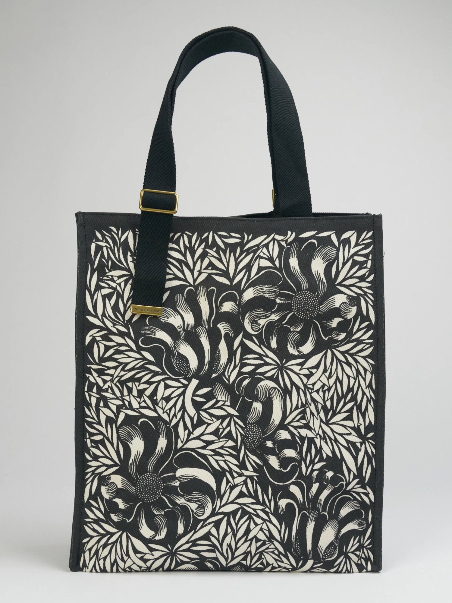 A cotton canvas tote bag, also features polyester handles, magnetic closure, and an inside pocket.