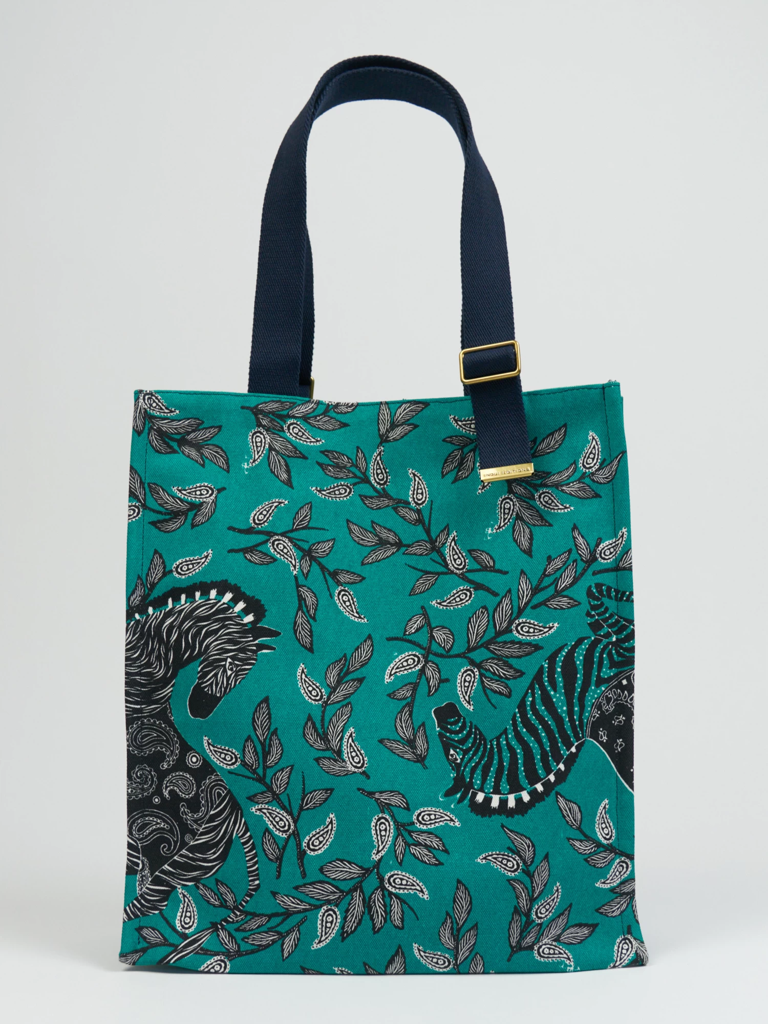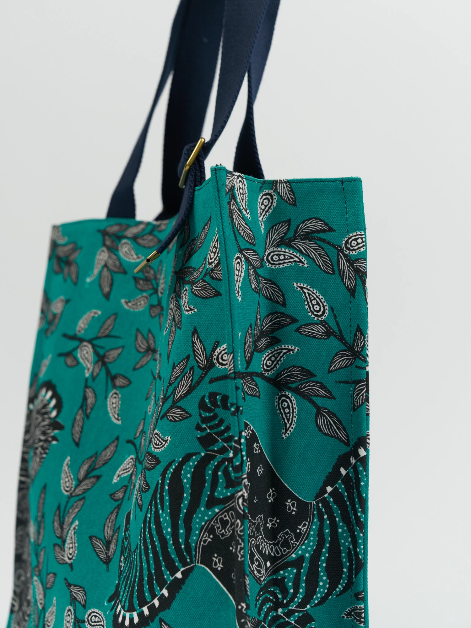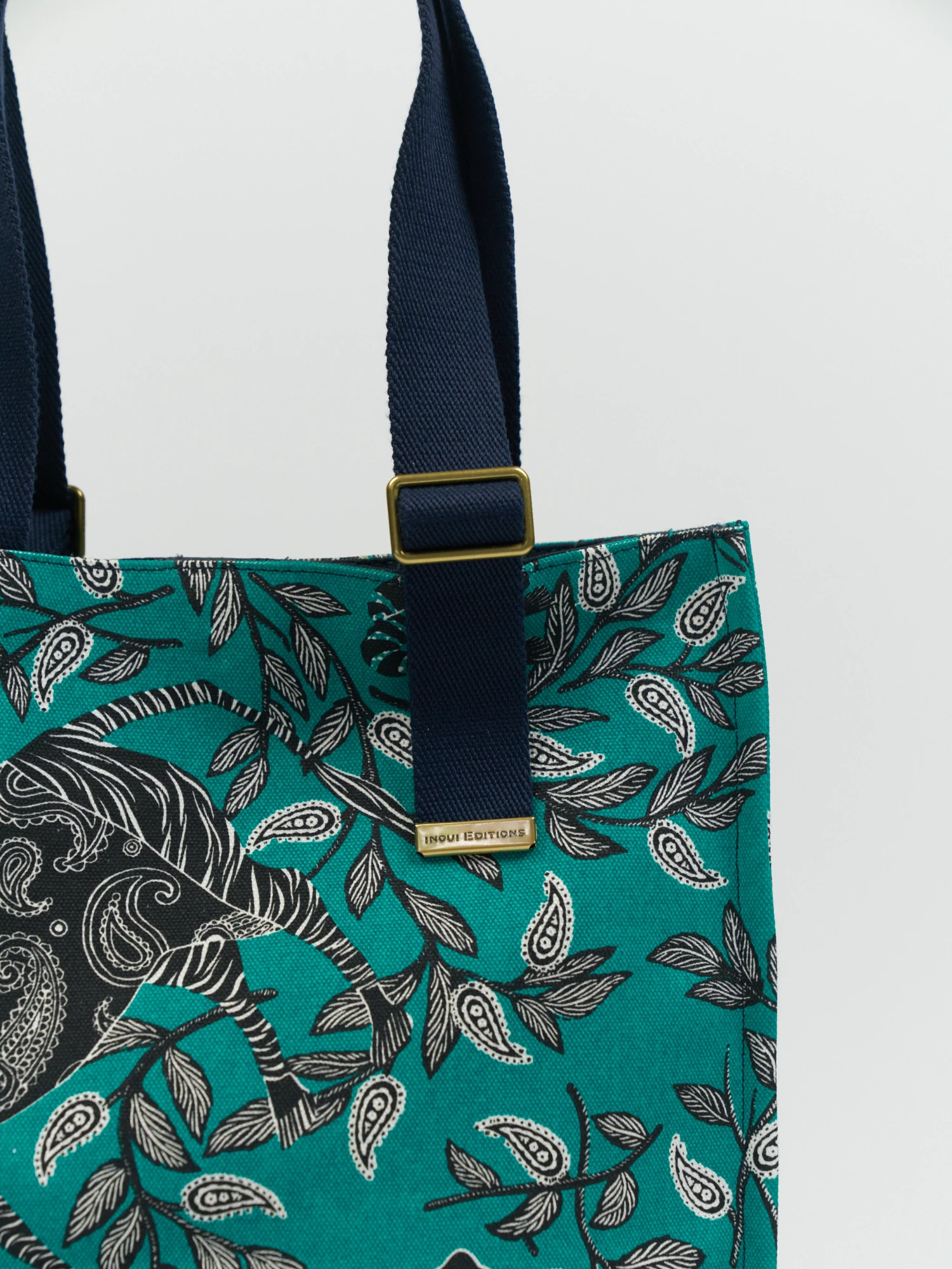 A cotton canvas tote bag, also features polyester handles, magnetic closure, and an inside pocket.