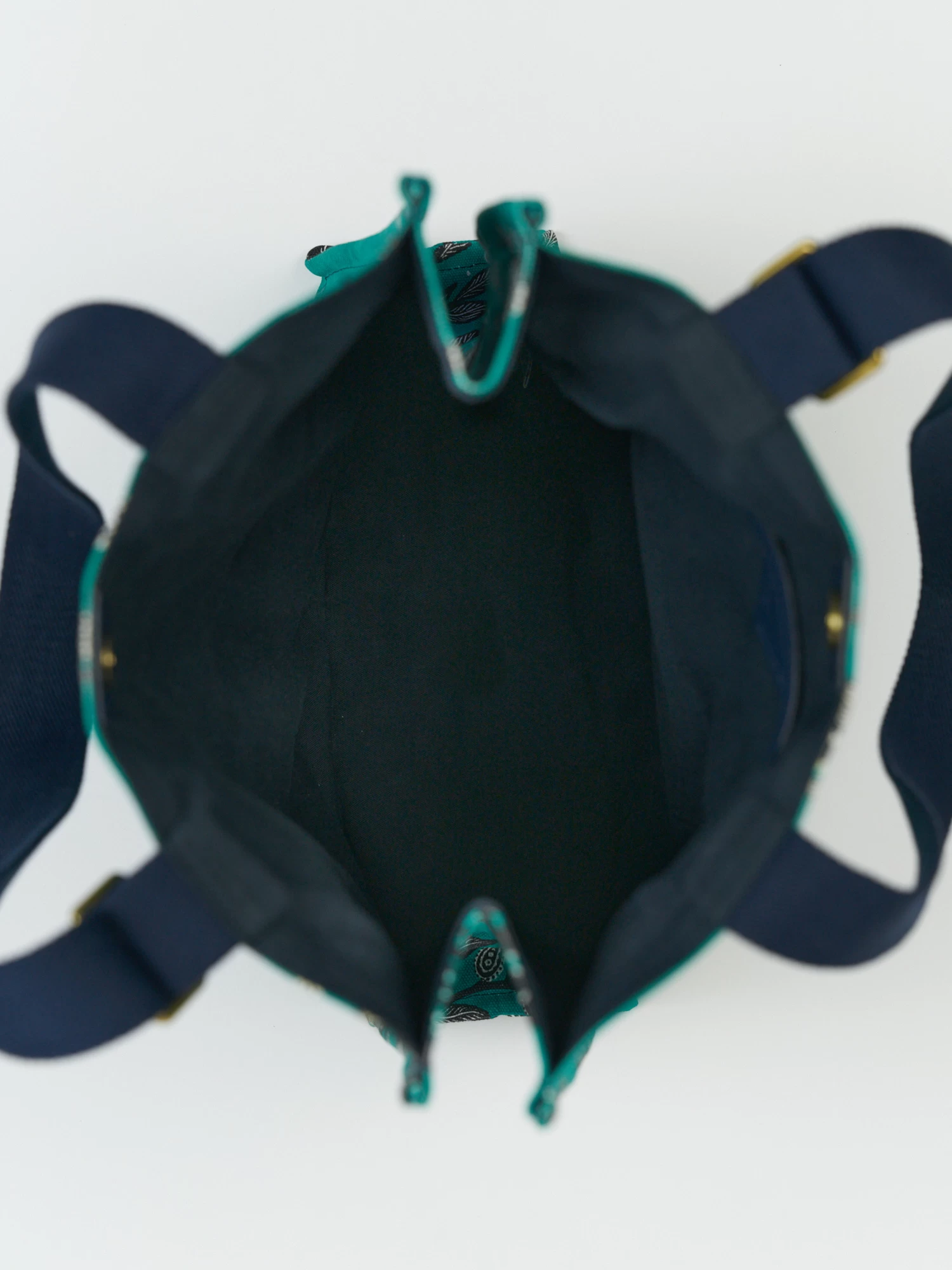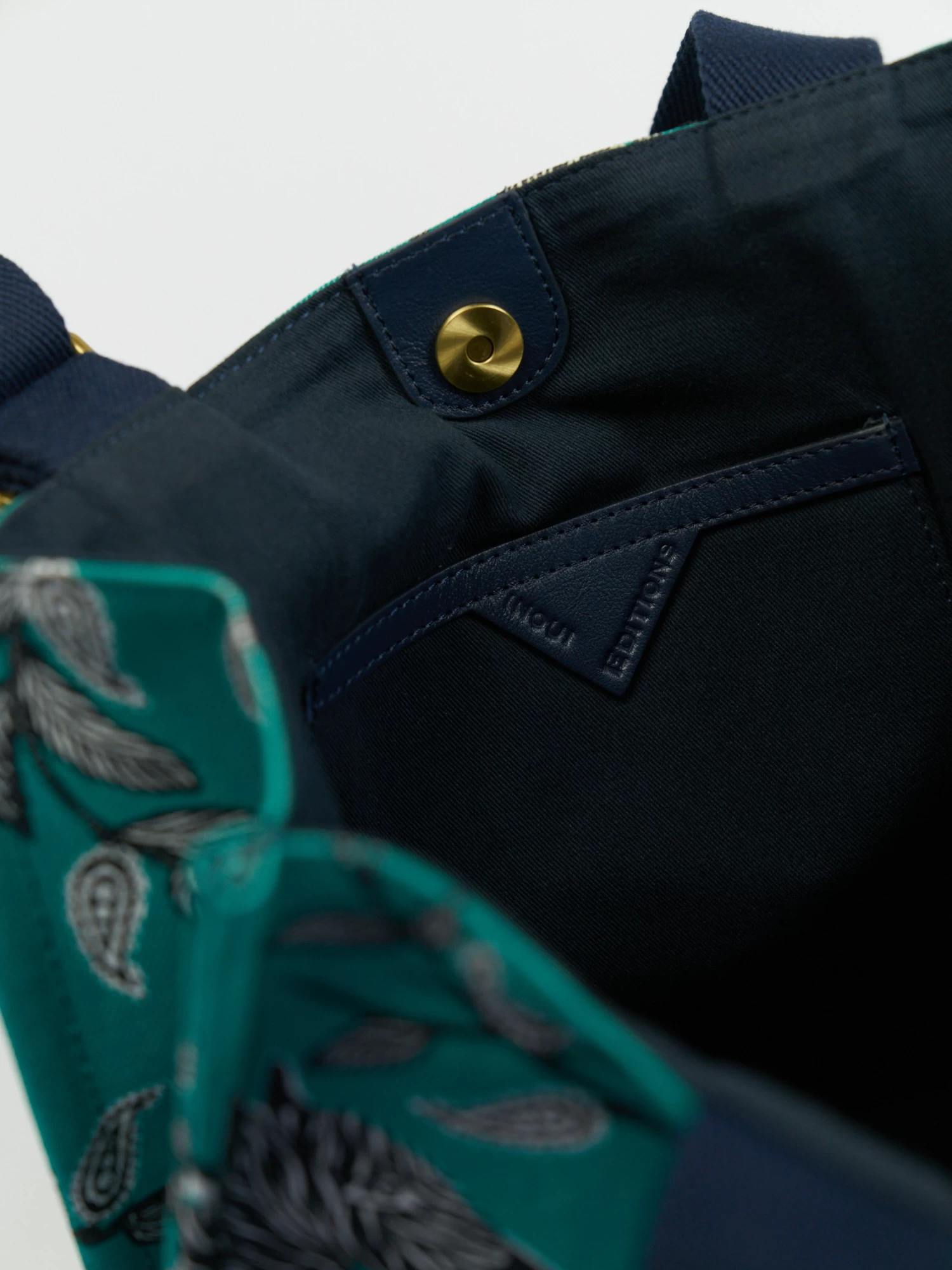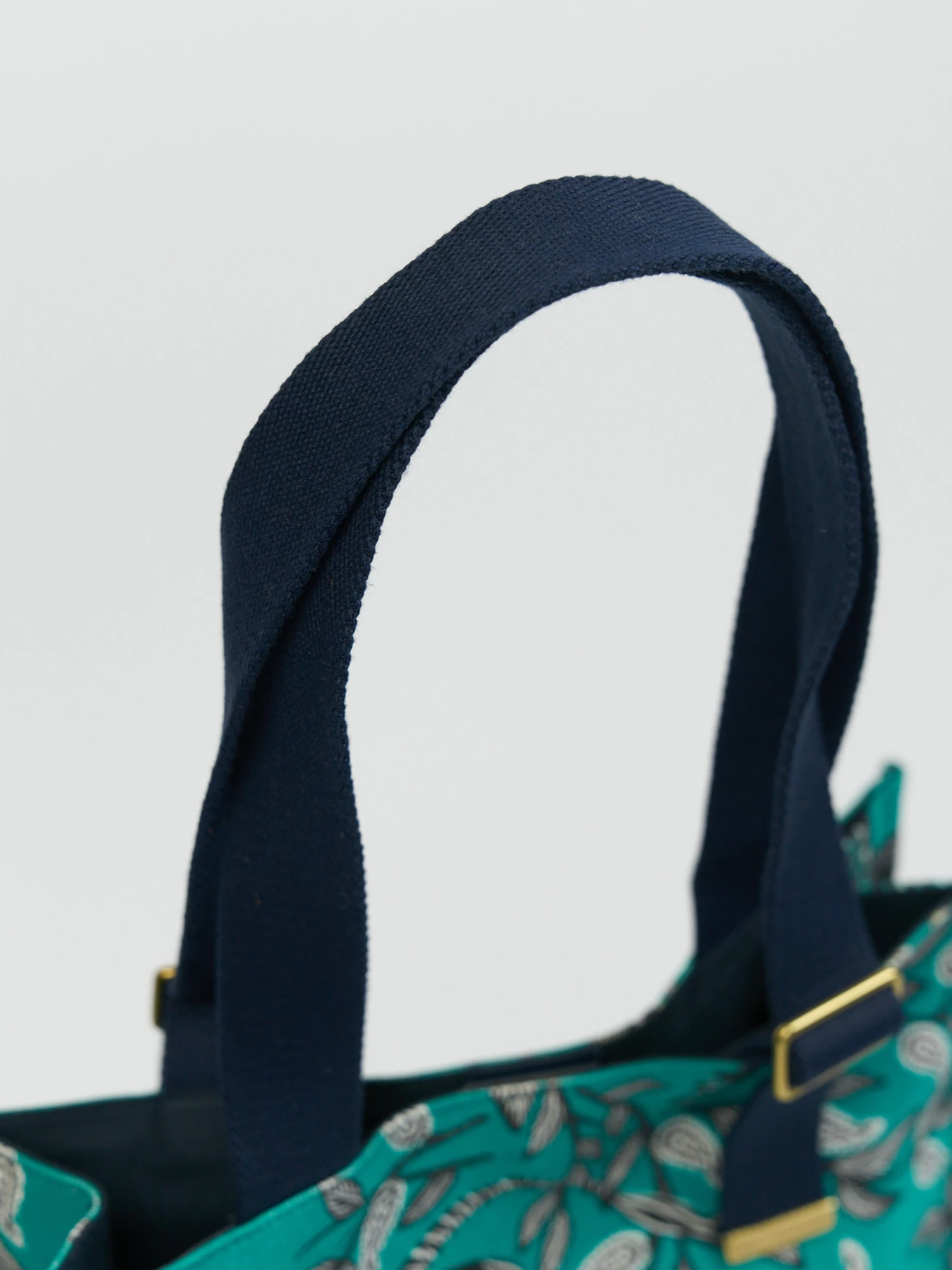A cotton canvas tote bag, also features polyester handles, magnetic closure, and an inside pocket.