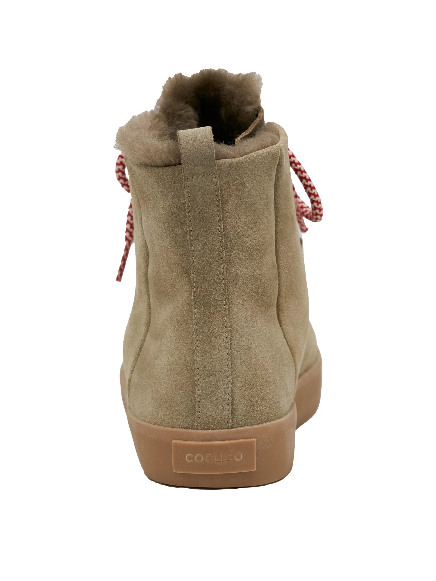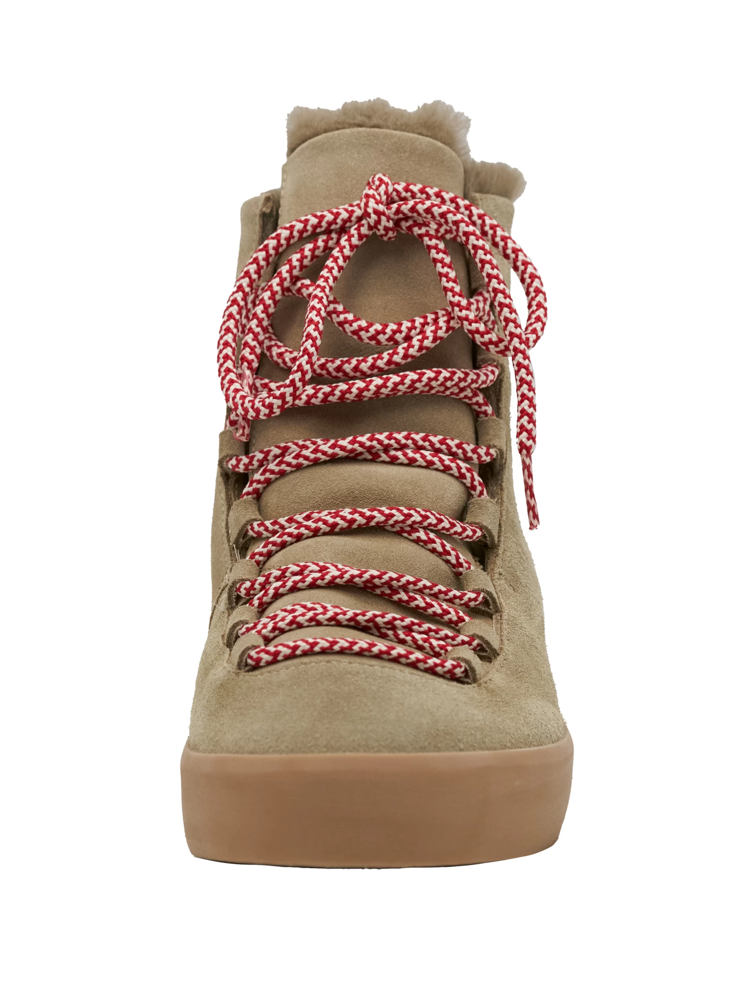 The Sugar Apres Ski boot has candy-stripe laces, water-resistant split suede, shearling lining, and flexible vulcanized rubber treaded sole.
