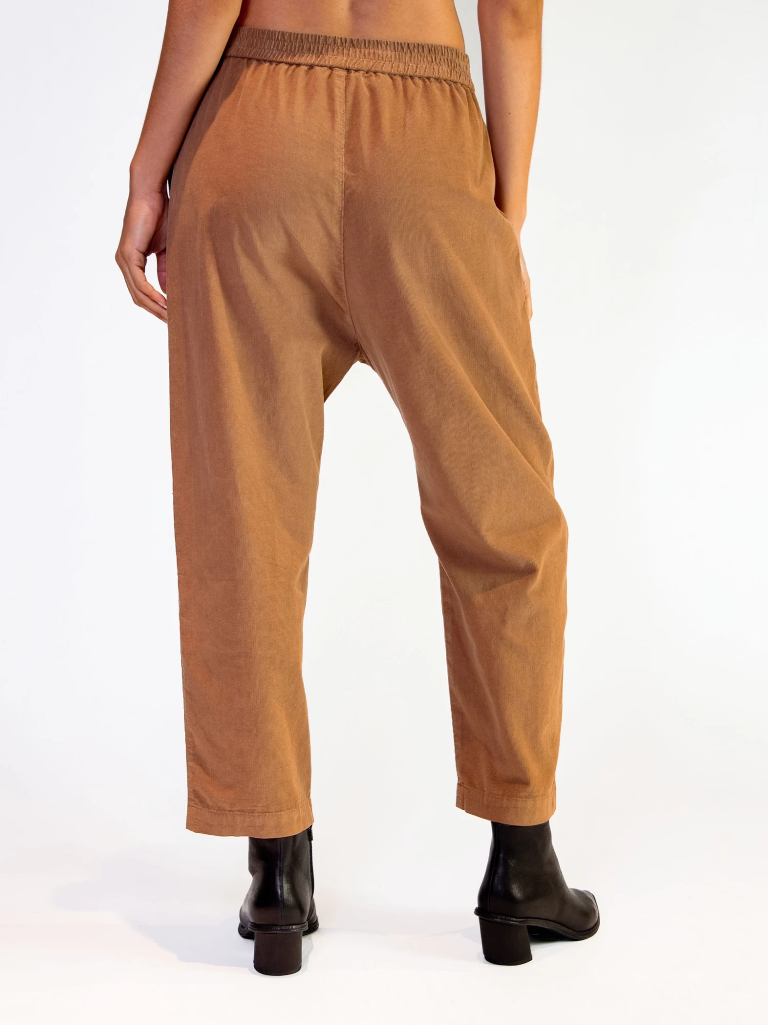 A light corduroy, drop crotch pant in camel. Includes an elastic waist for easy-fit and two front pockets.