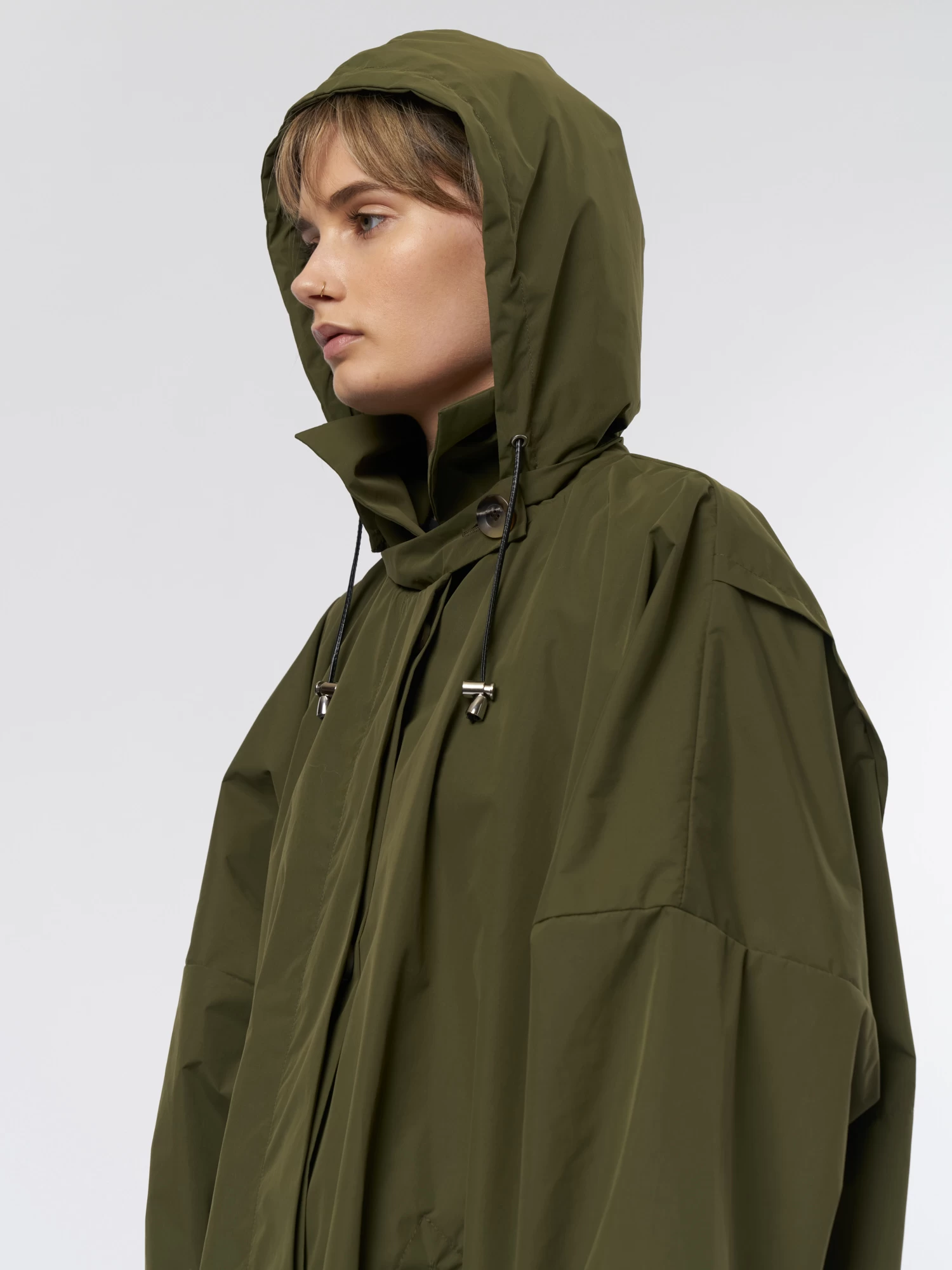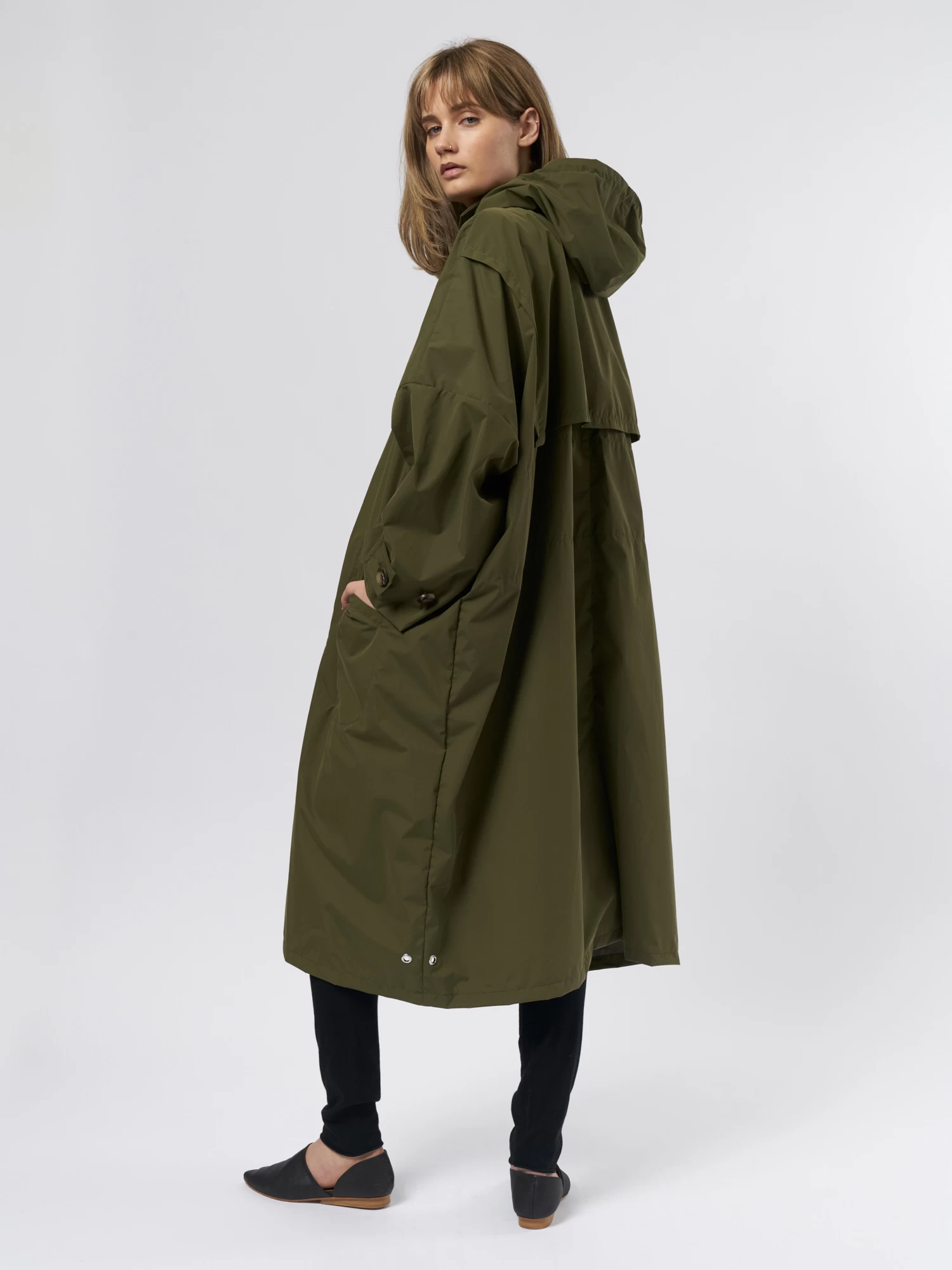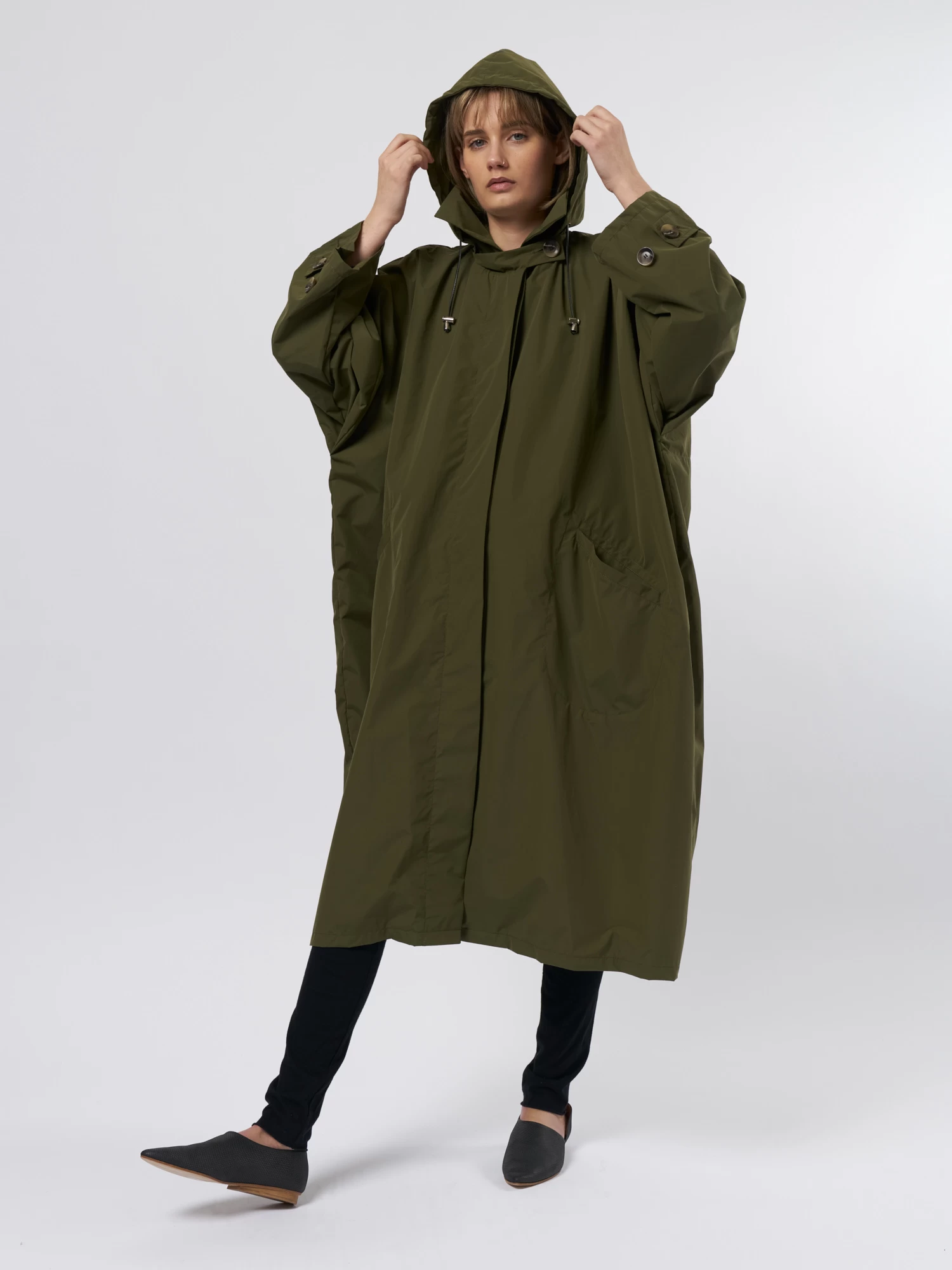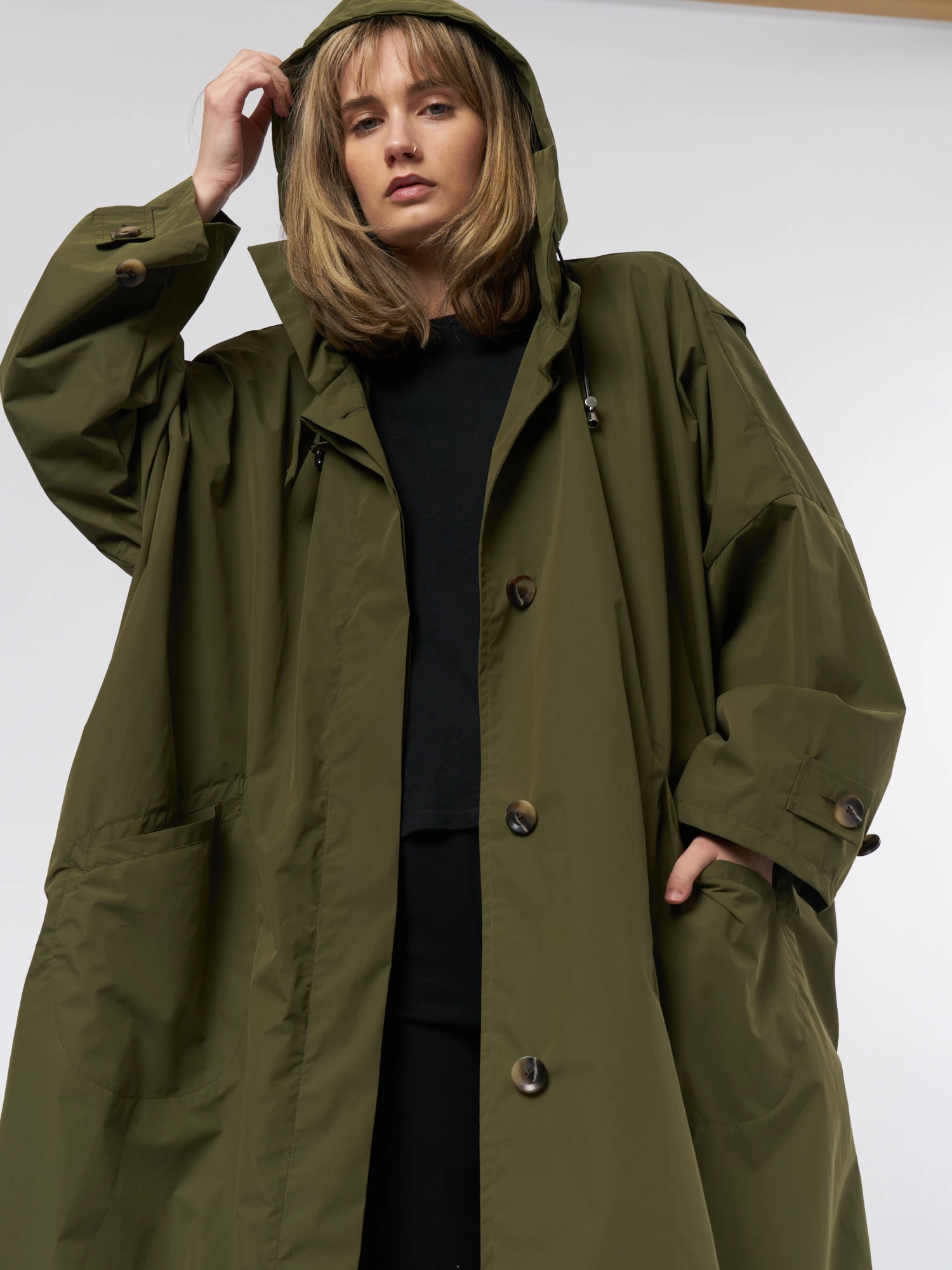 The lightweight oversize raincoat with a hidden buttoned front has a removable hood and two side pockets