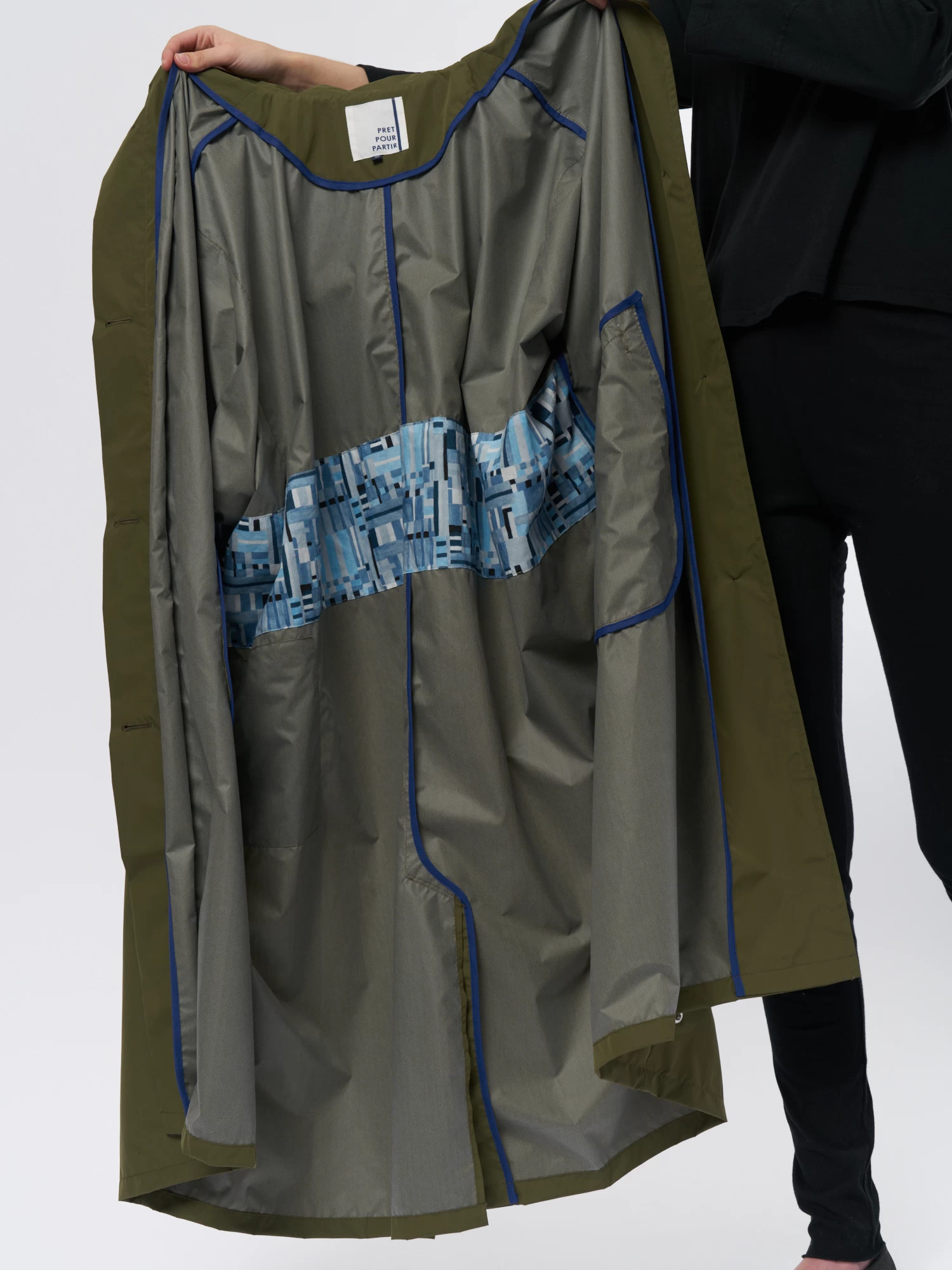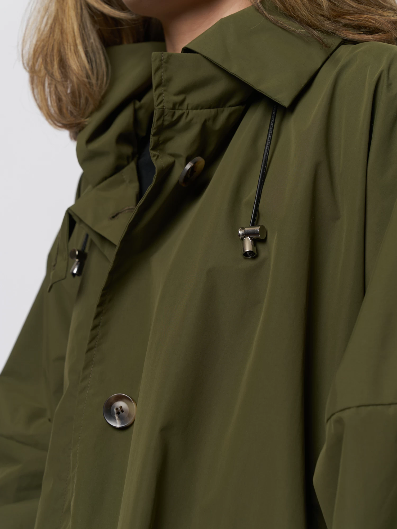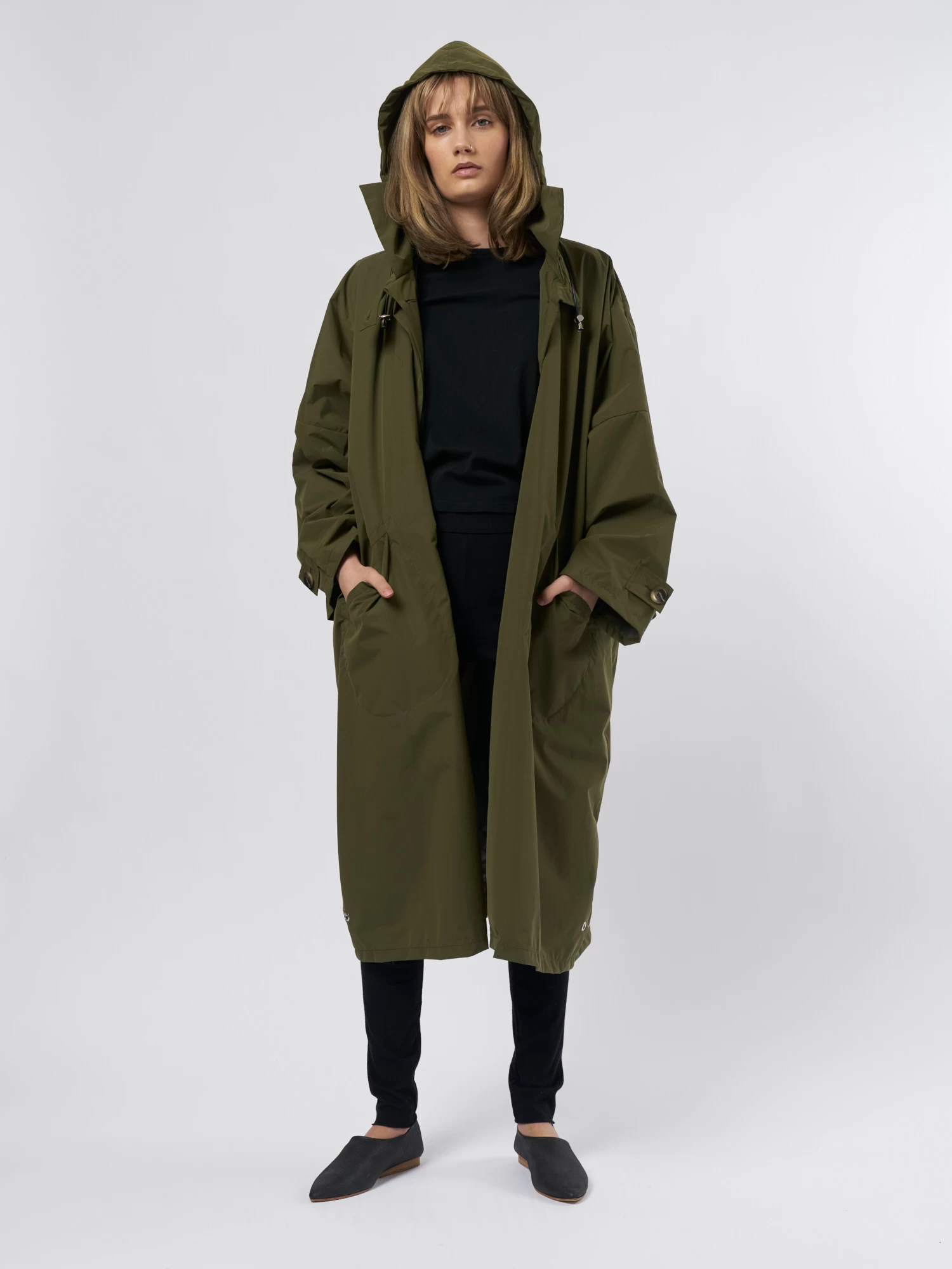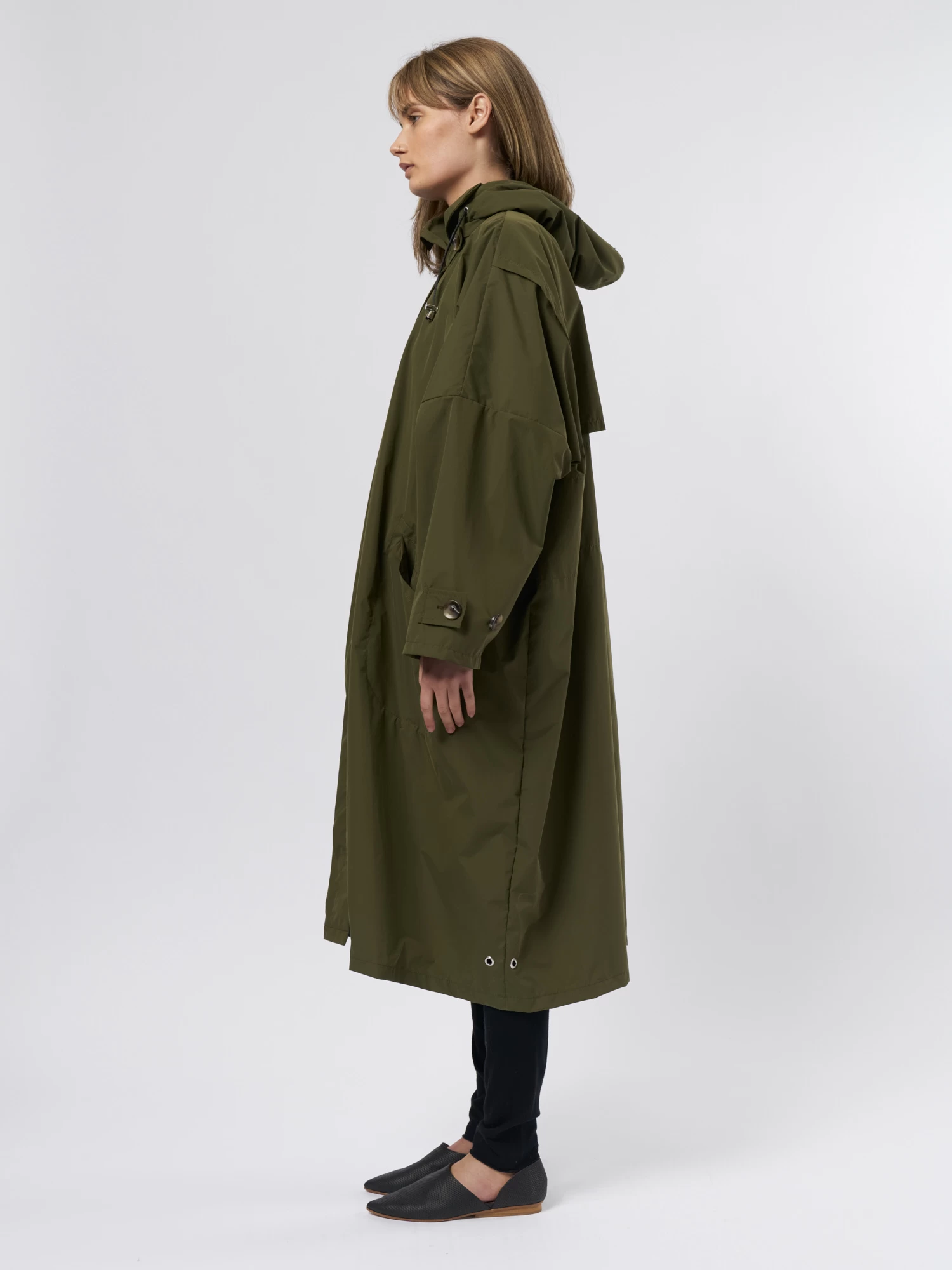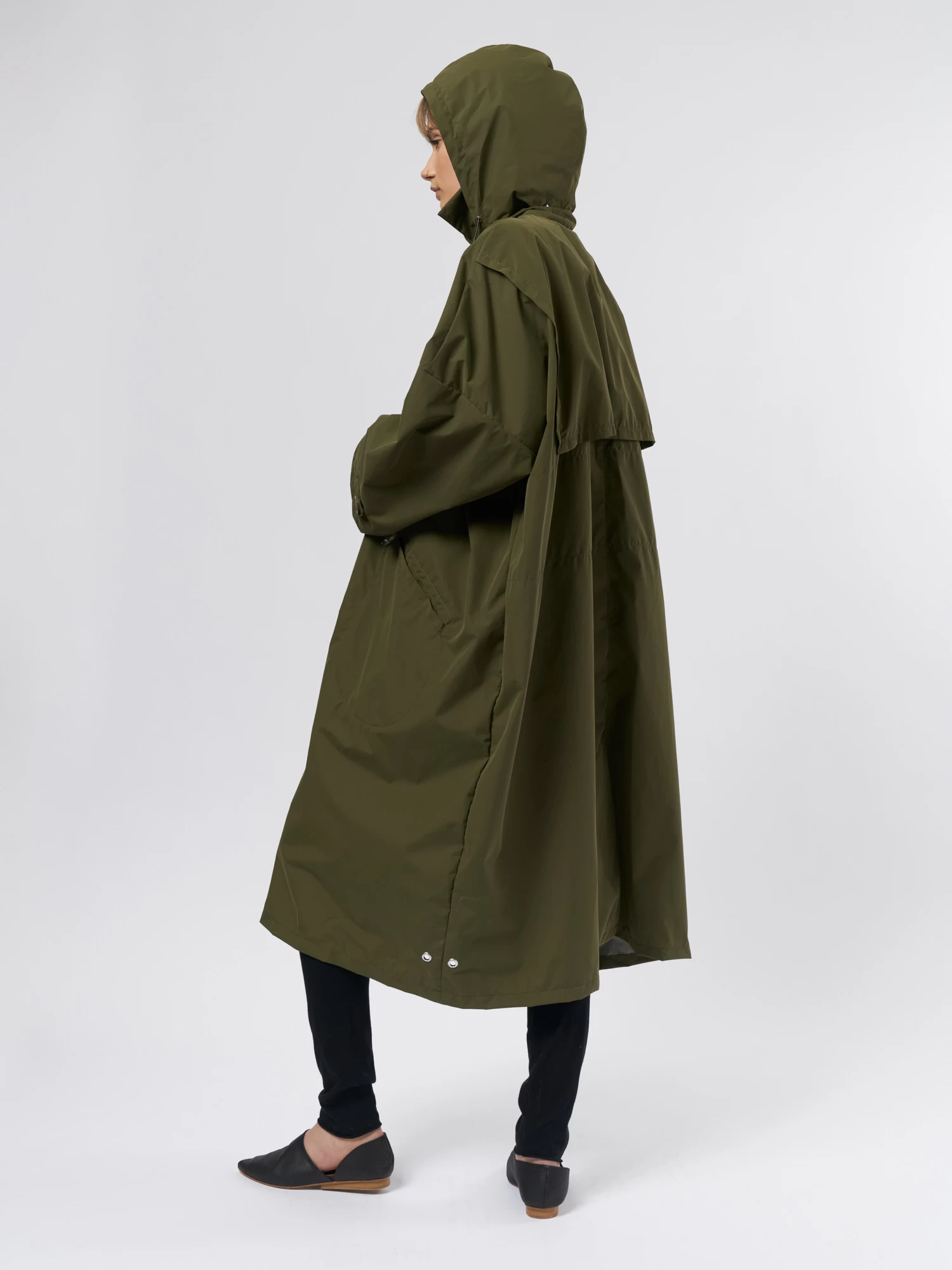 The lightweight oversize raincoat with a hidden buttoned front has a removable hood and two side pockets