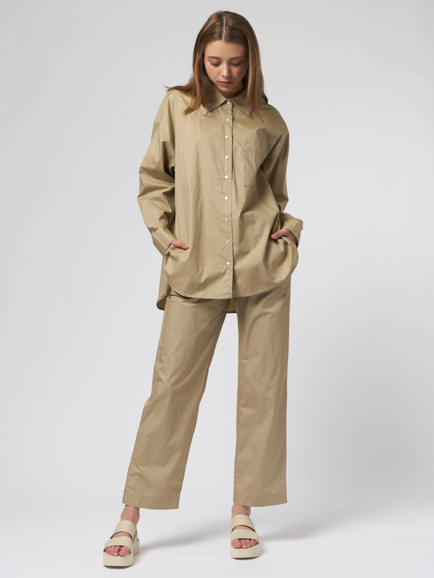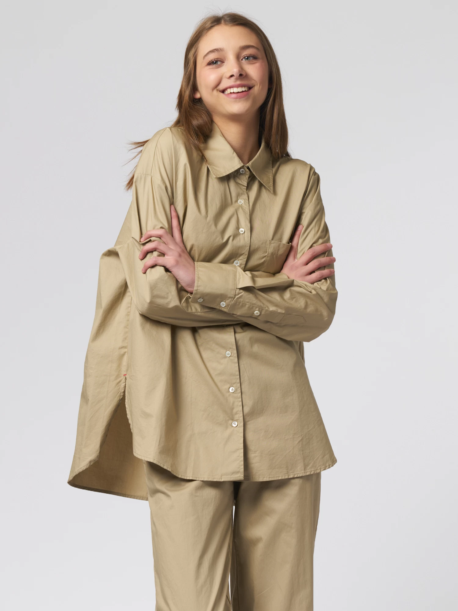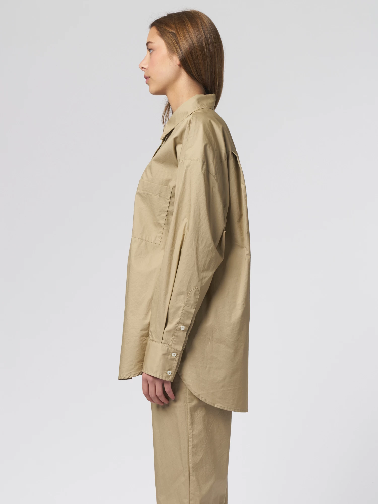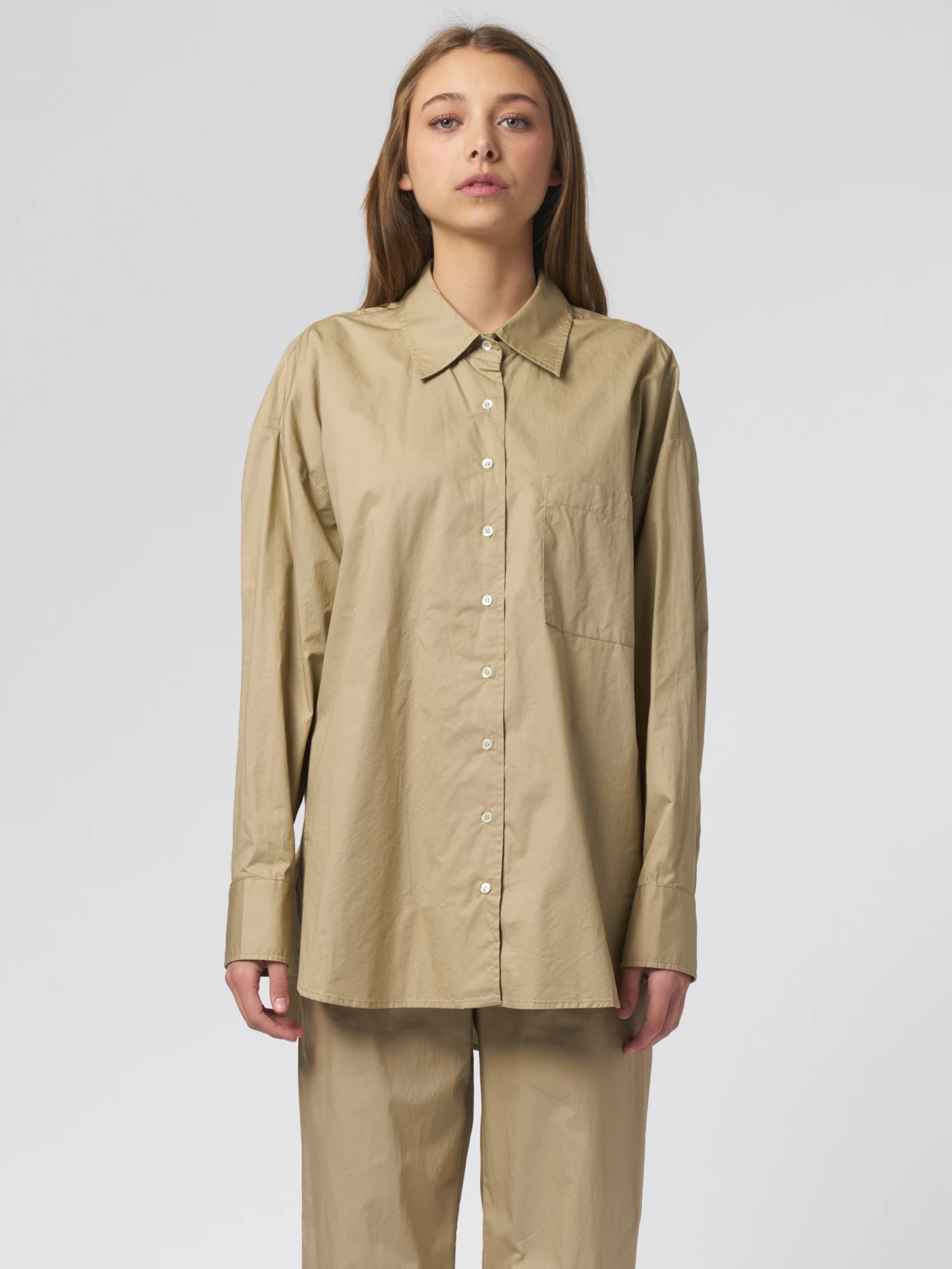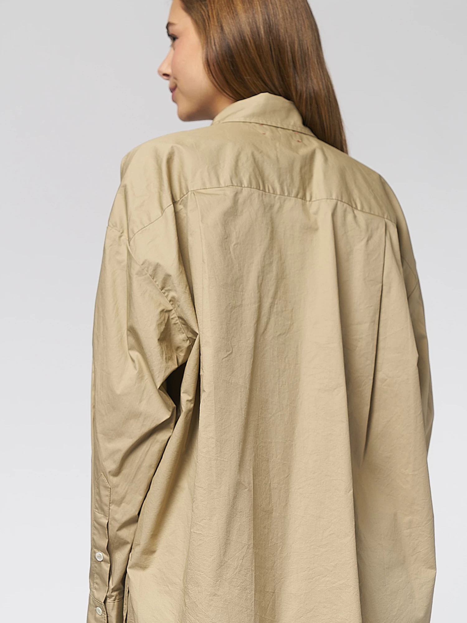Lightweight woven cotton poplin, an oversized button-down shirt with a left chest patch pocket.
