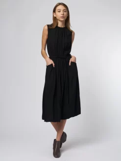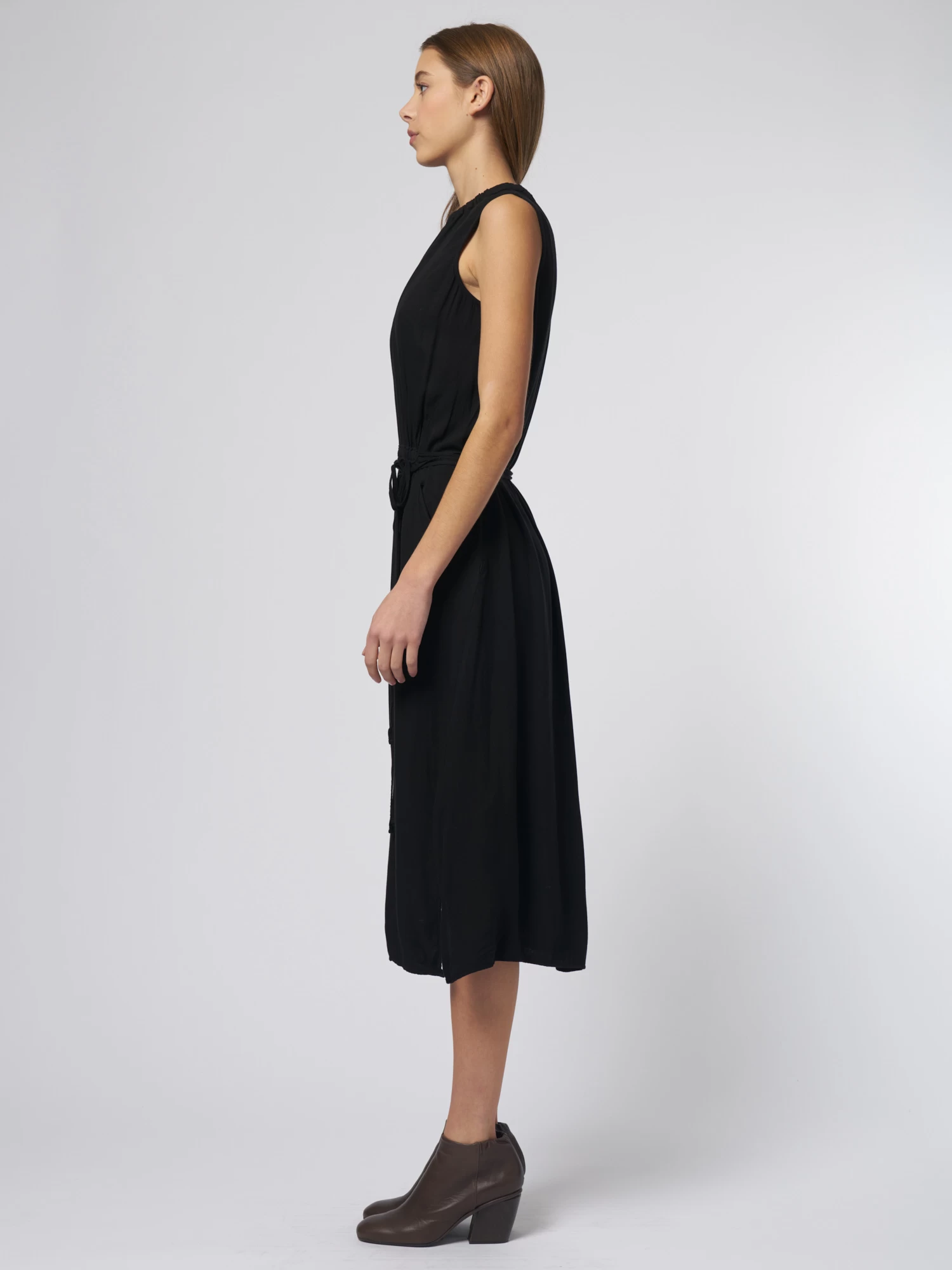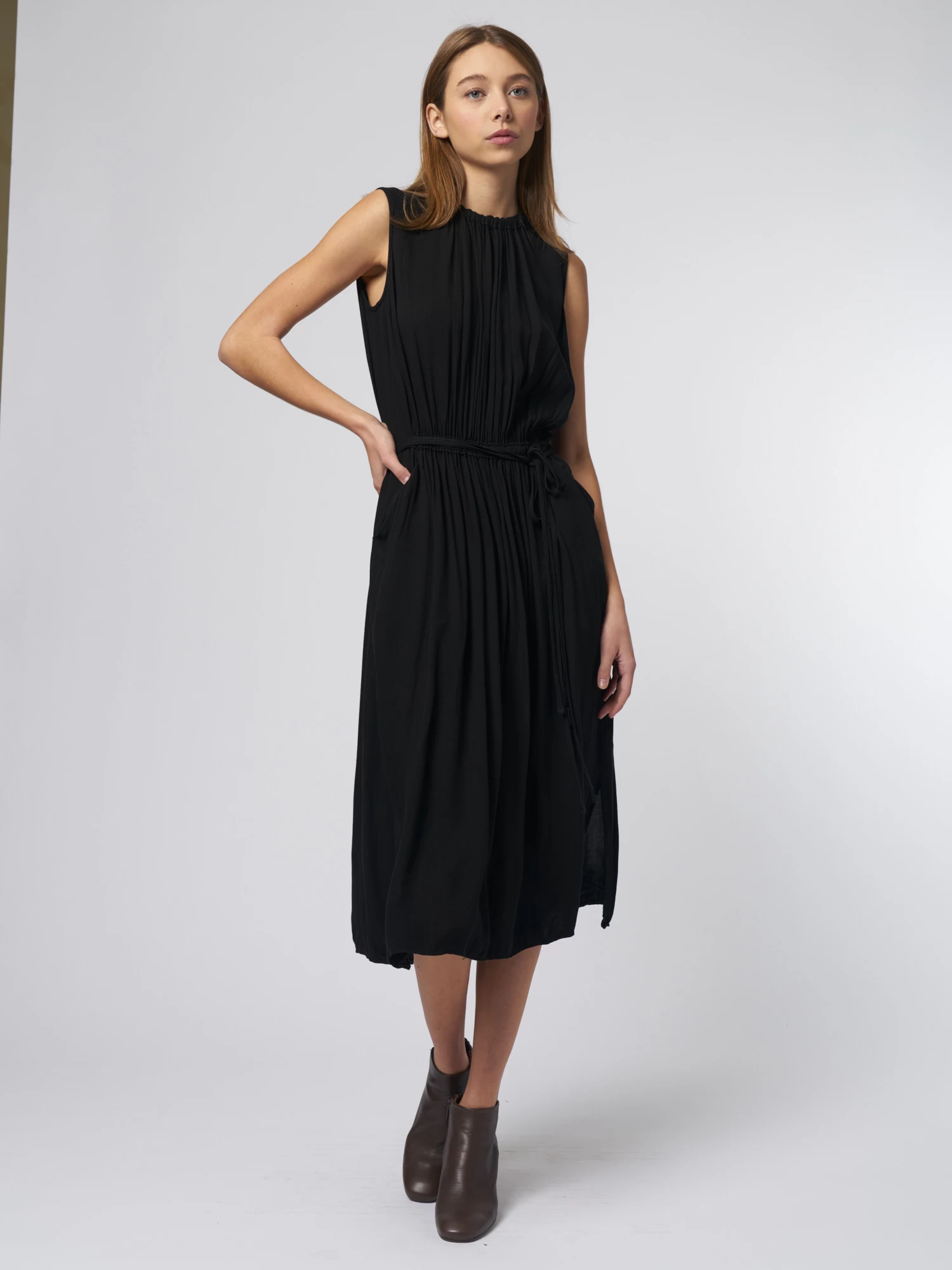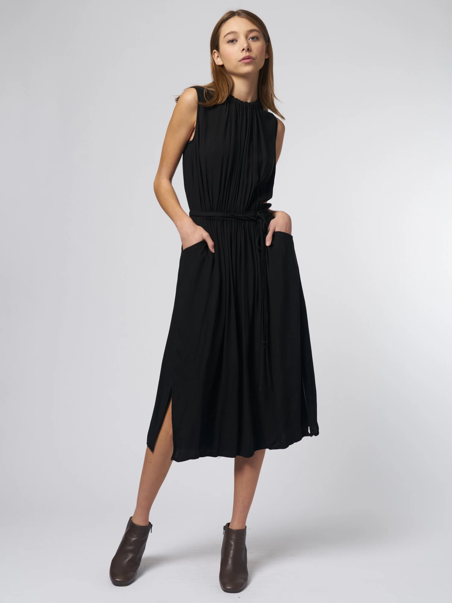 The sleeveless midi dress has a high neckline and a figure-flattering belted waist.