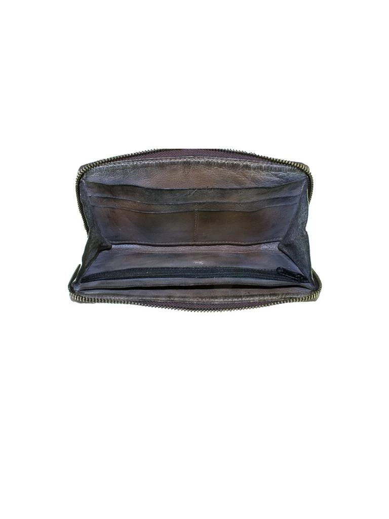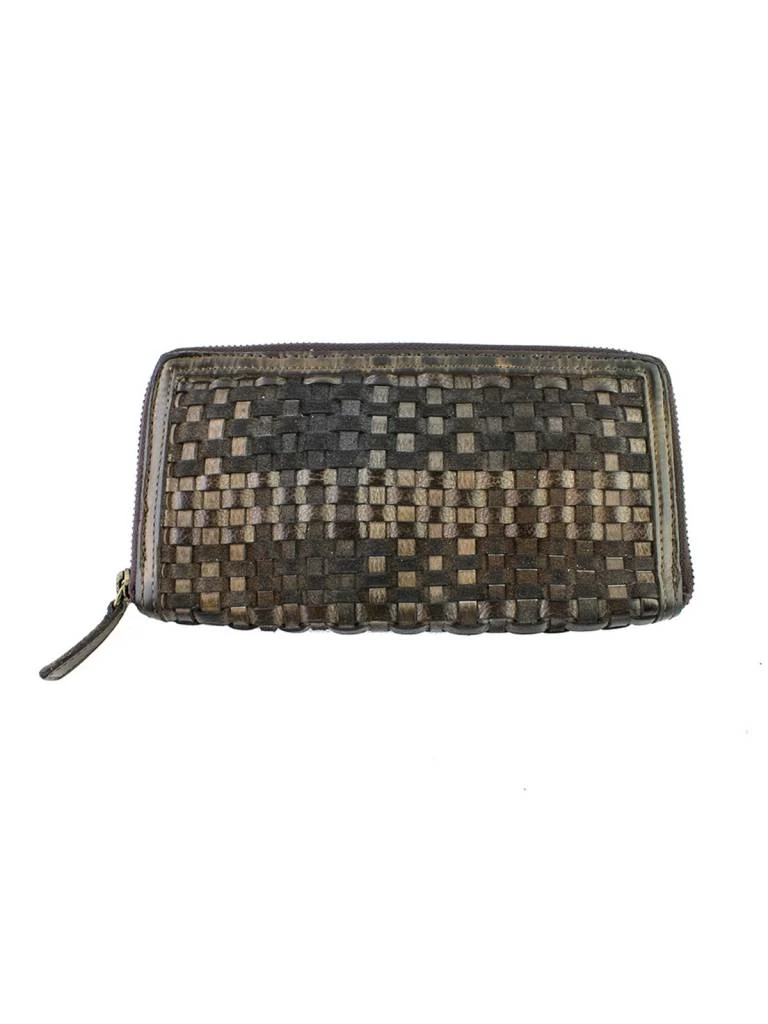 Leather wallet with woven texture front and back, with zippered closure, accordion style design, with an interior cash pocket on either side, 1 zippered interior pocket, and 4 credit card pockets.