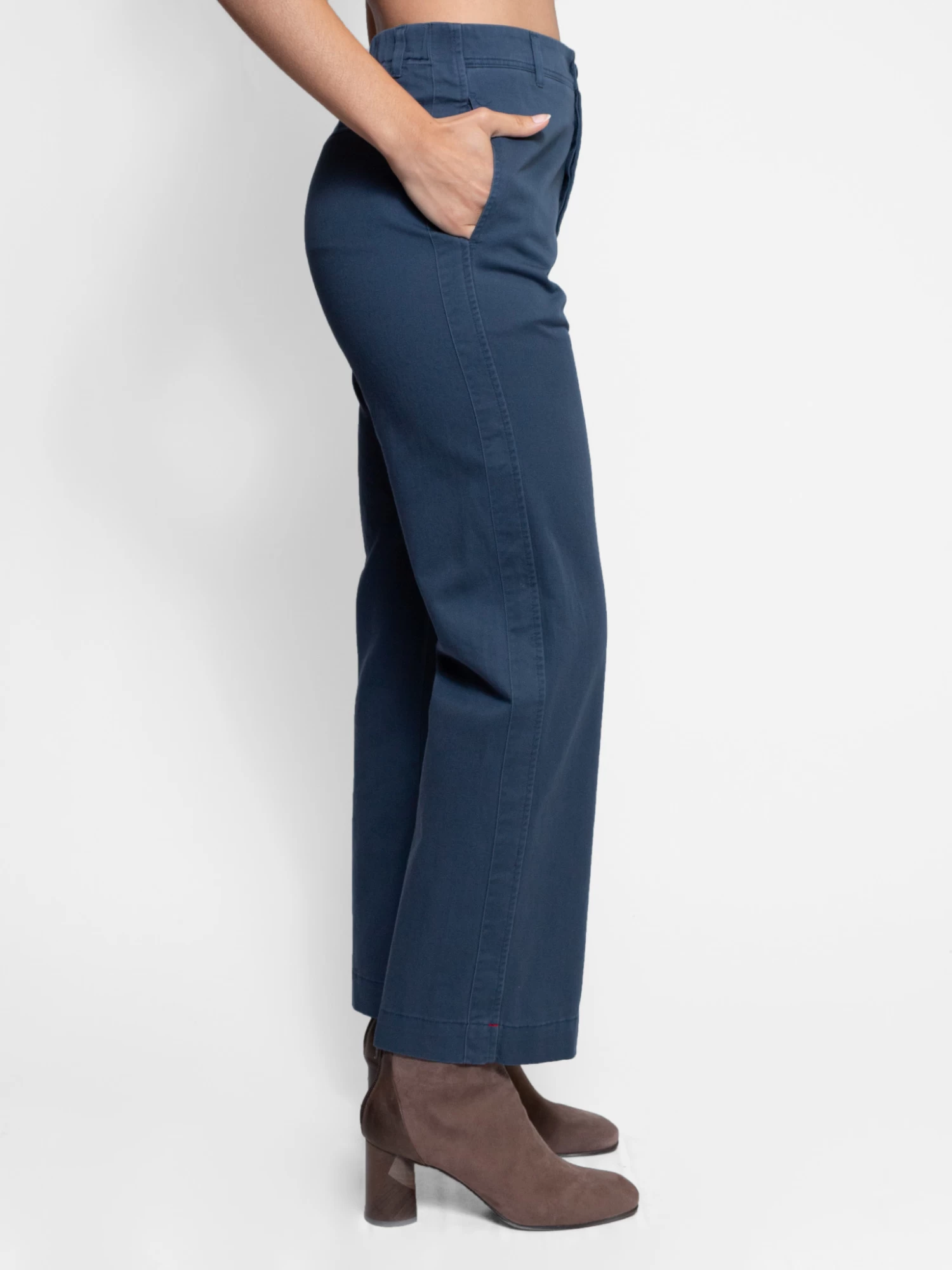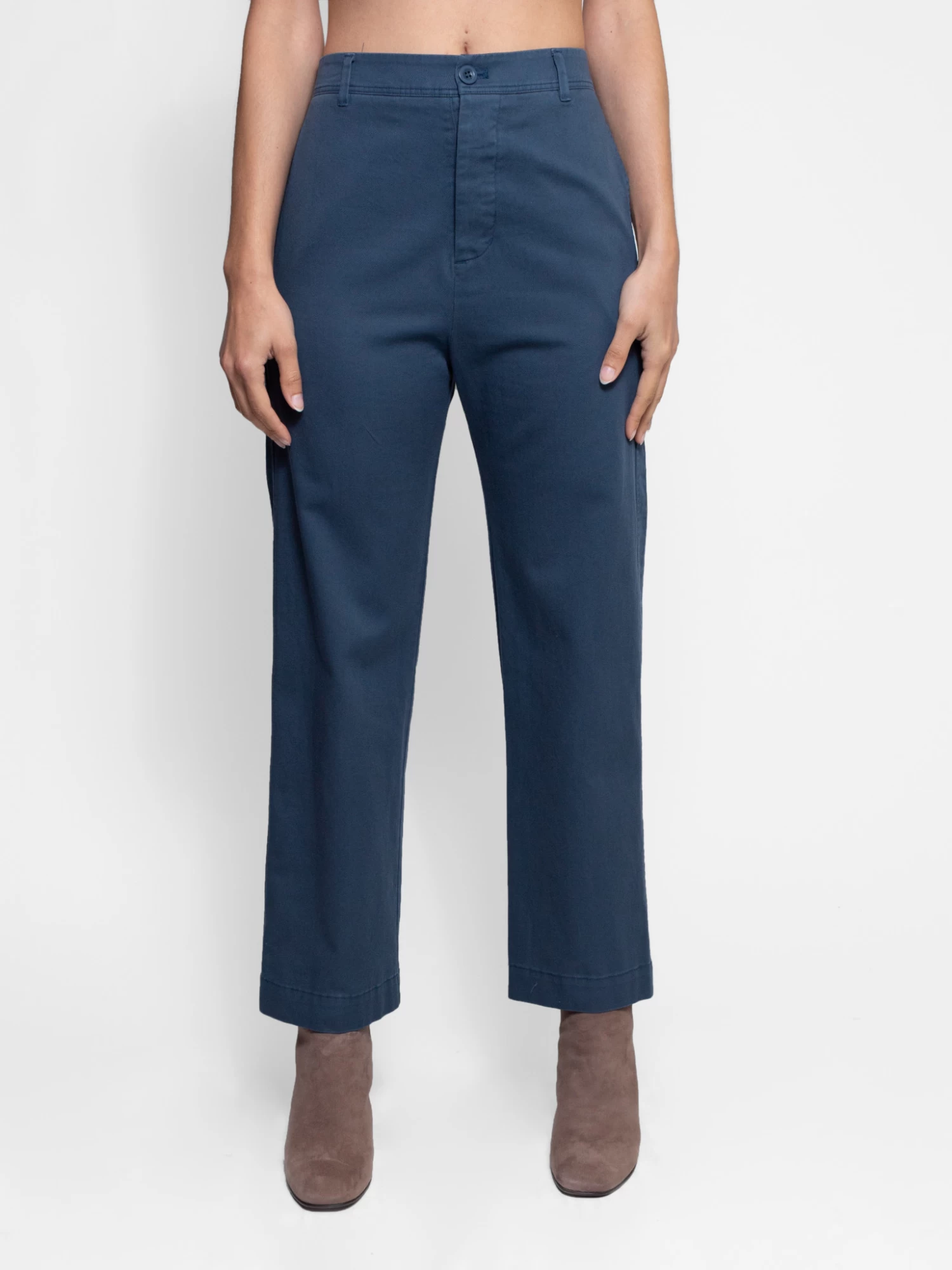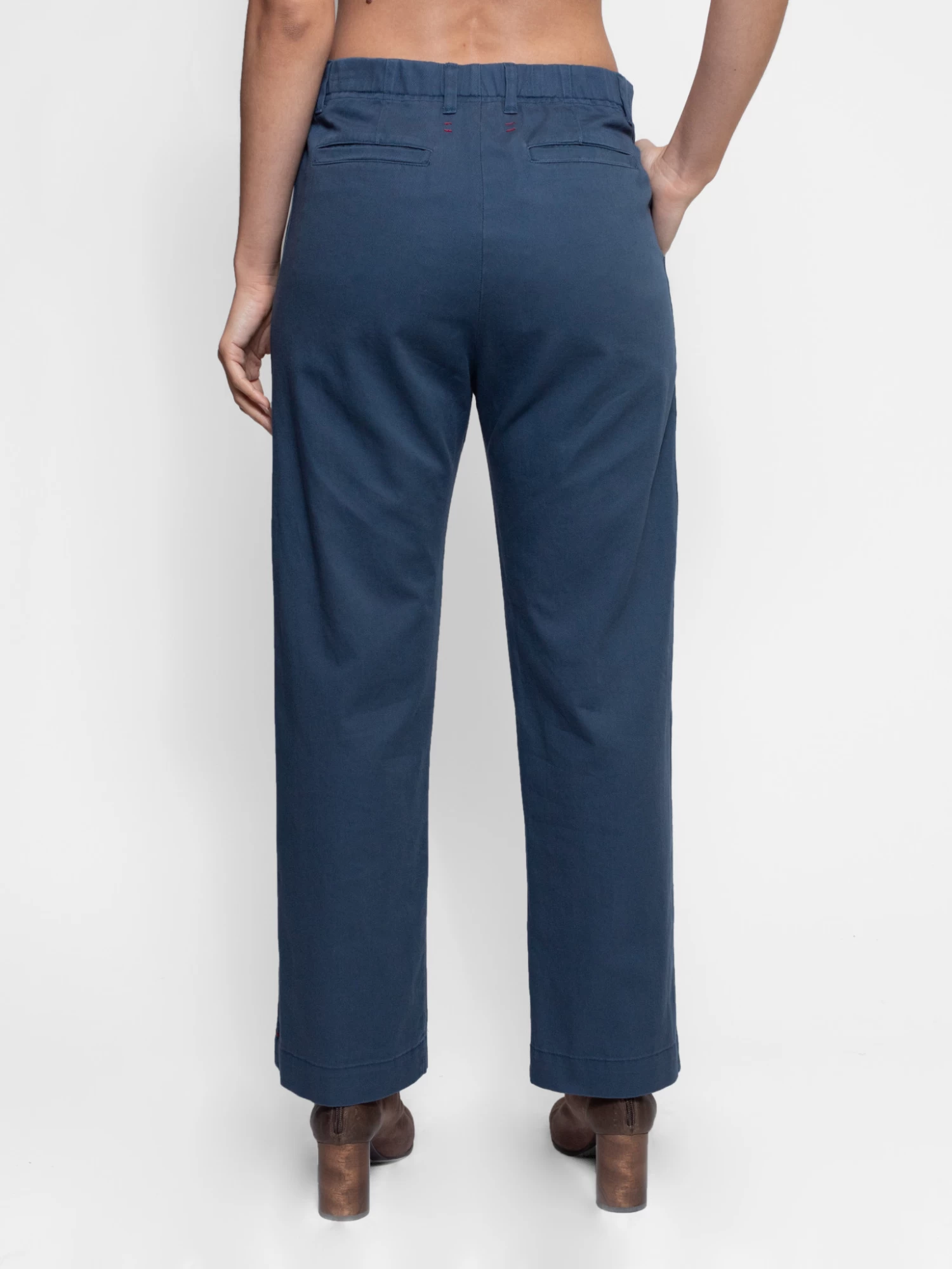 An easy fit pant with side pockets, back pockets, an elasticated back and a straight leg in ocean blue cotton twill.