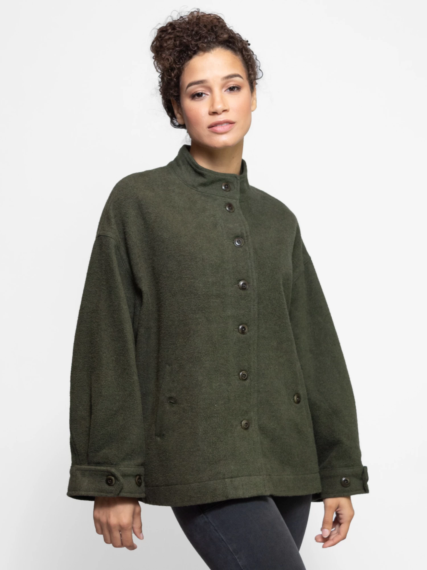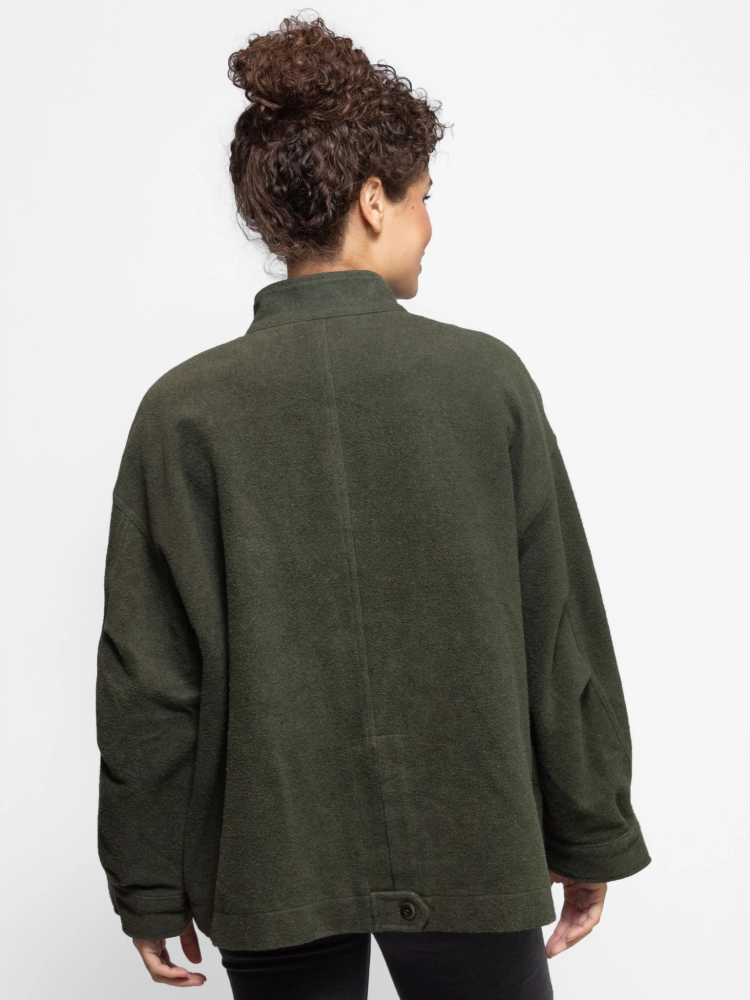 A boxy jacket with side pockets, adjustable button cuffs, button up front, and button tab at back hem in an army green brushed felt.