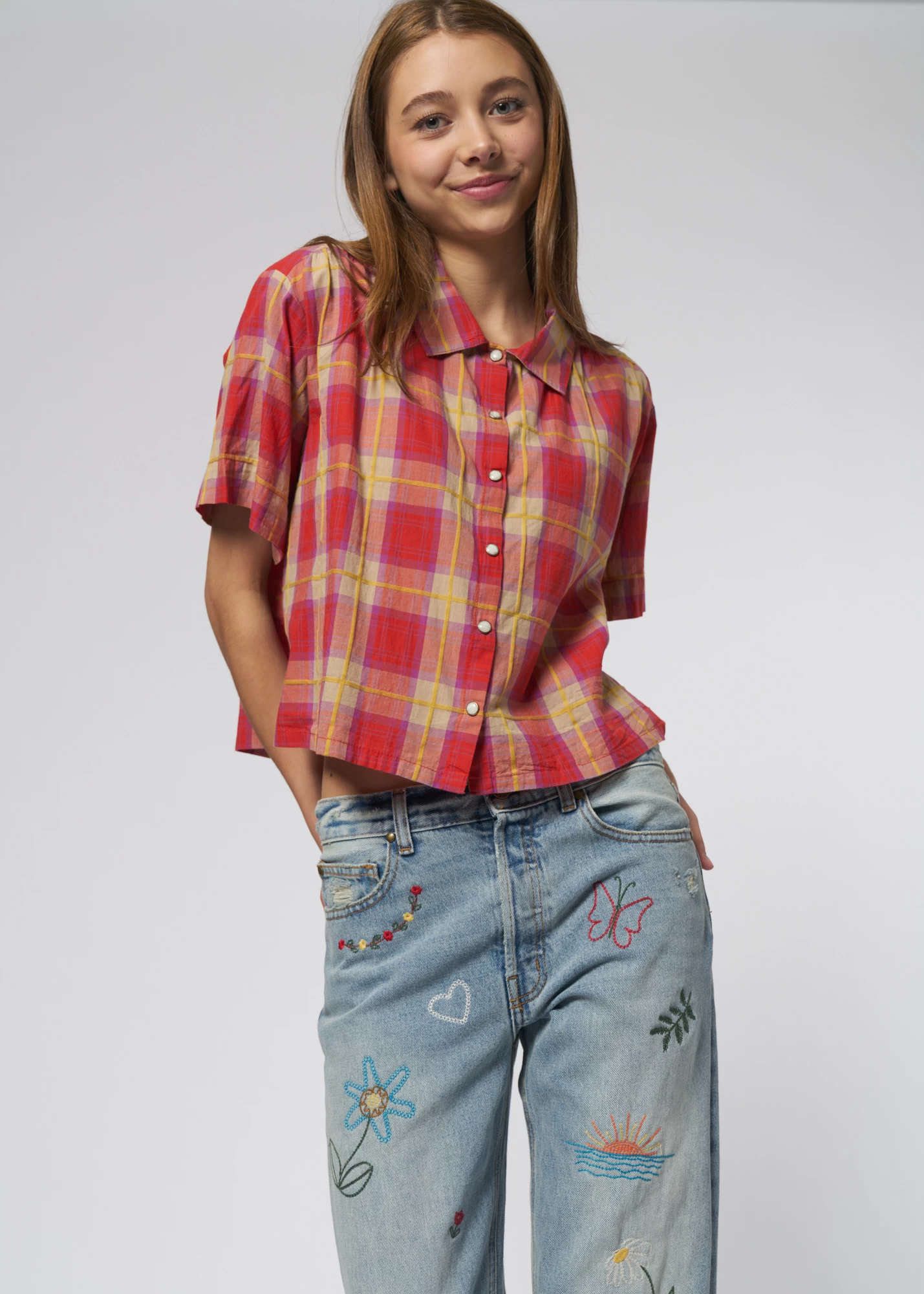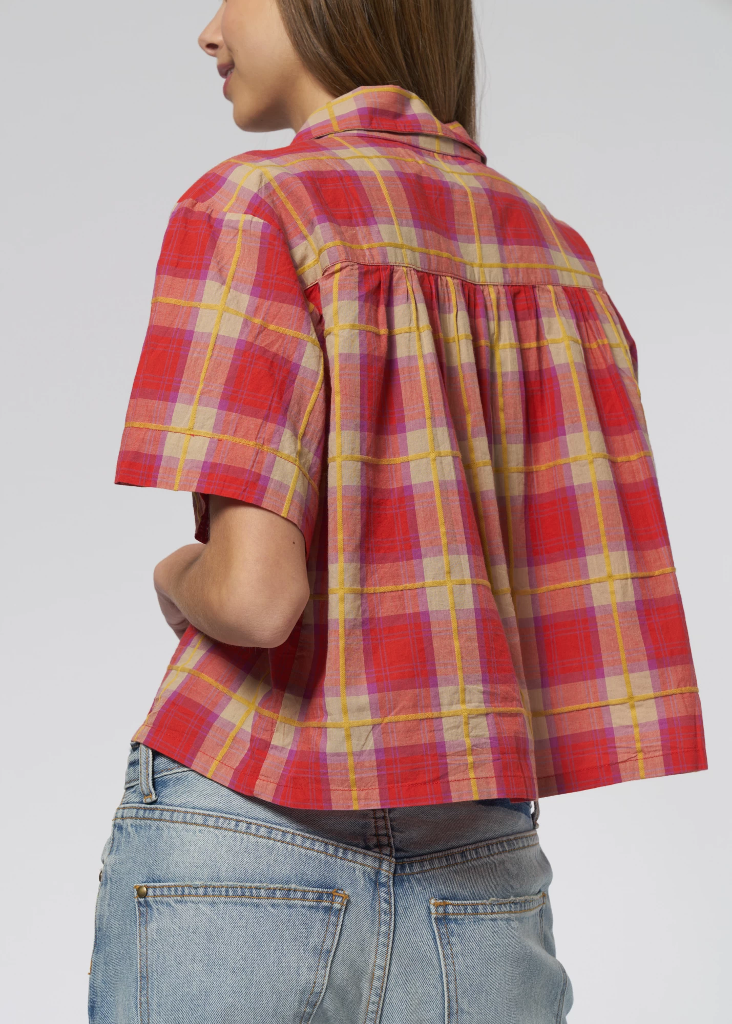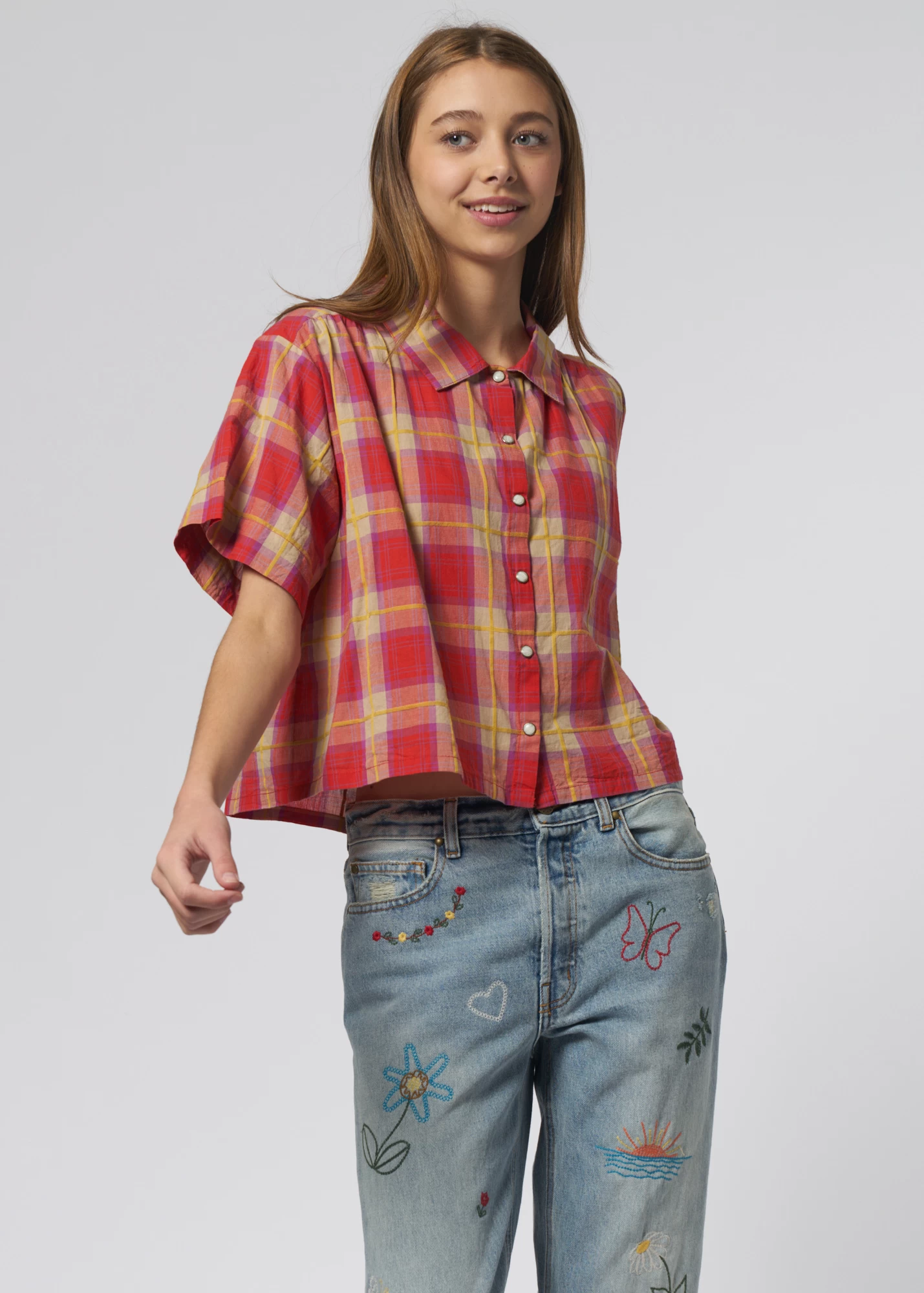 Very Sofy soft, cool-weather top in lake house plaid swings with pearl snaps.
