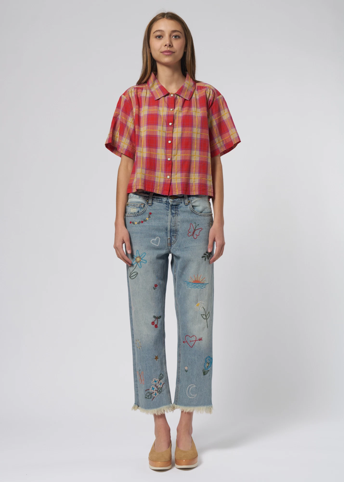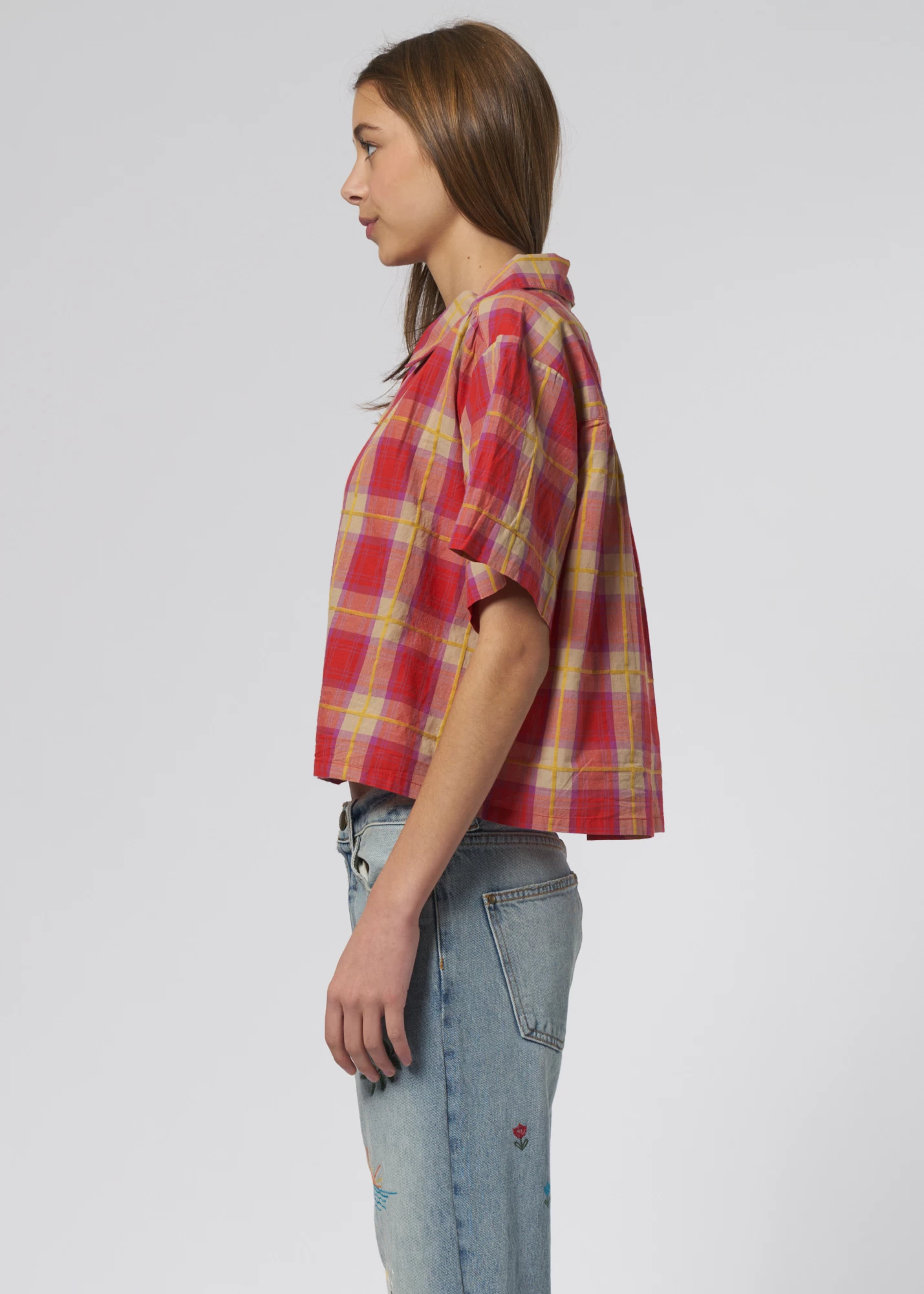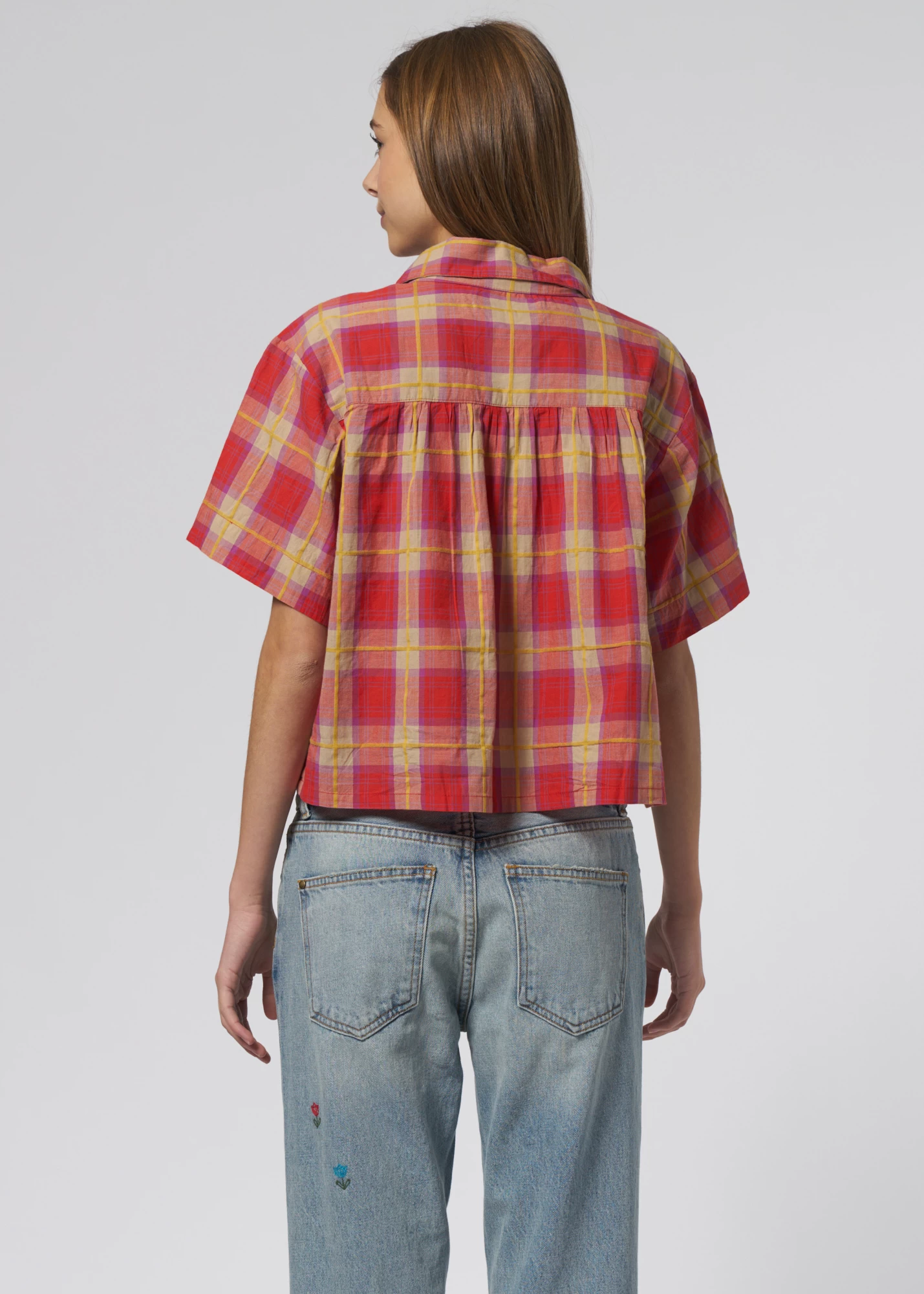 Very Sofy soft, cool-weather top in lake house plaid swings with pearl snaps.