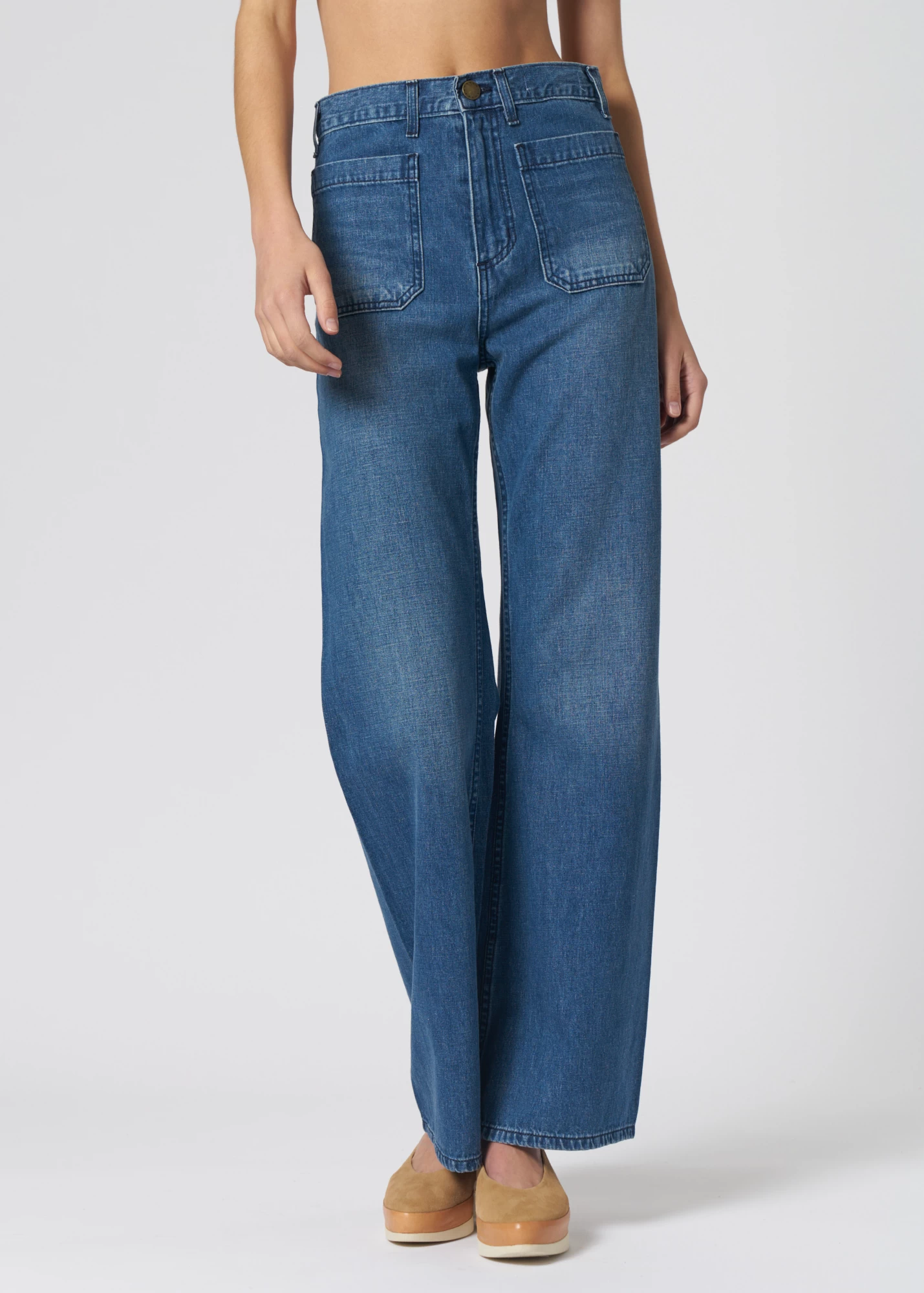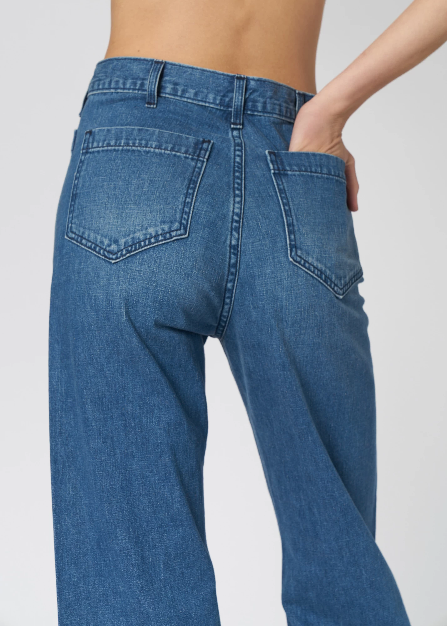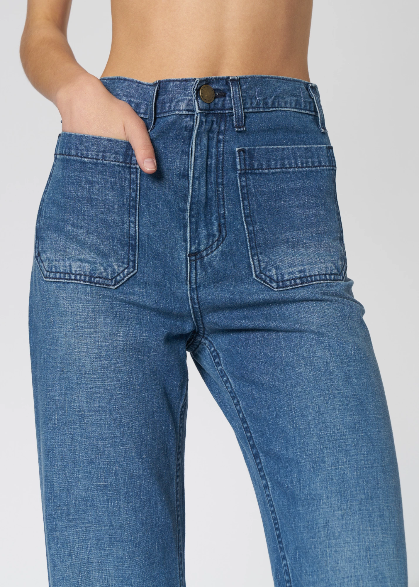 High-waisted bell-shaped jeans feature a subtle horseshoe shape for a flattering leg, sailor patch pockets, and a zip fly with metal button closure.