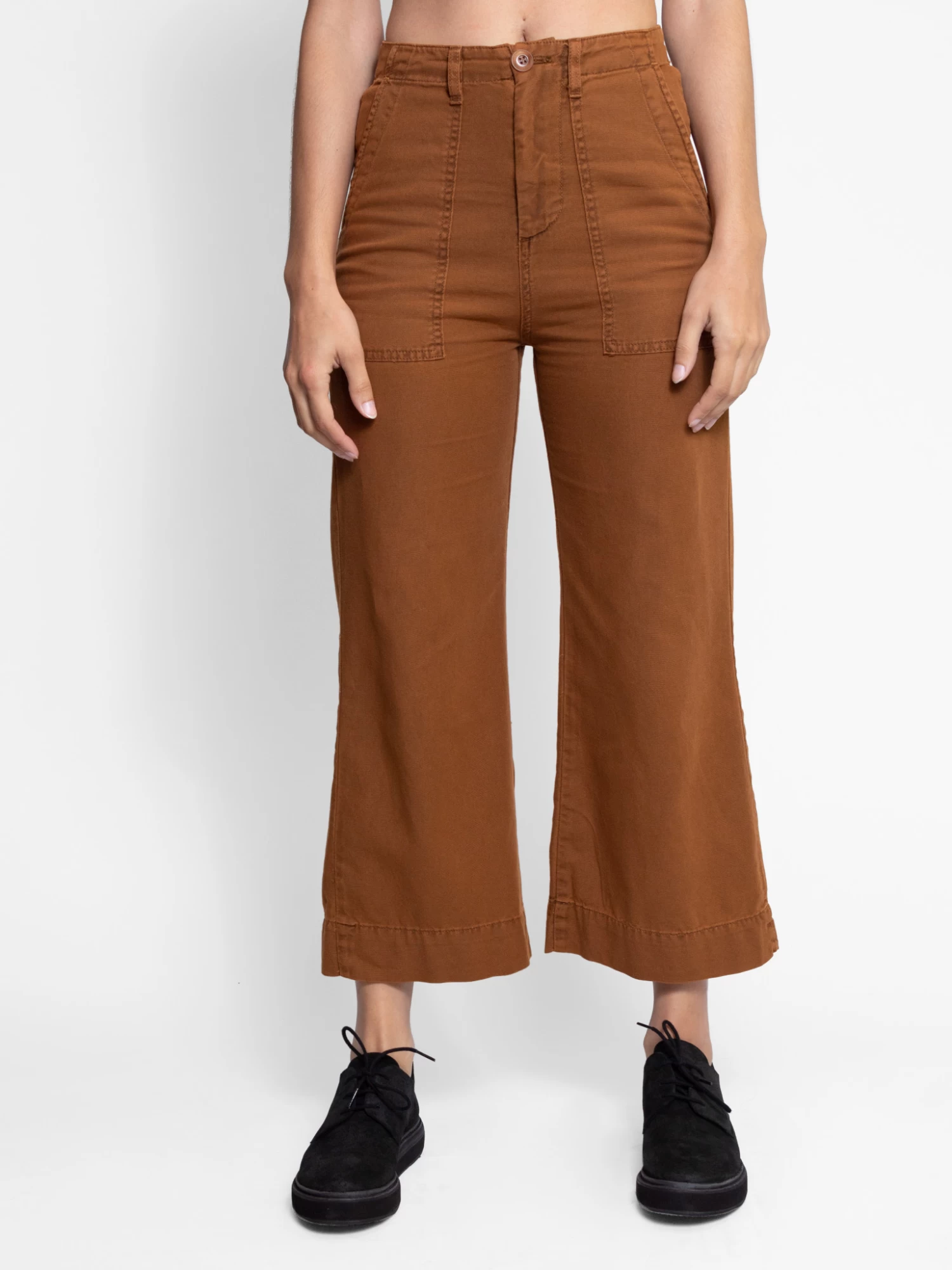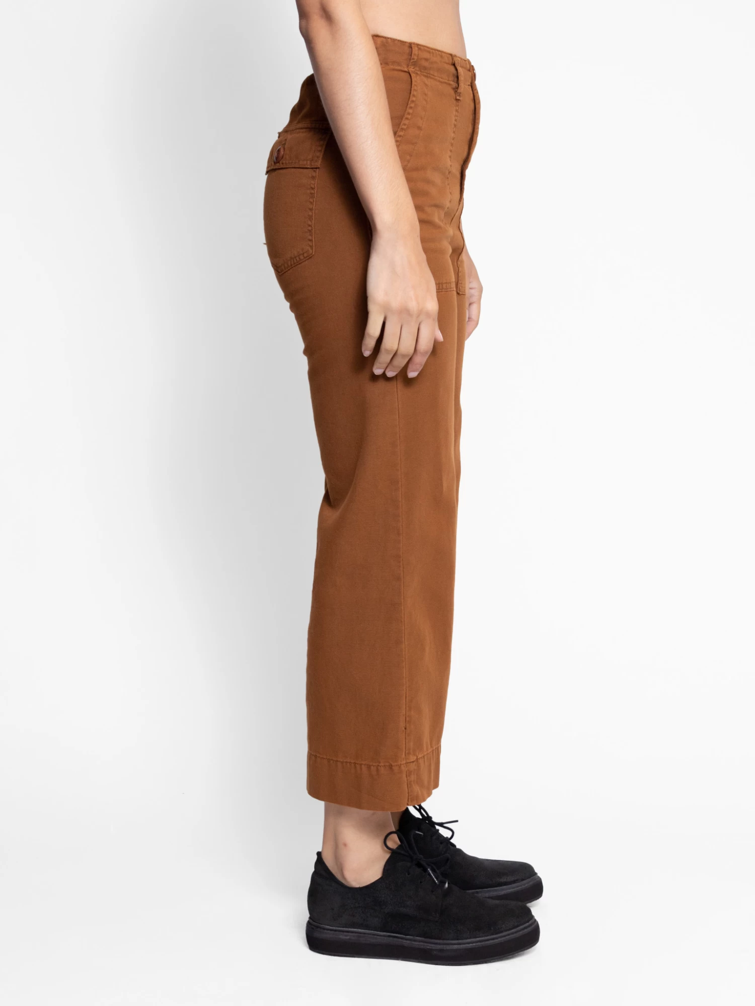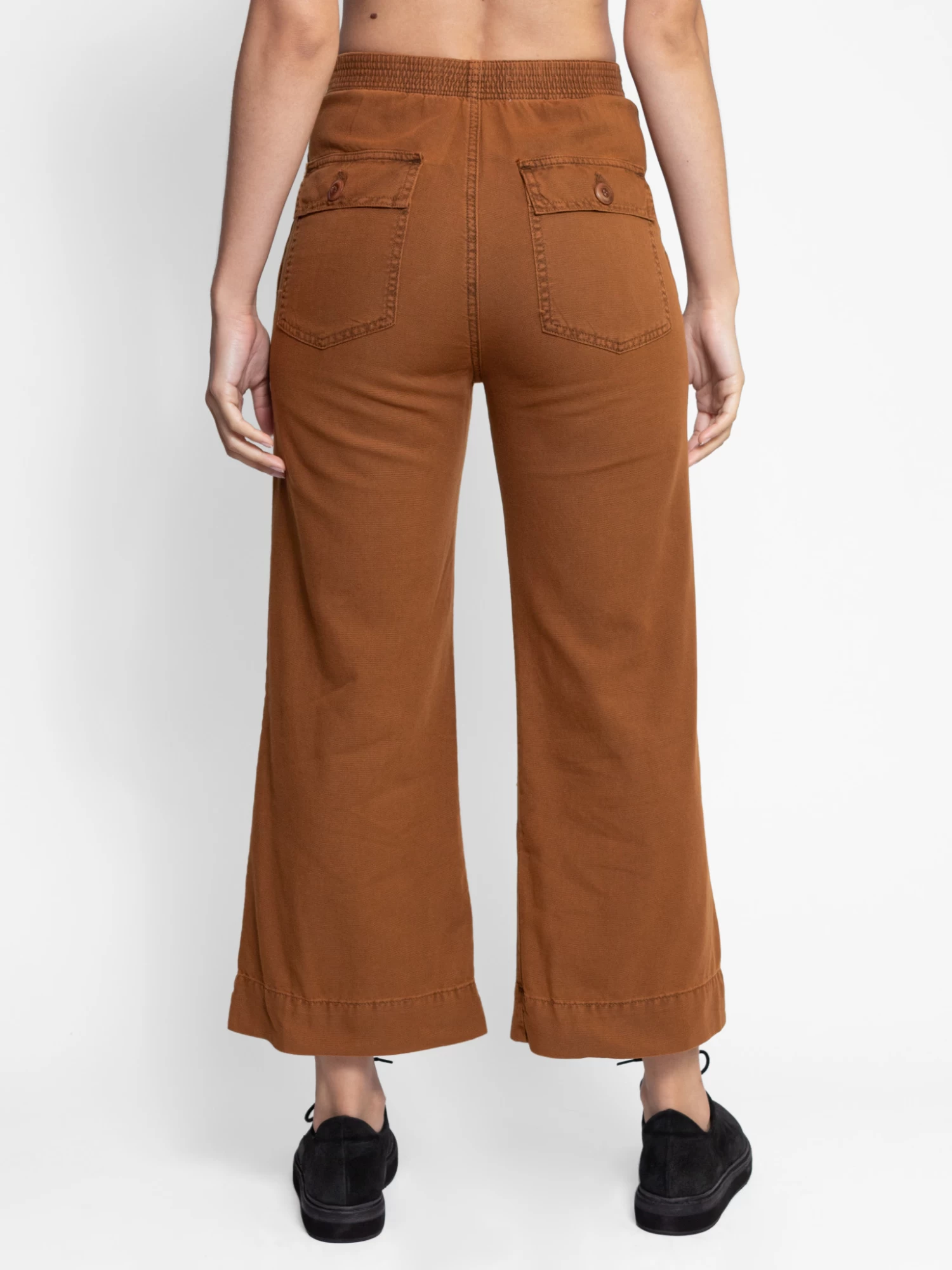 A high rise pant with a slightly cropped flared leg, elasticated waist back, army front and pockets in a copper canvas.