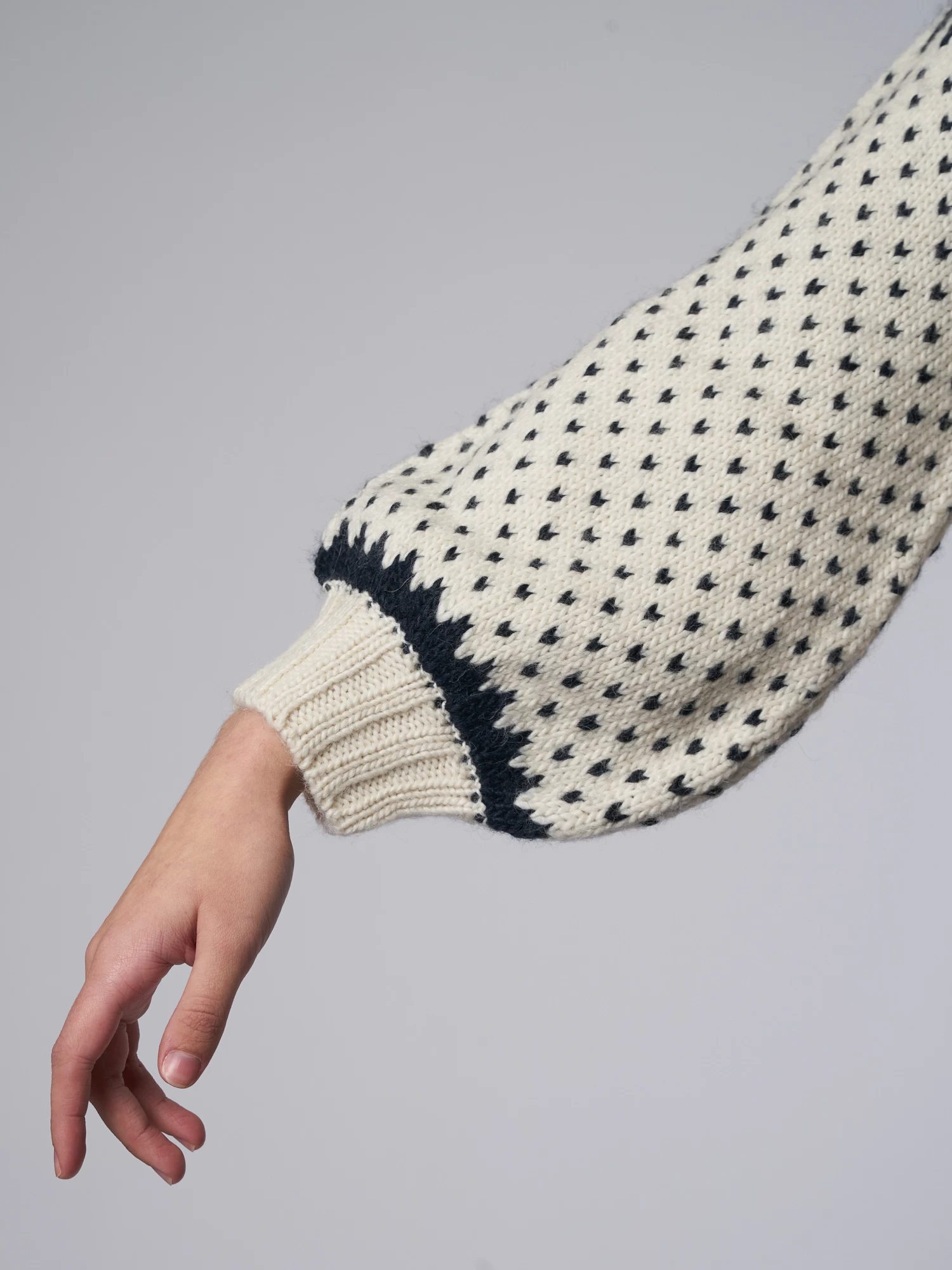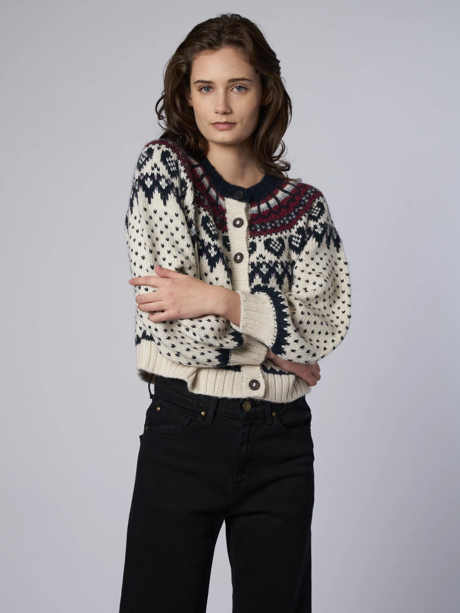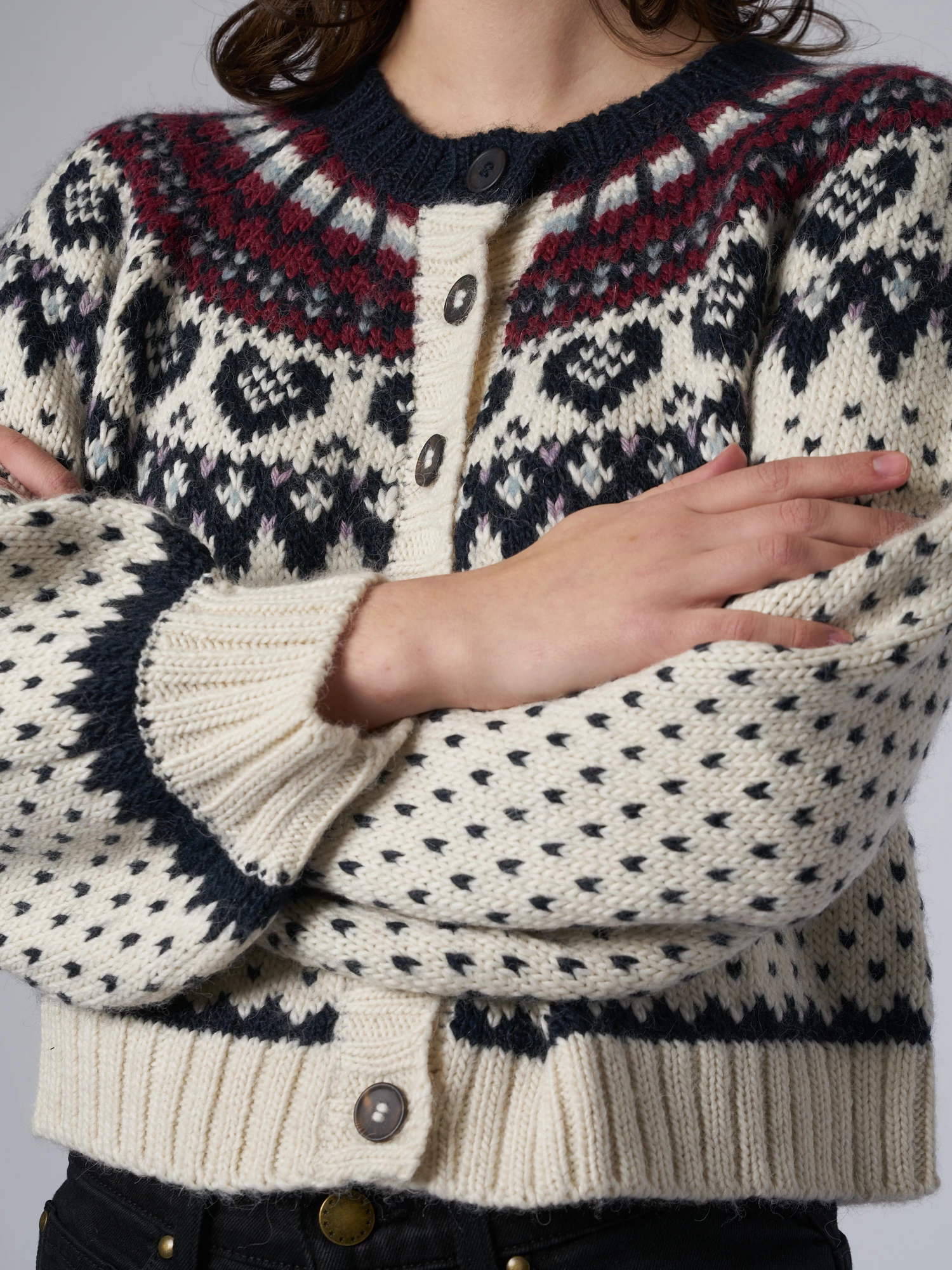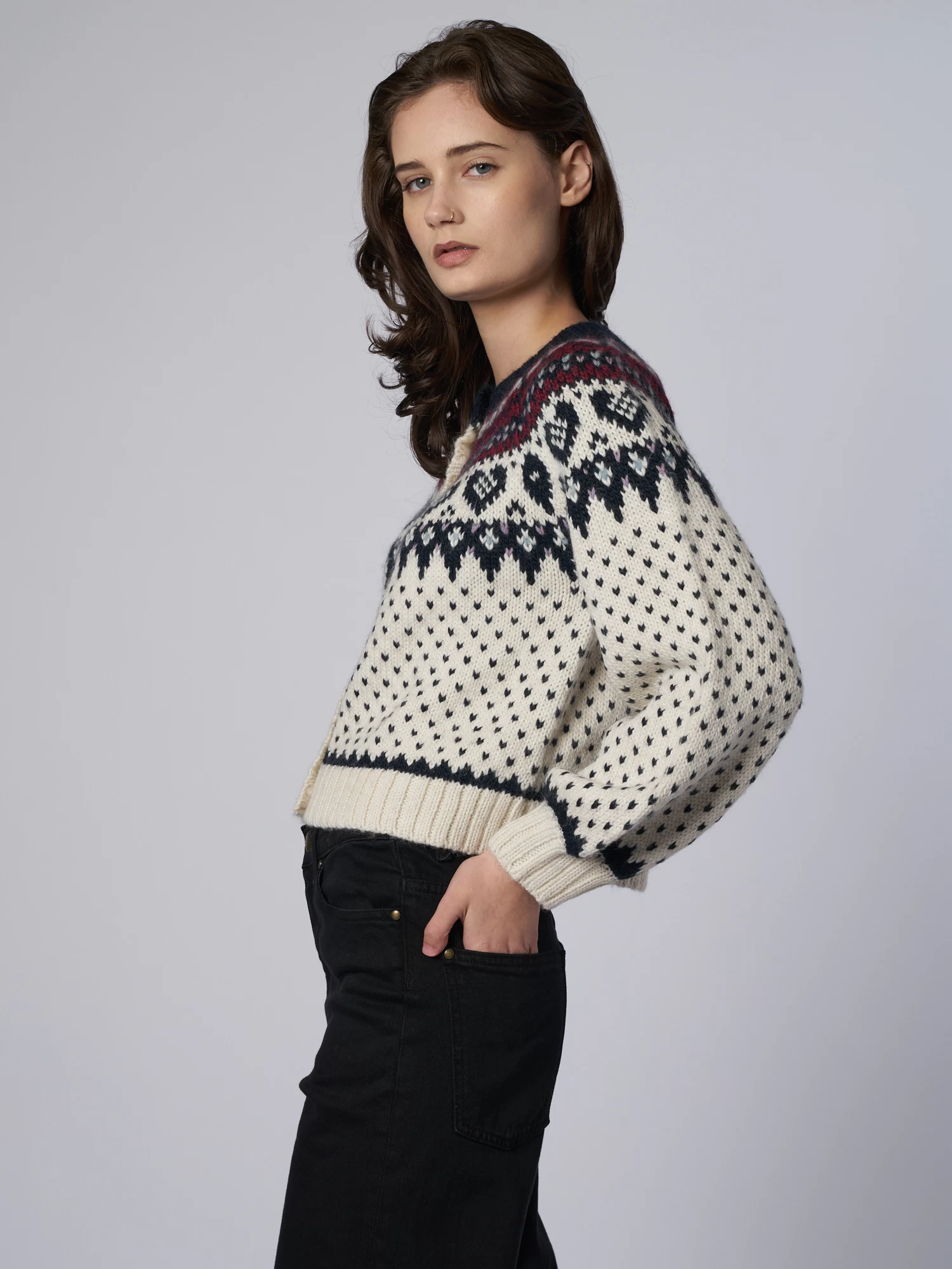 It features a classic front button closure with horn buttons, blouson sleeves with ribbed cuffs, and a contrasting fair Isle pattern. It’s intended to hit at the hip.