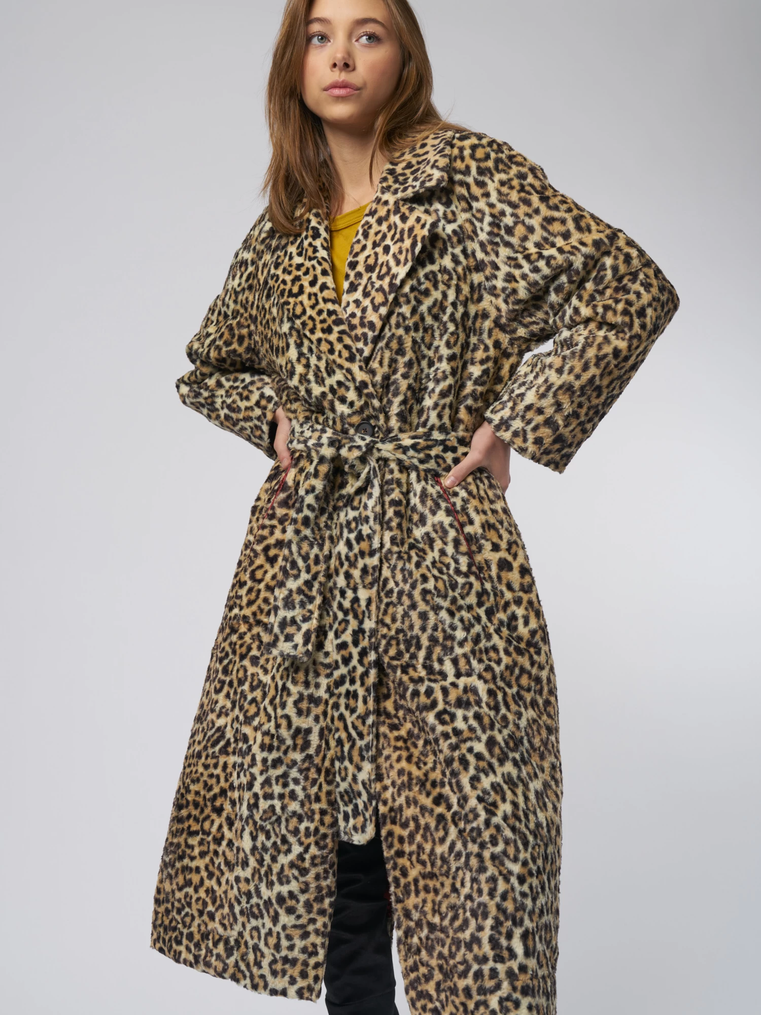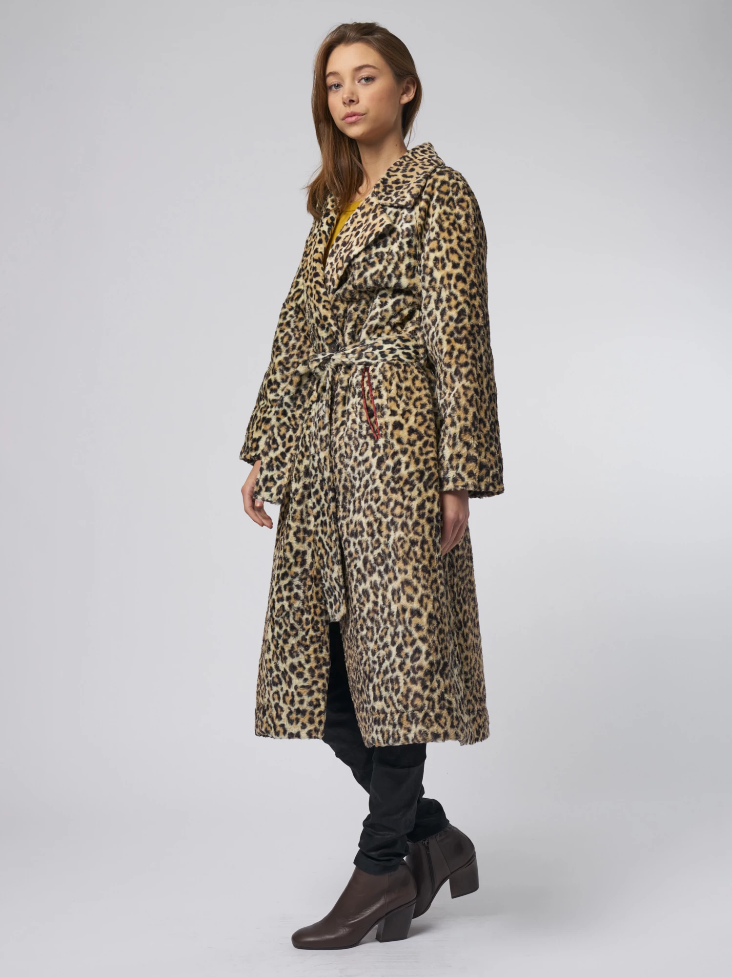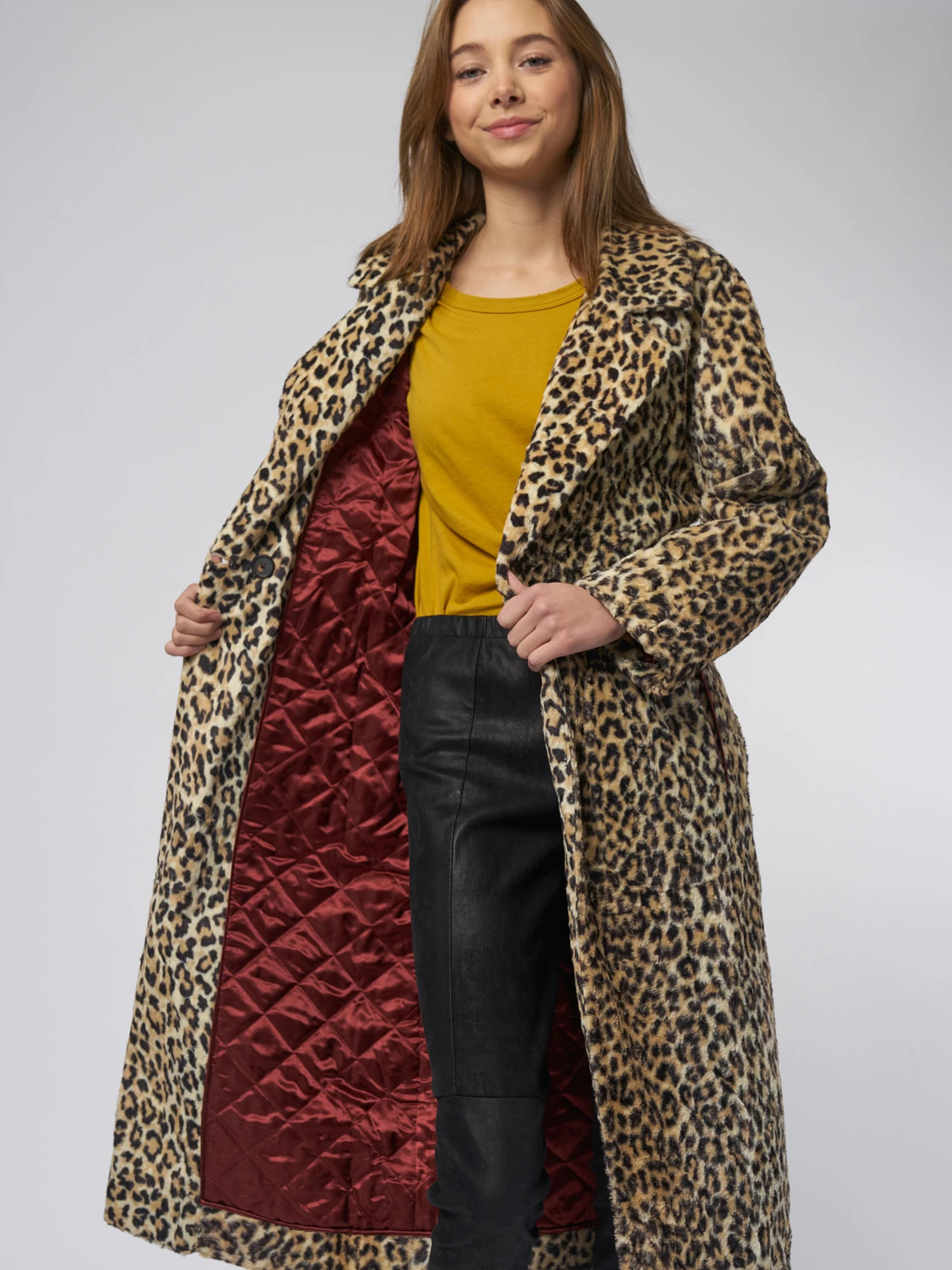 The soft-handed leopard print coat features a deep notch collar, horn buttons, contrast piping, and the softest quilted satin lining.