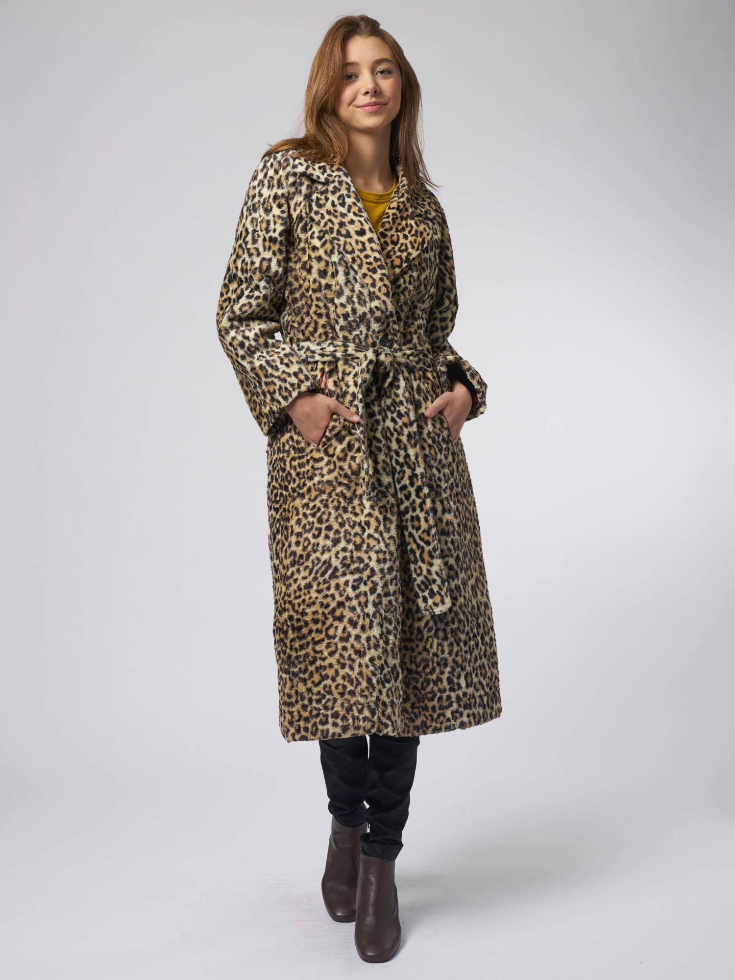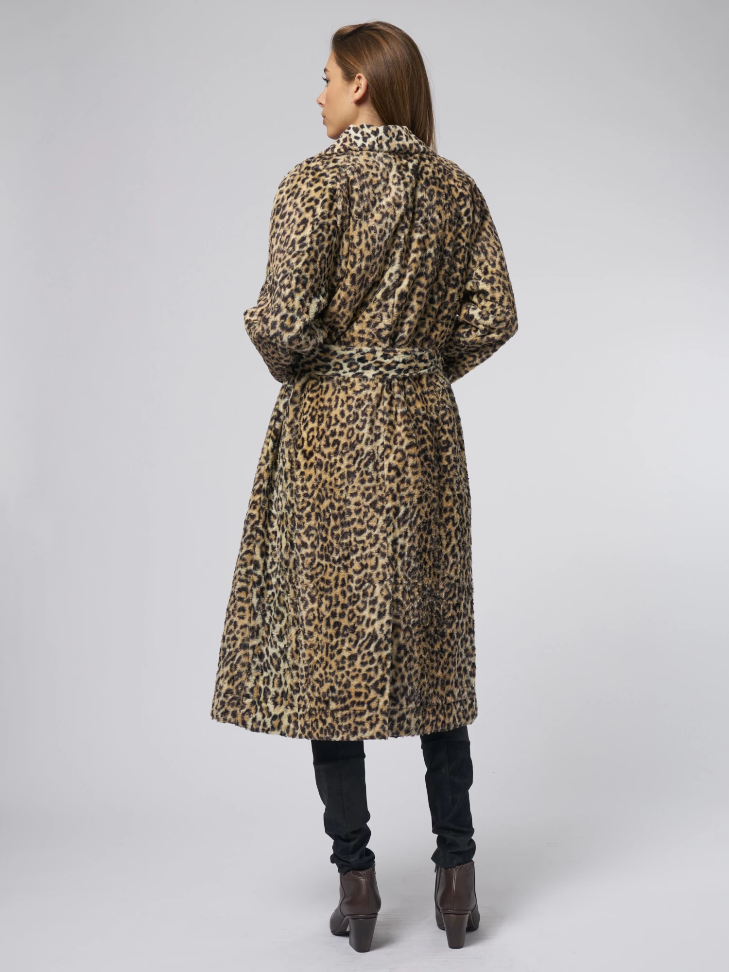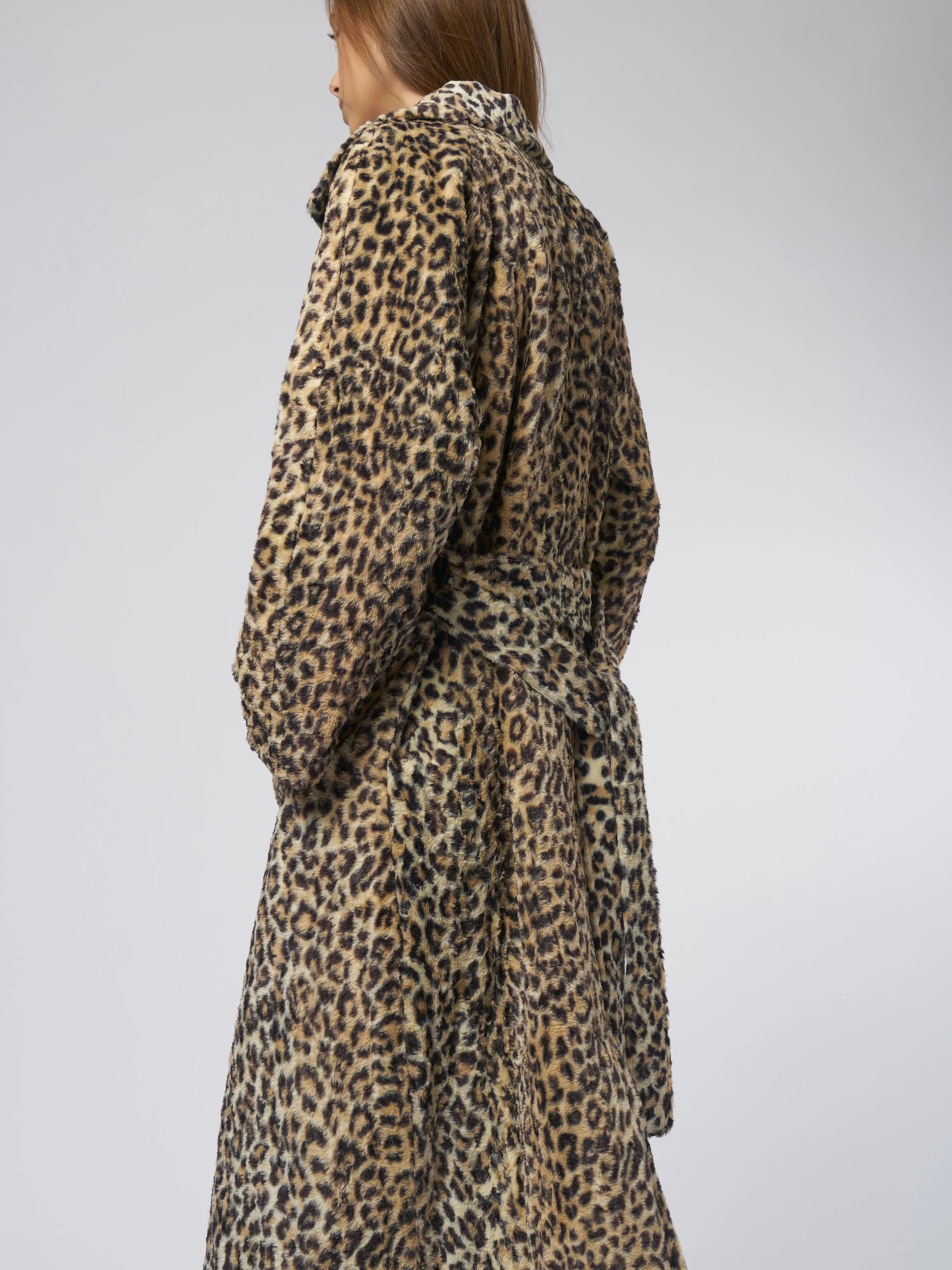 The soft-handed leopard print coat features a deep notch collar, horn buttons, contrast piping, and the softest quilted satin lining.