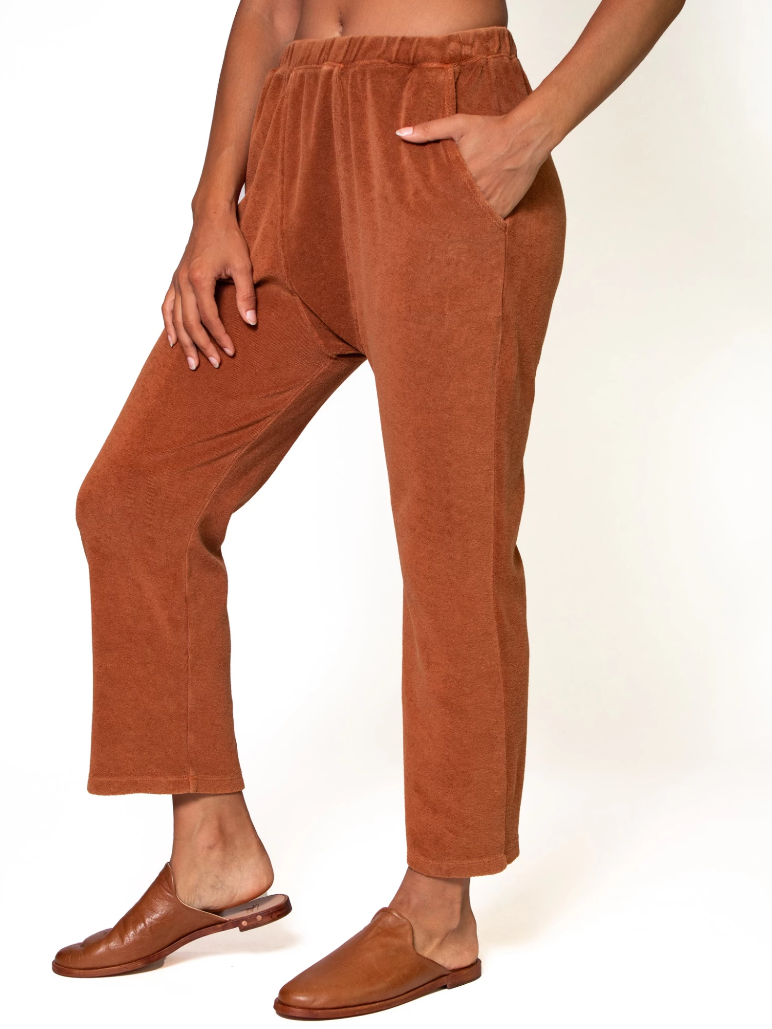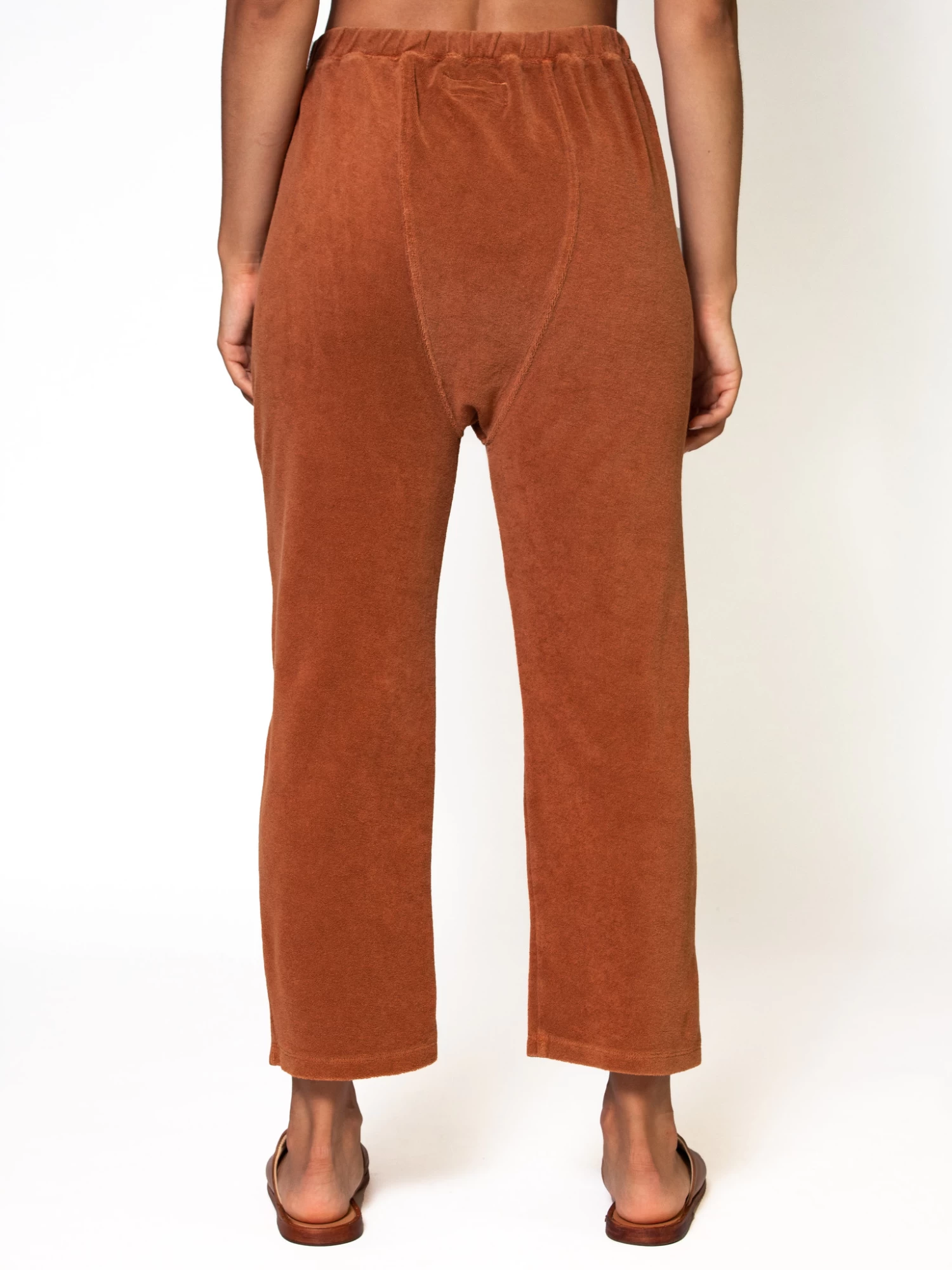 Very comfortable pant cut from soft, light weight terry in rust color. It has a paneled drop rise, slant side pockets, channeled waist, and wide leg.