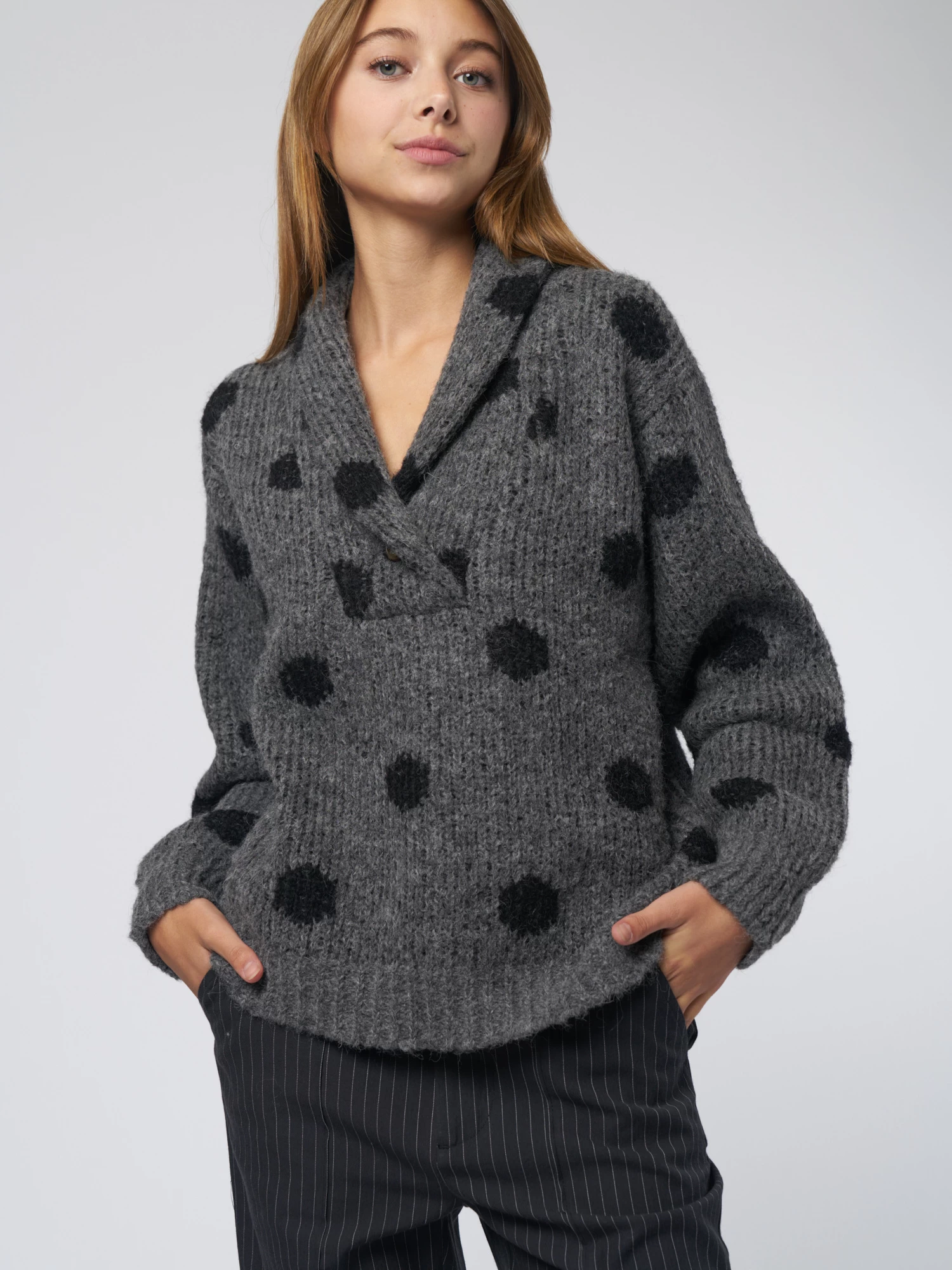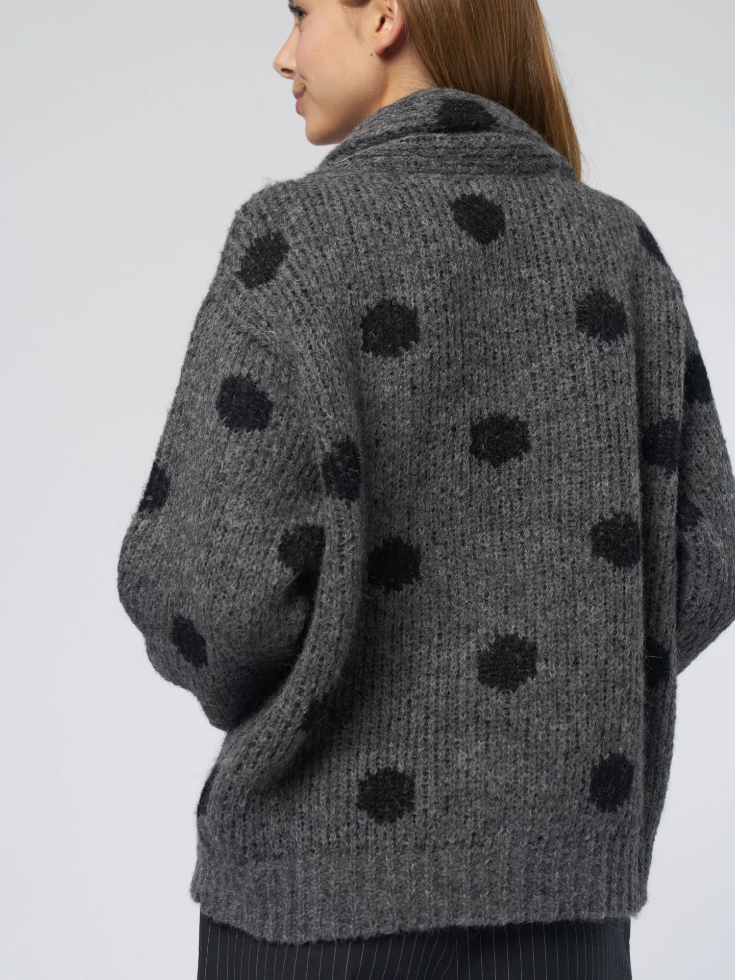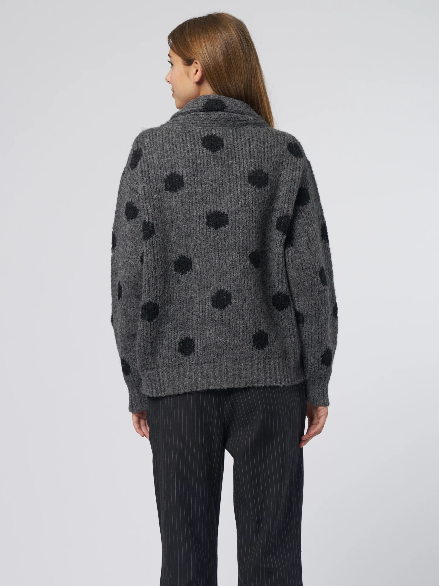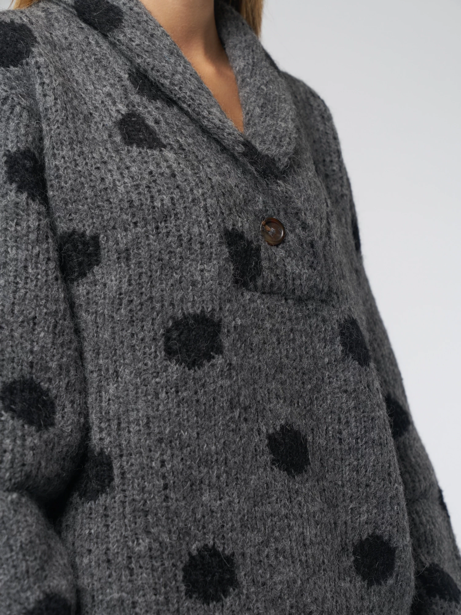 Alpaca sweater with polka dot motif has a shawl collar and lightly blouson sleeves with cuff.