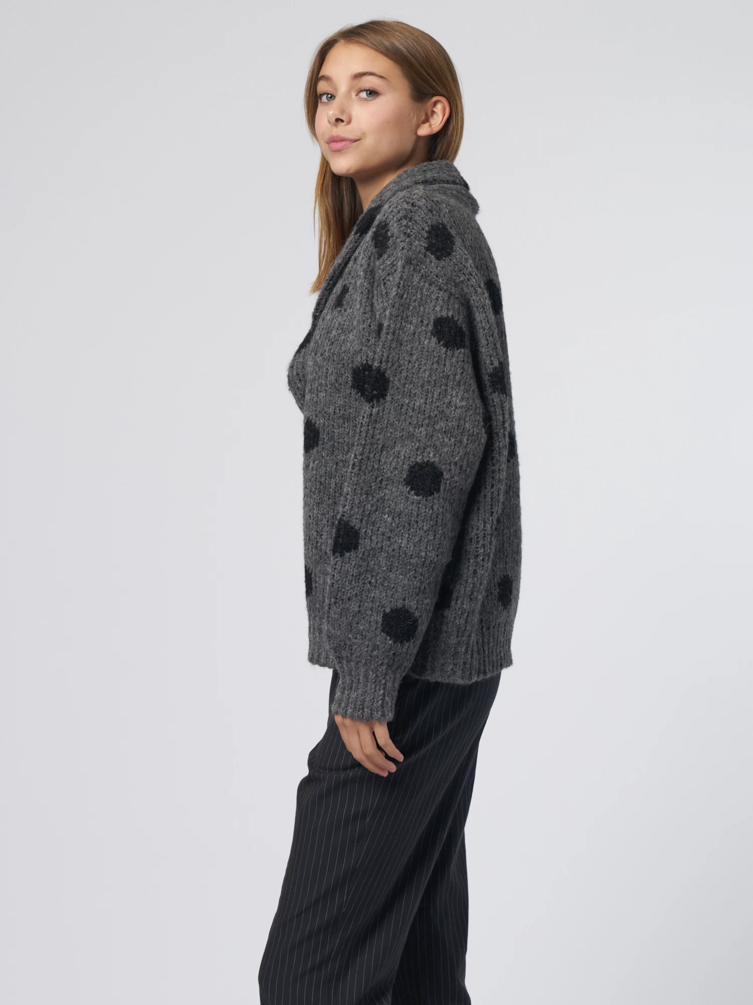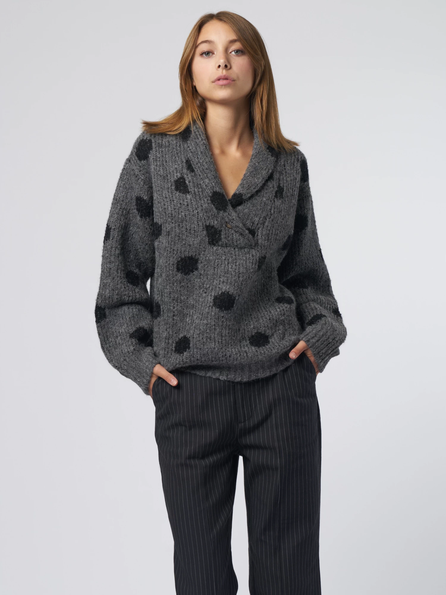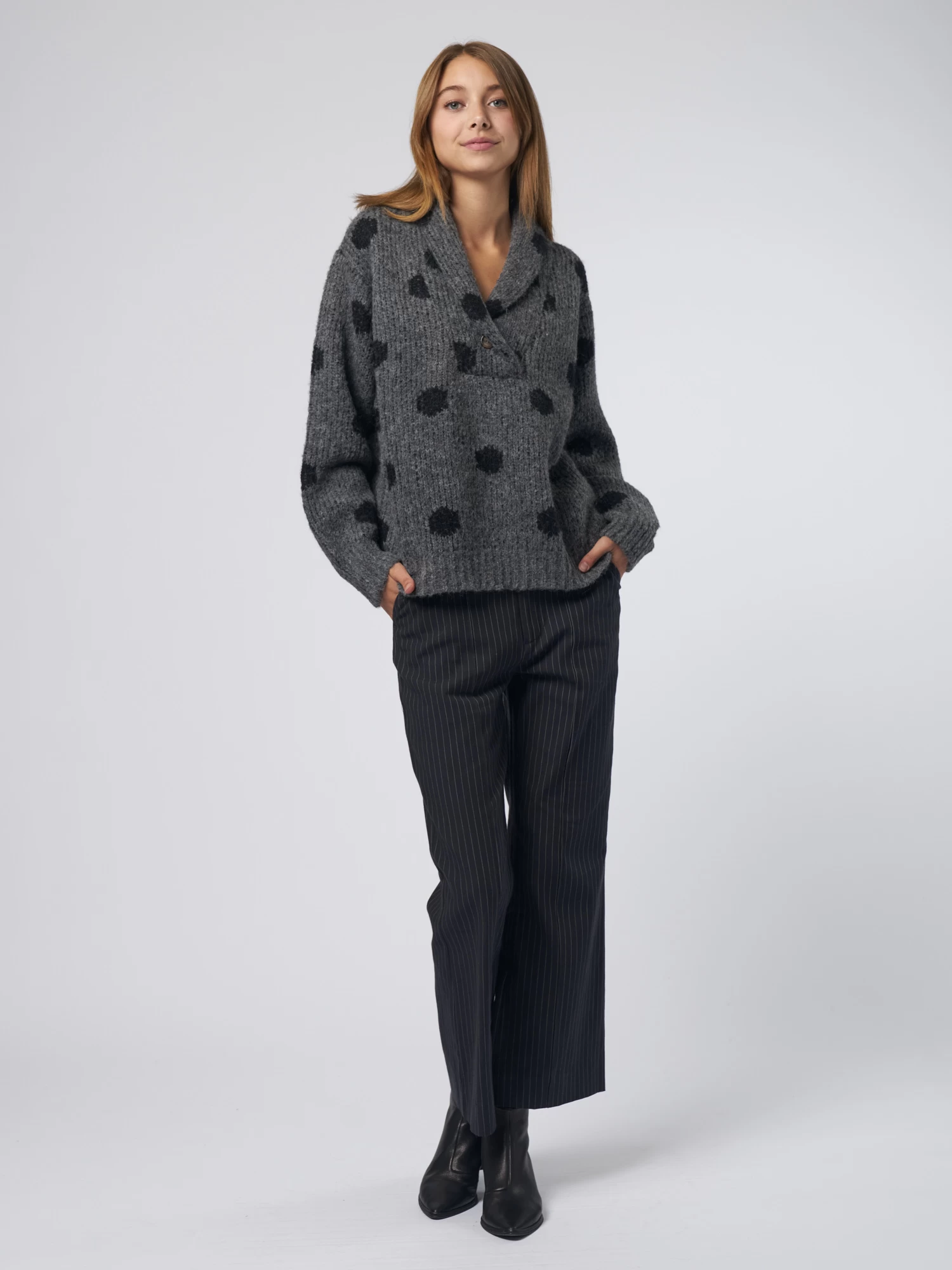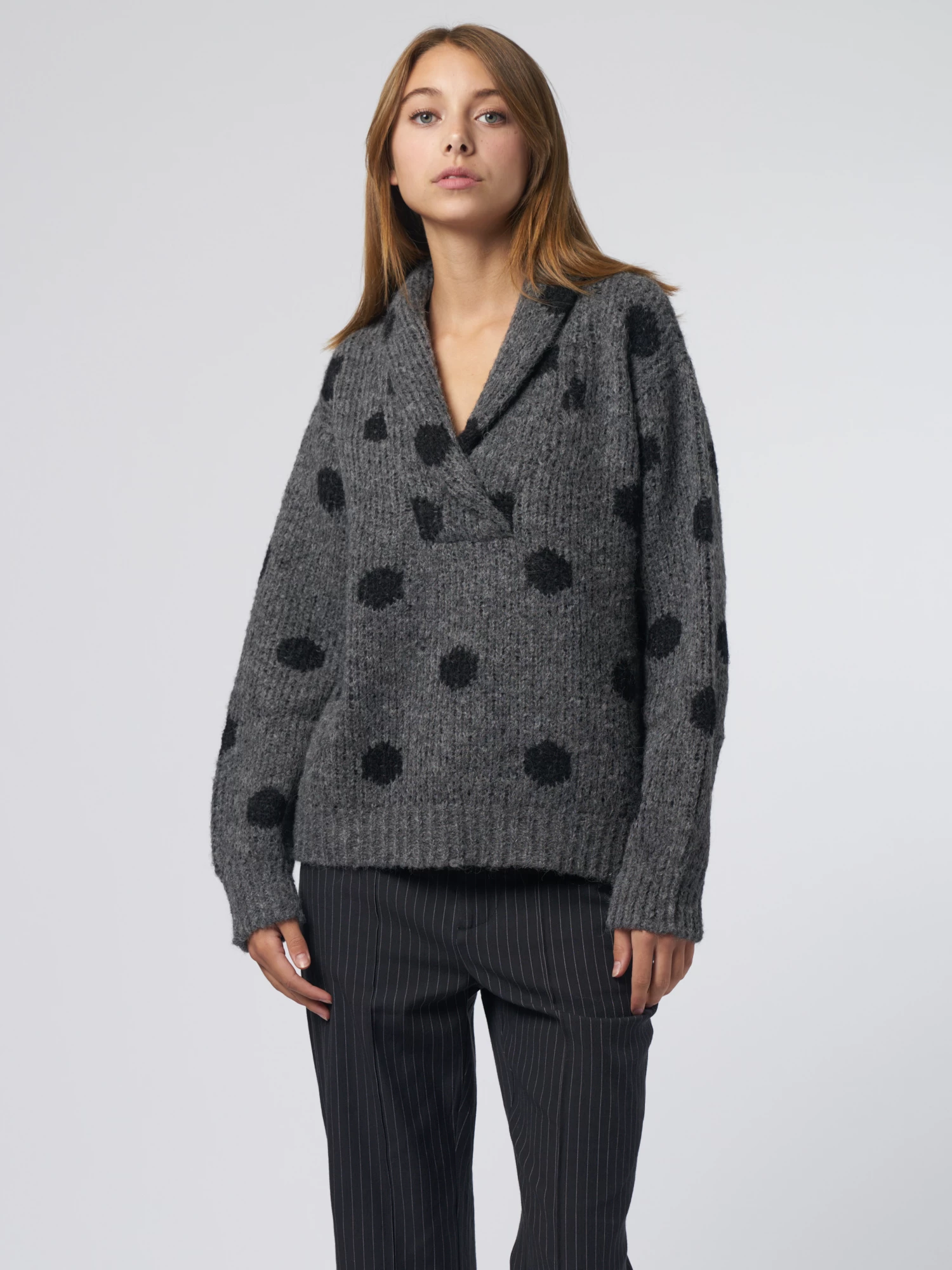 Alpaca sweater with polka dot motif has a shawl collar and lightly blouson sleeves with cuff.