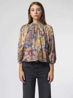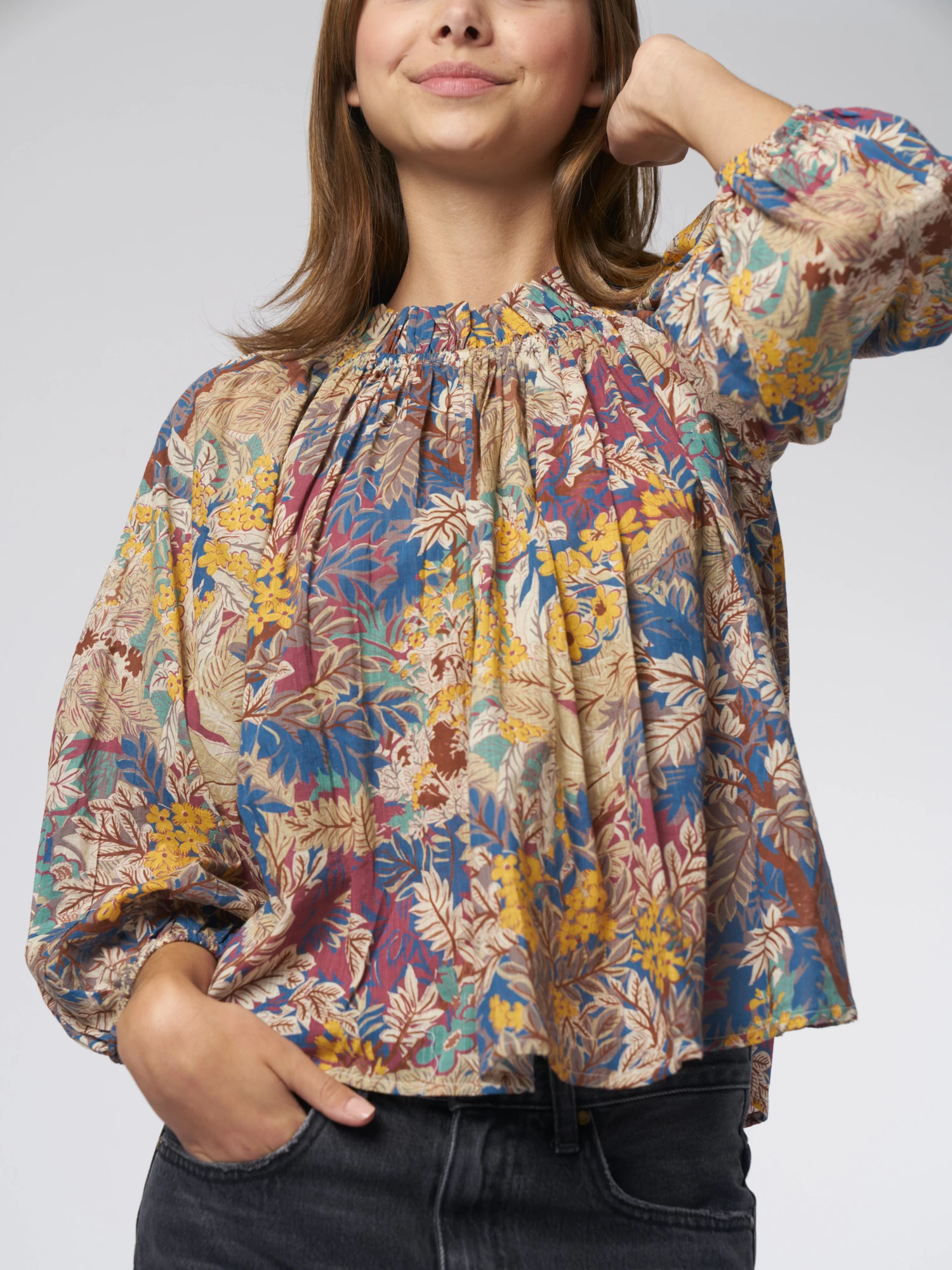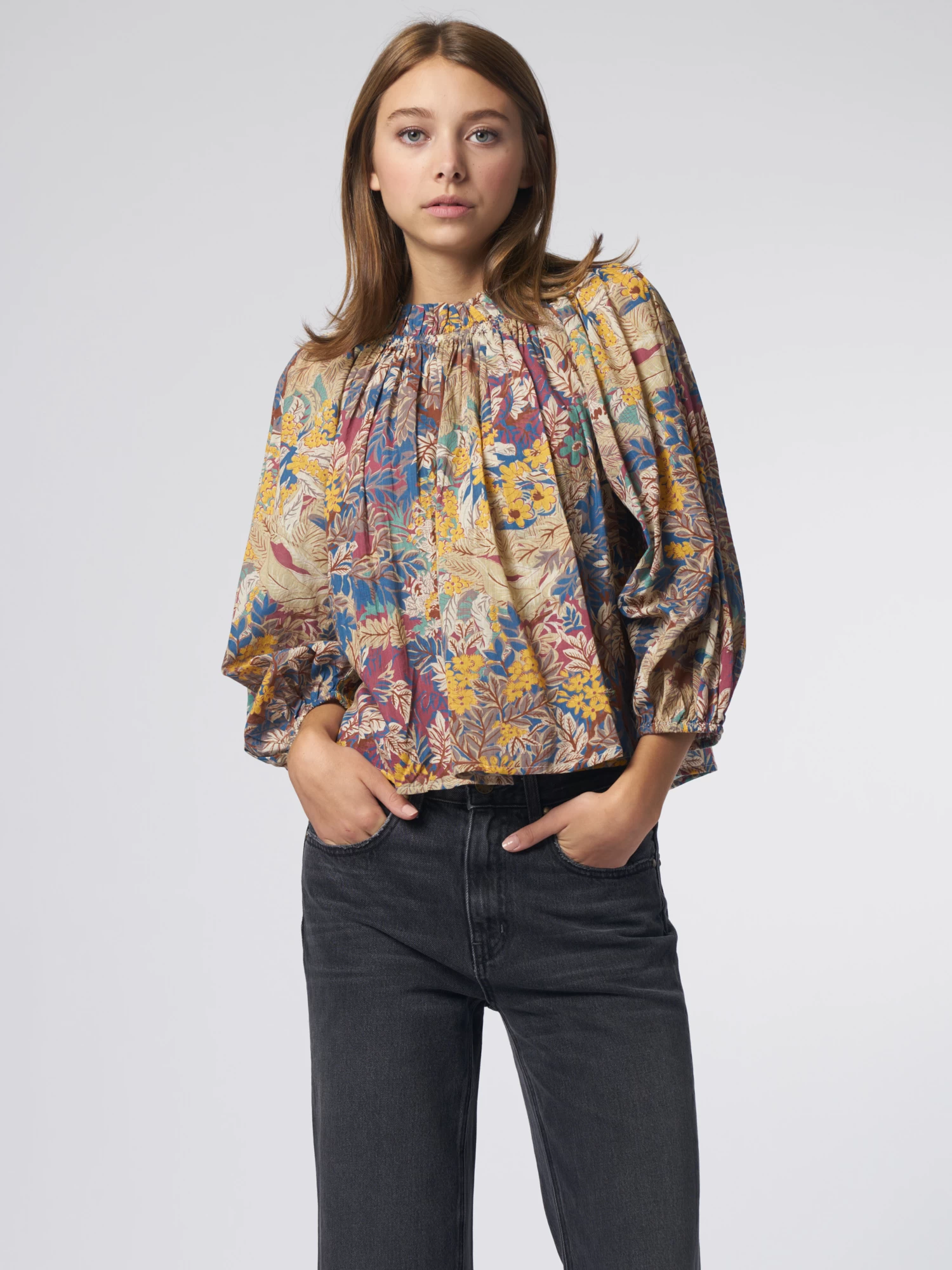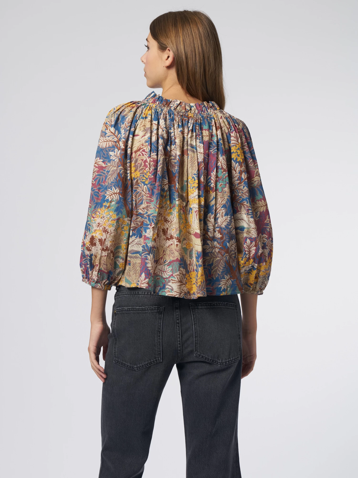 The slightly cropped blouse features a flattering, ruffled neckline, and blouson sleeves with elasticated cuffs