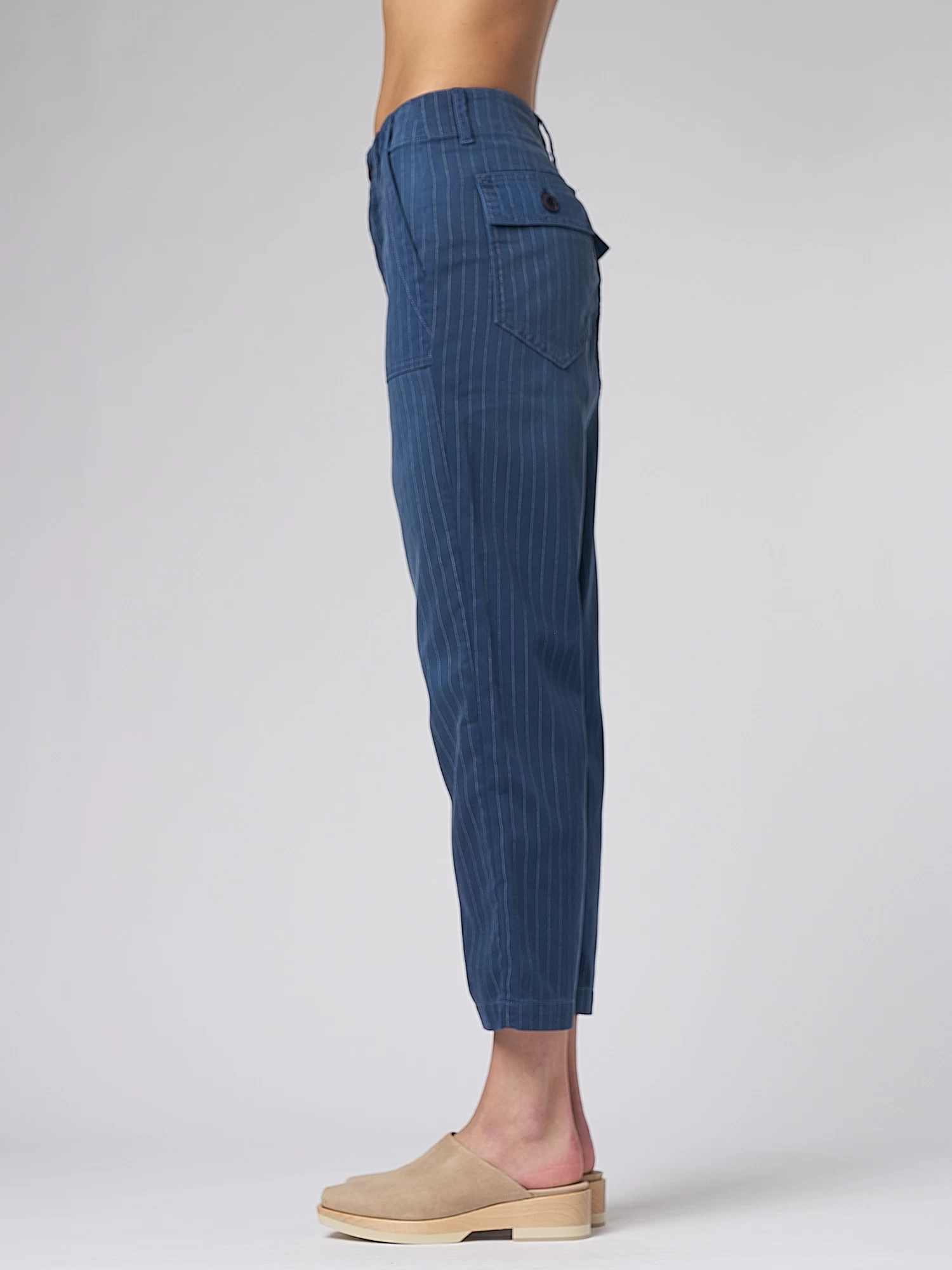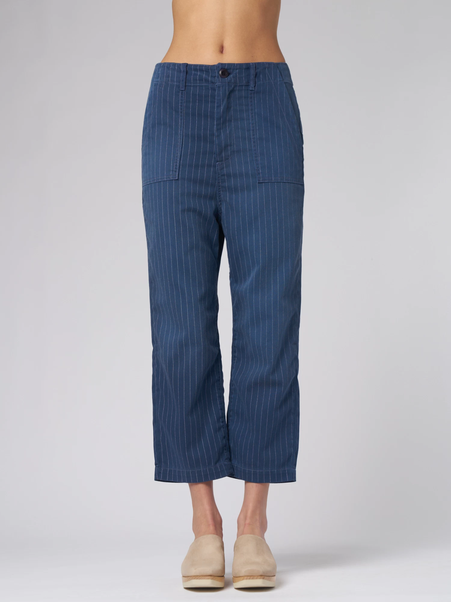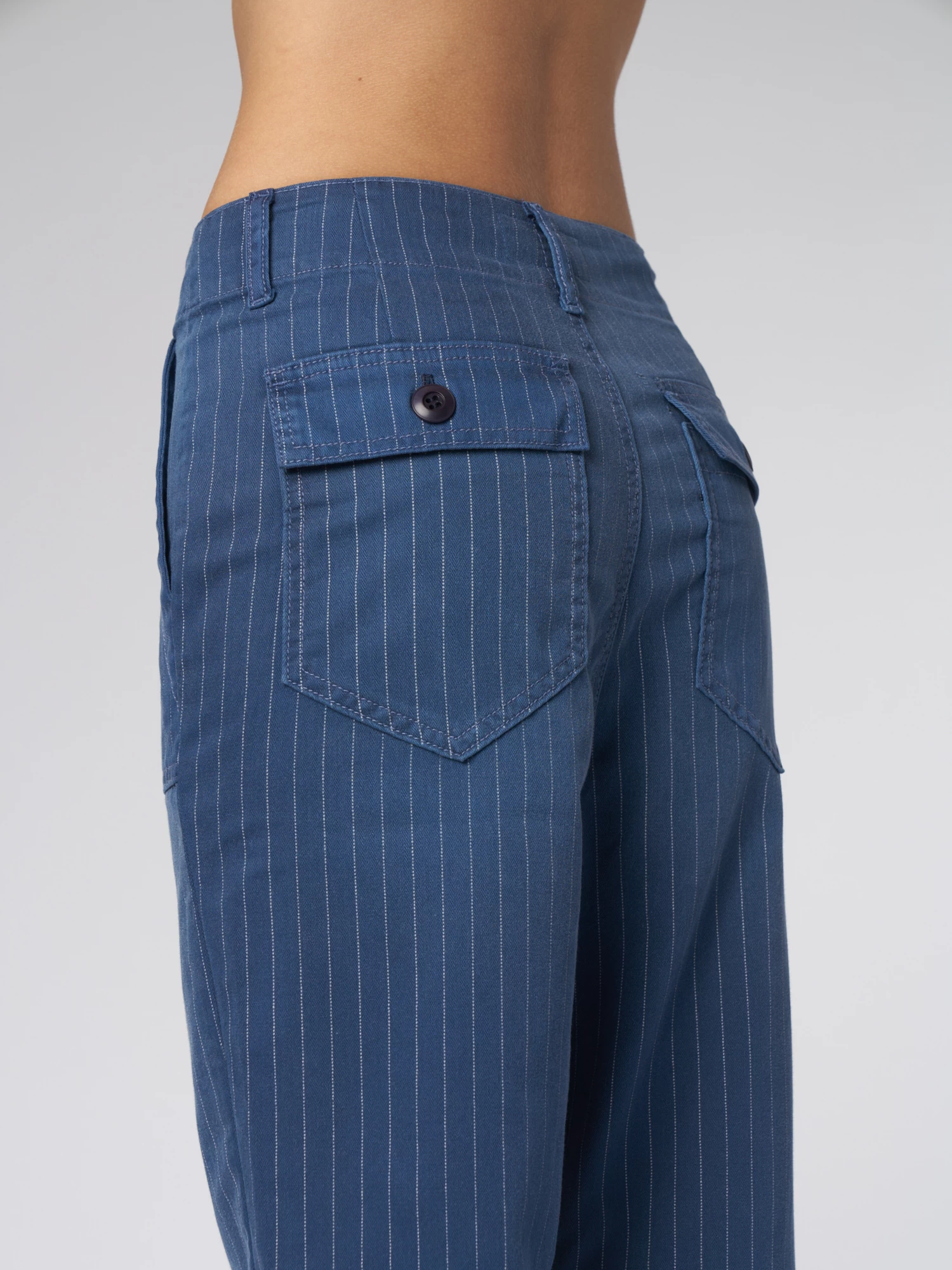 Very Soft Herringbone Pinstripe features army patch pockets, corozo buttons, and an intentionally dropped rise.