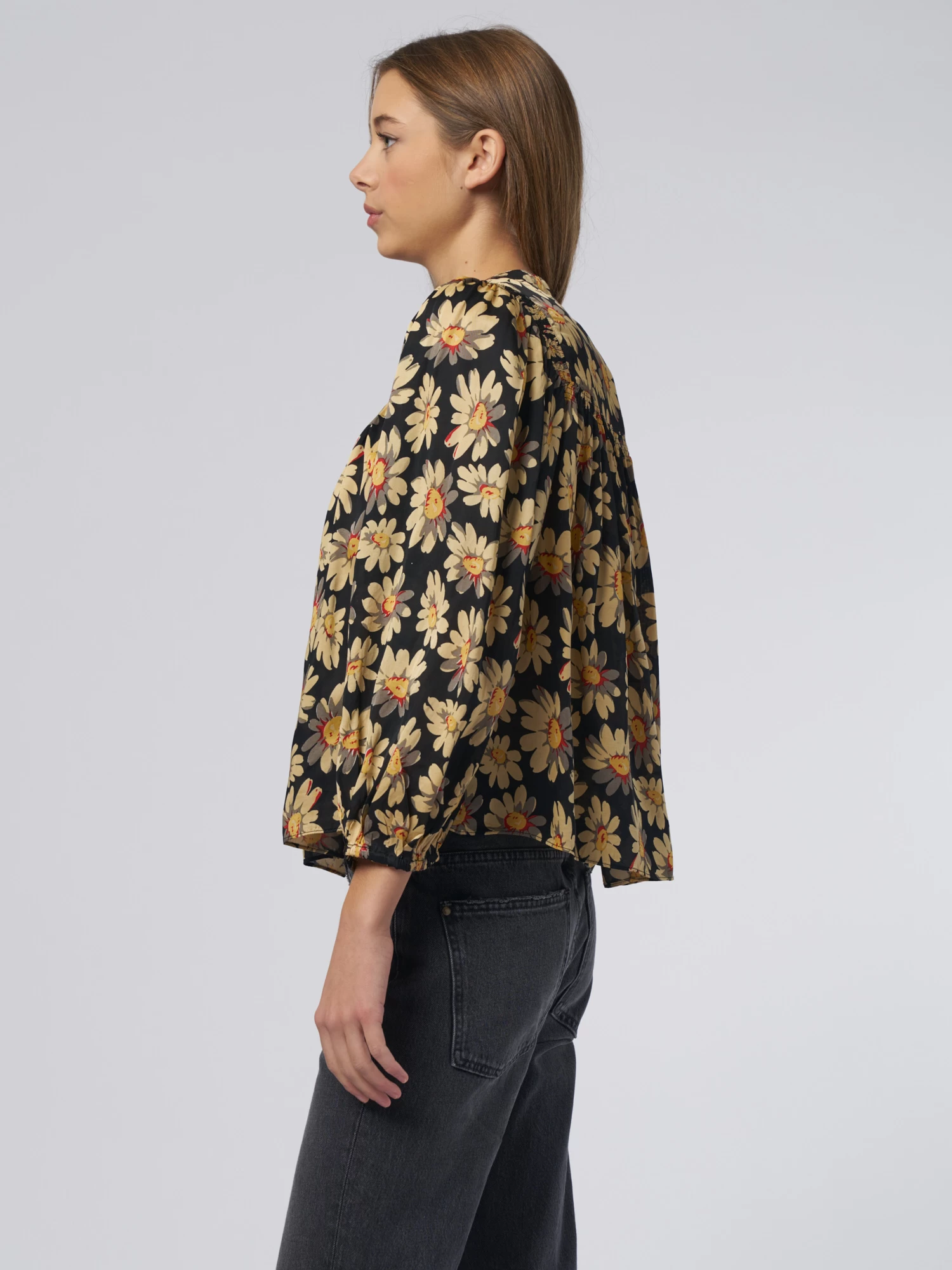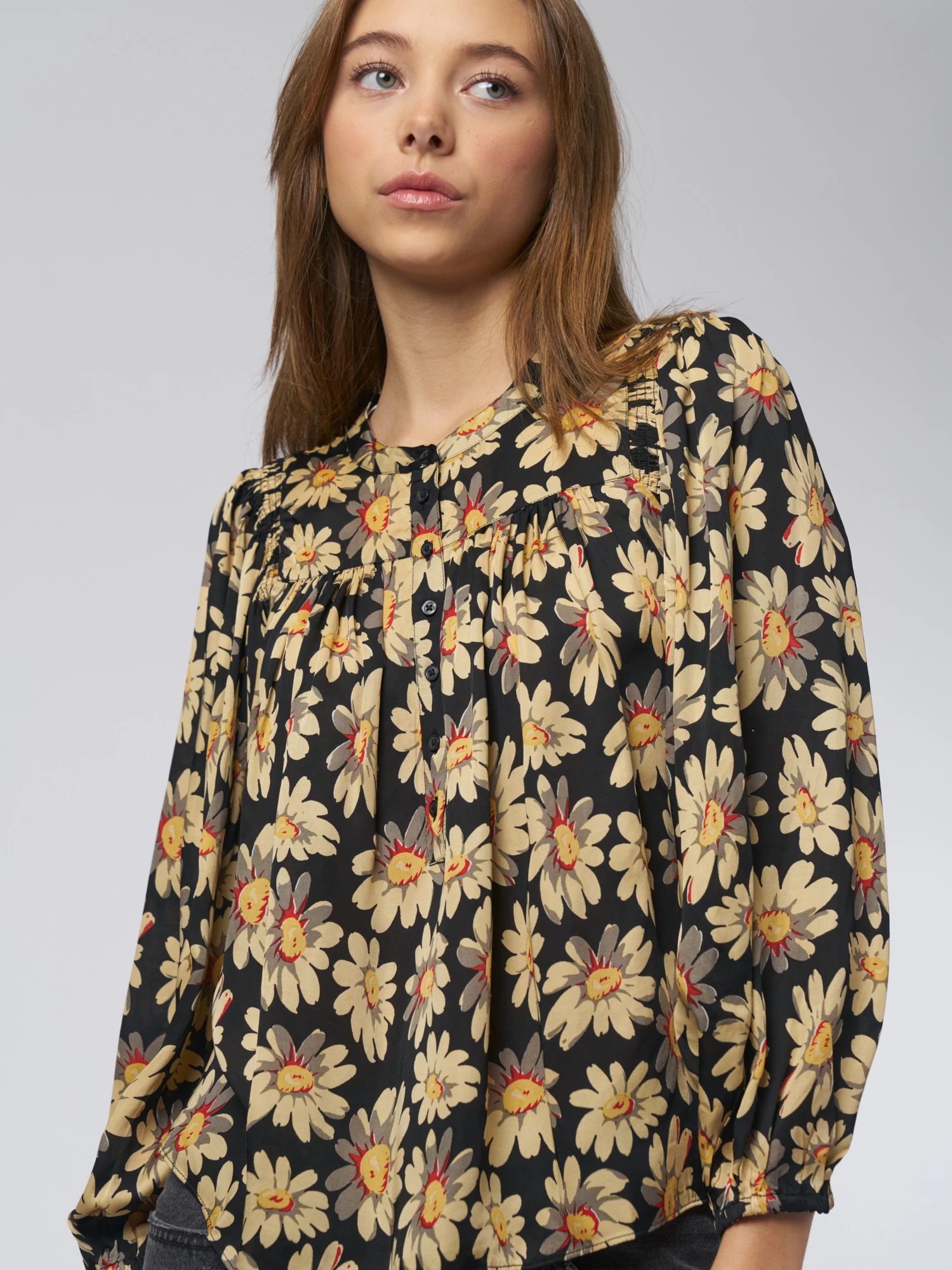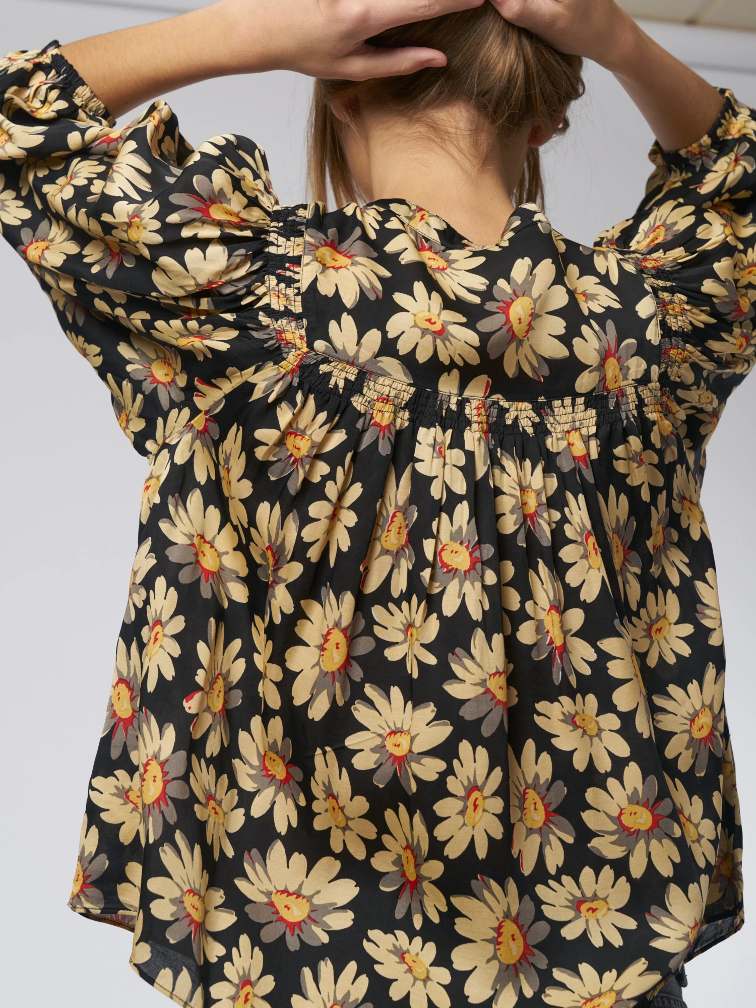 The effortless top has a slightly loose fit and features set-in sleeves, delicate smocking, and elasticated sleeve openings for ease.