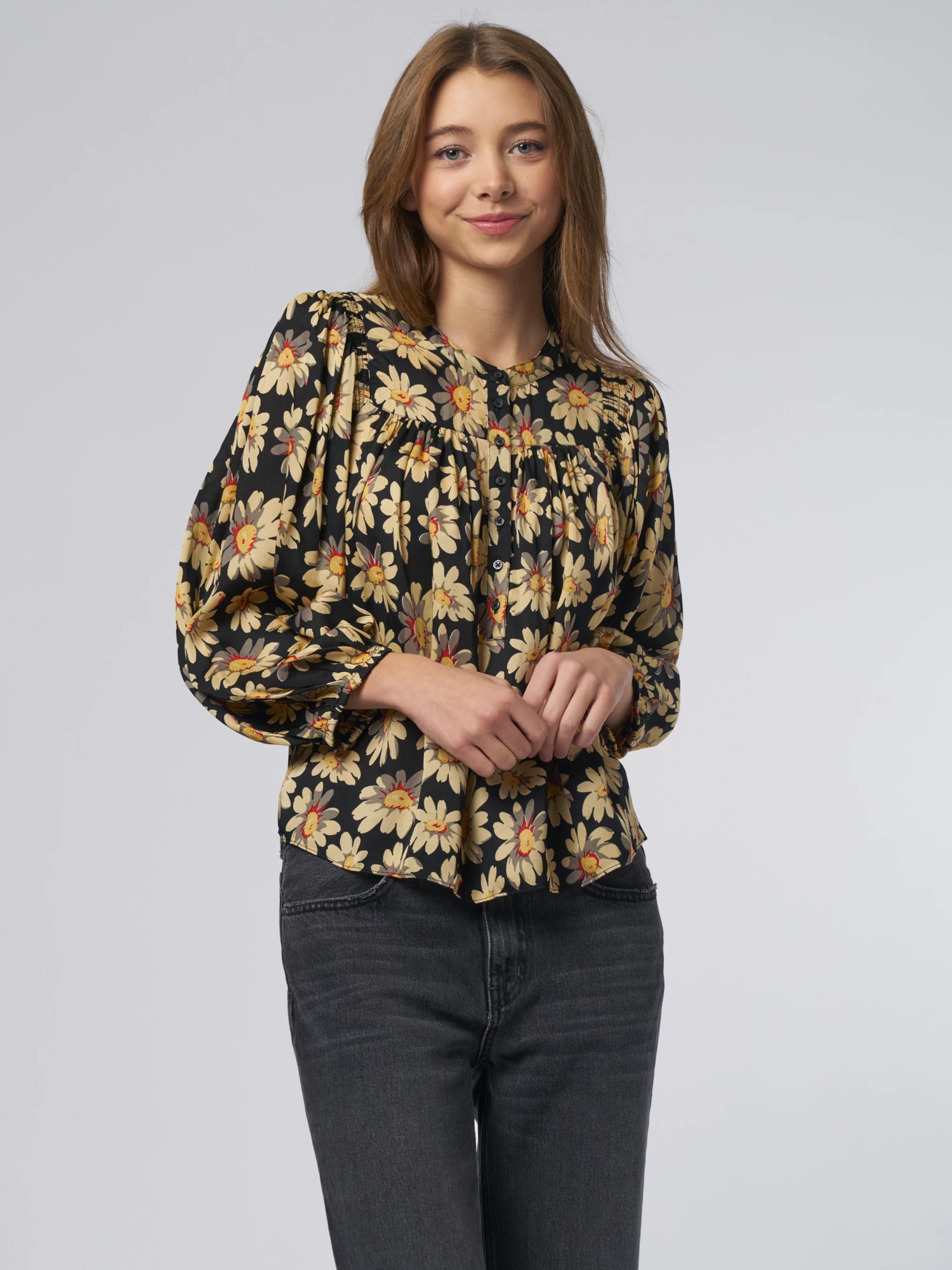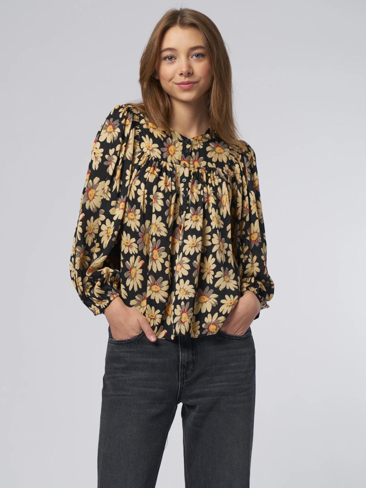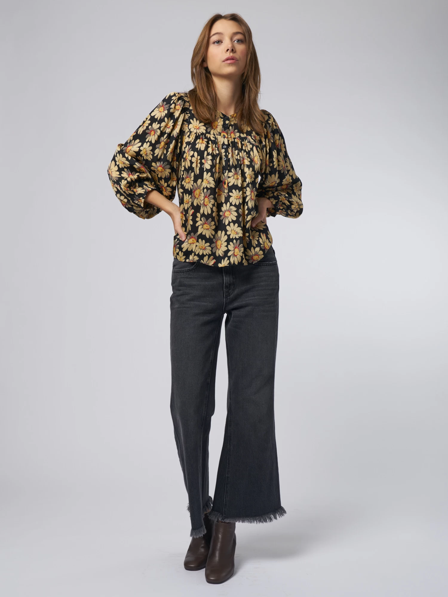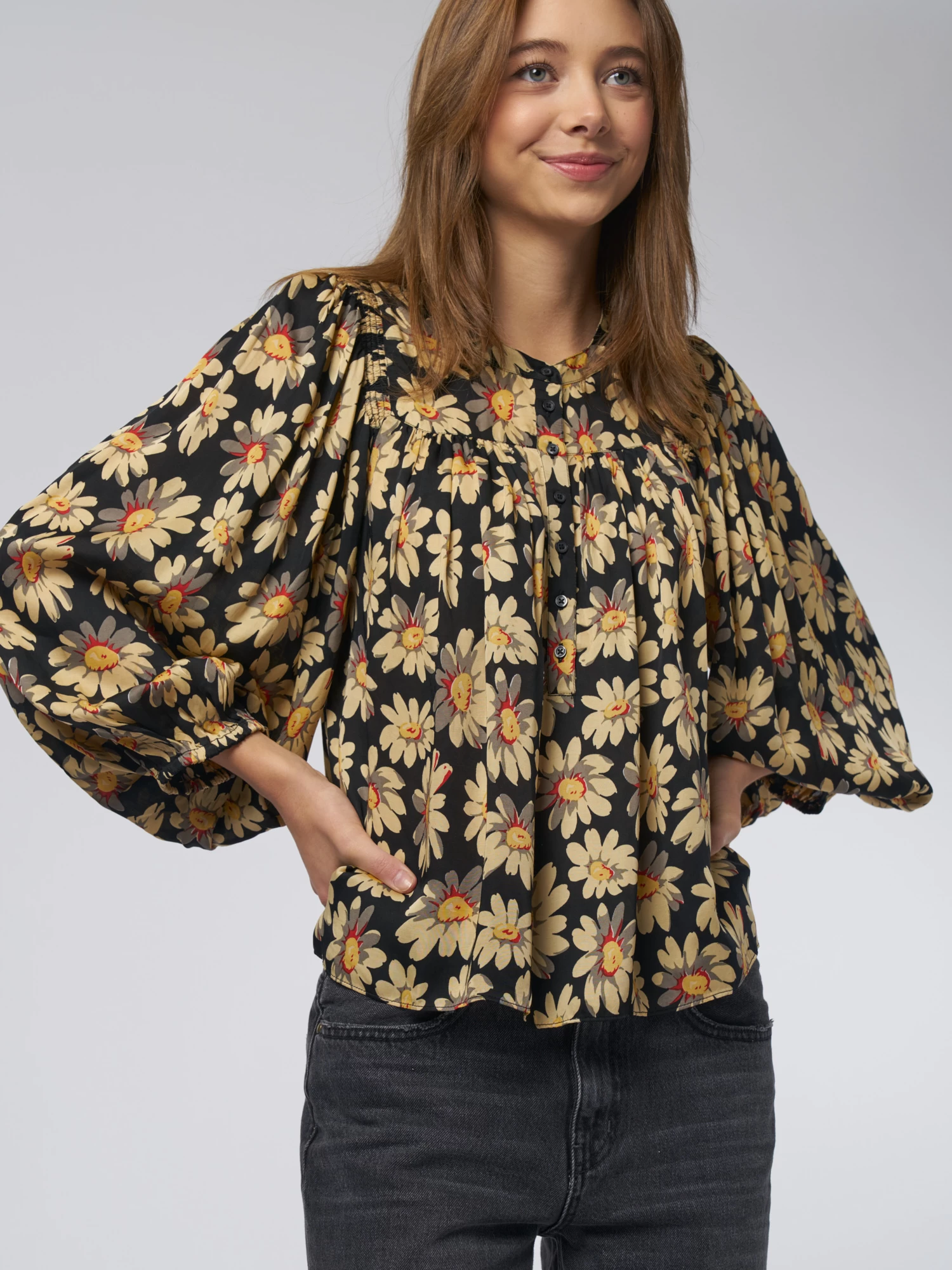 The effortless top has a slightly loose fit and features set-in sleeves, delicate smocking, and elasticated sleeve openings for ease.