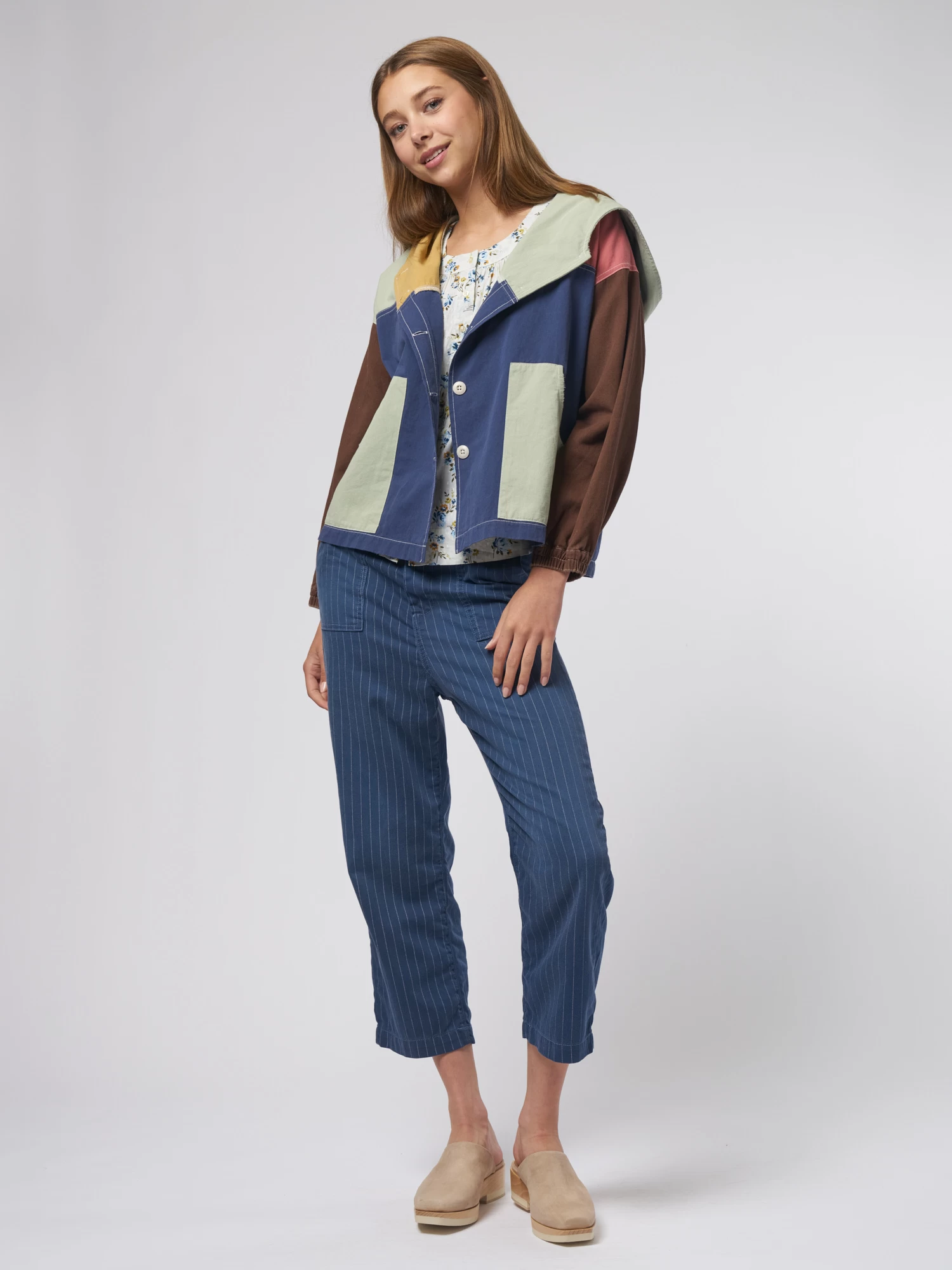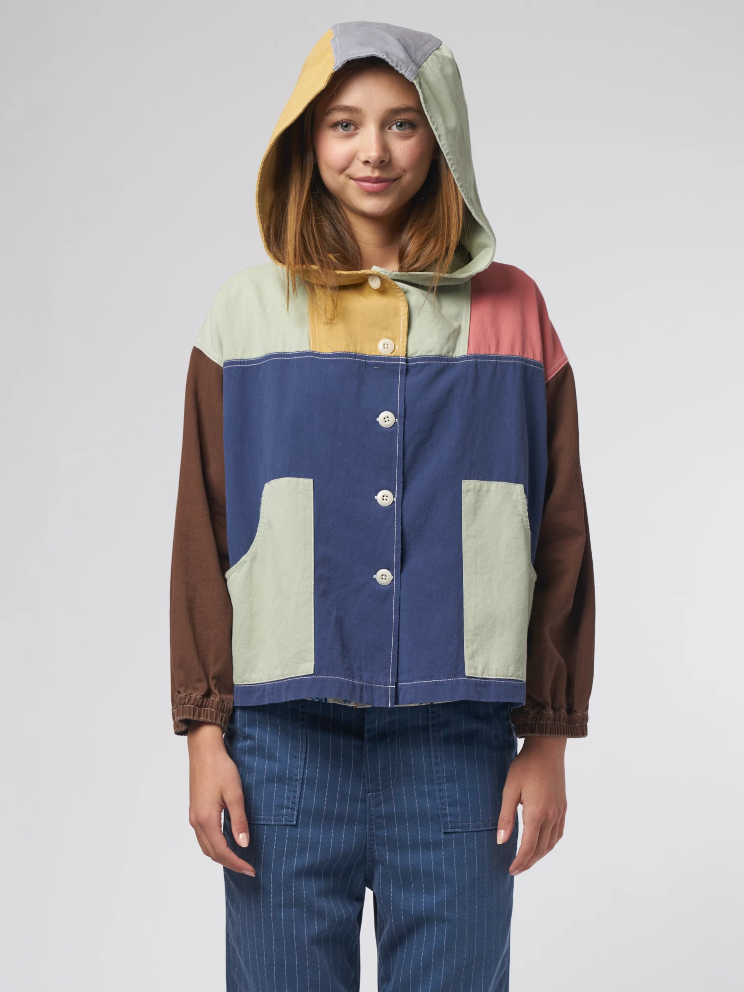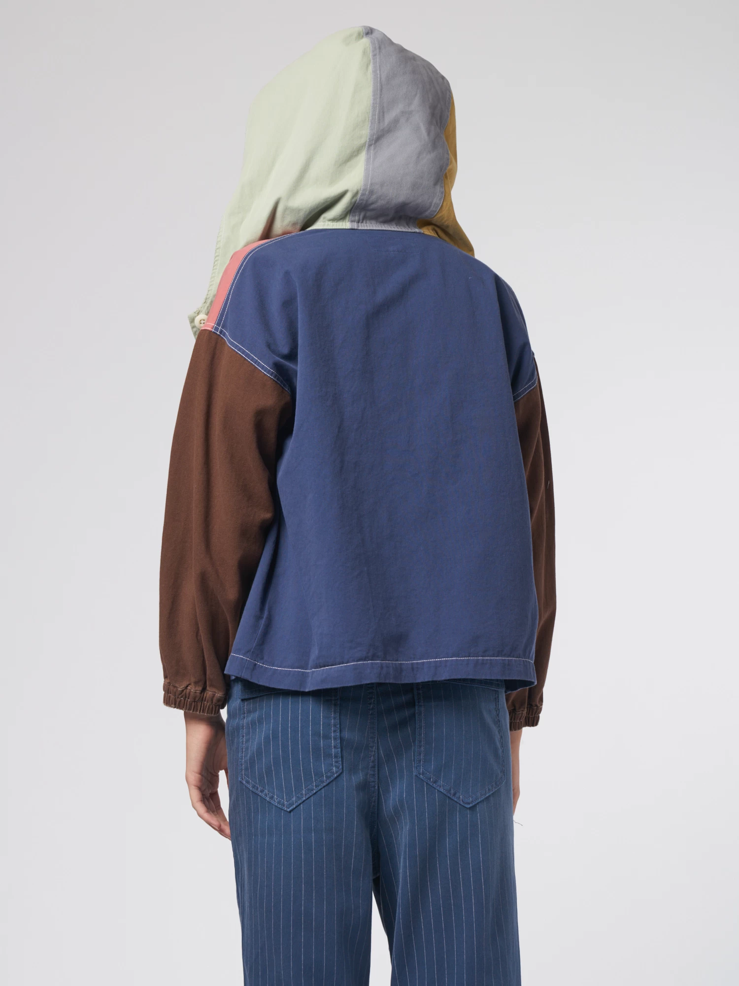 Color-blocked hoodie in garment-dye cotton twill features button front closure, blouson-shaped sleeves with elastics cuffs, and front patch pockets.