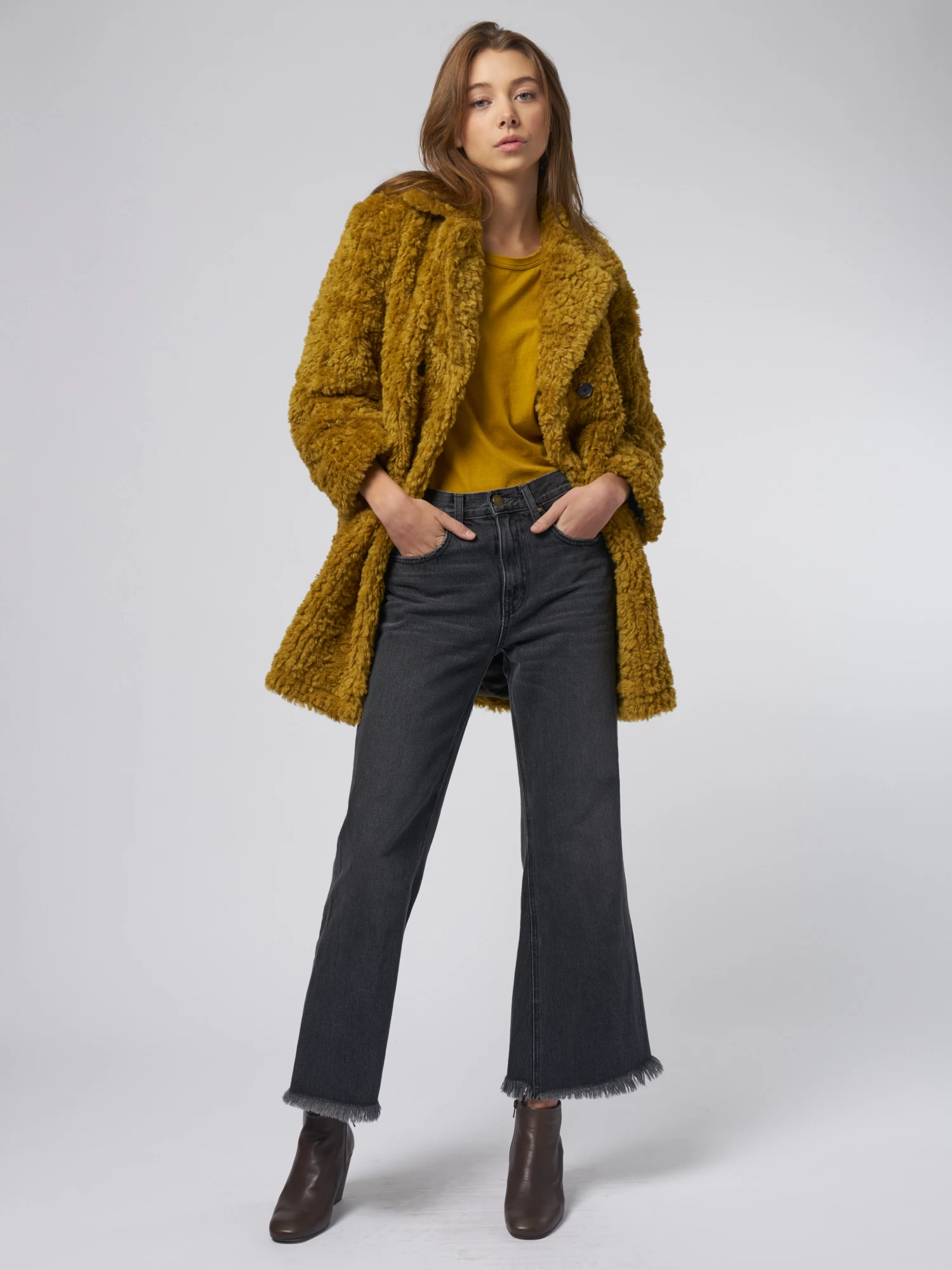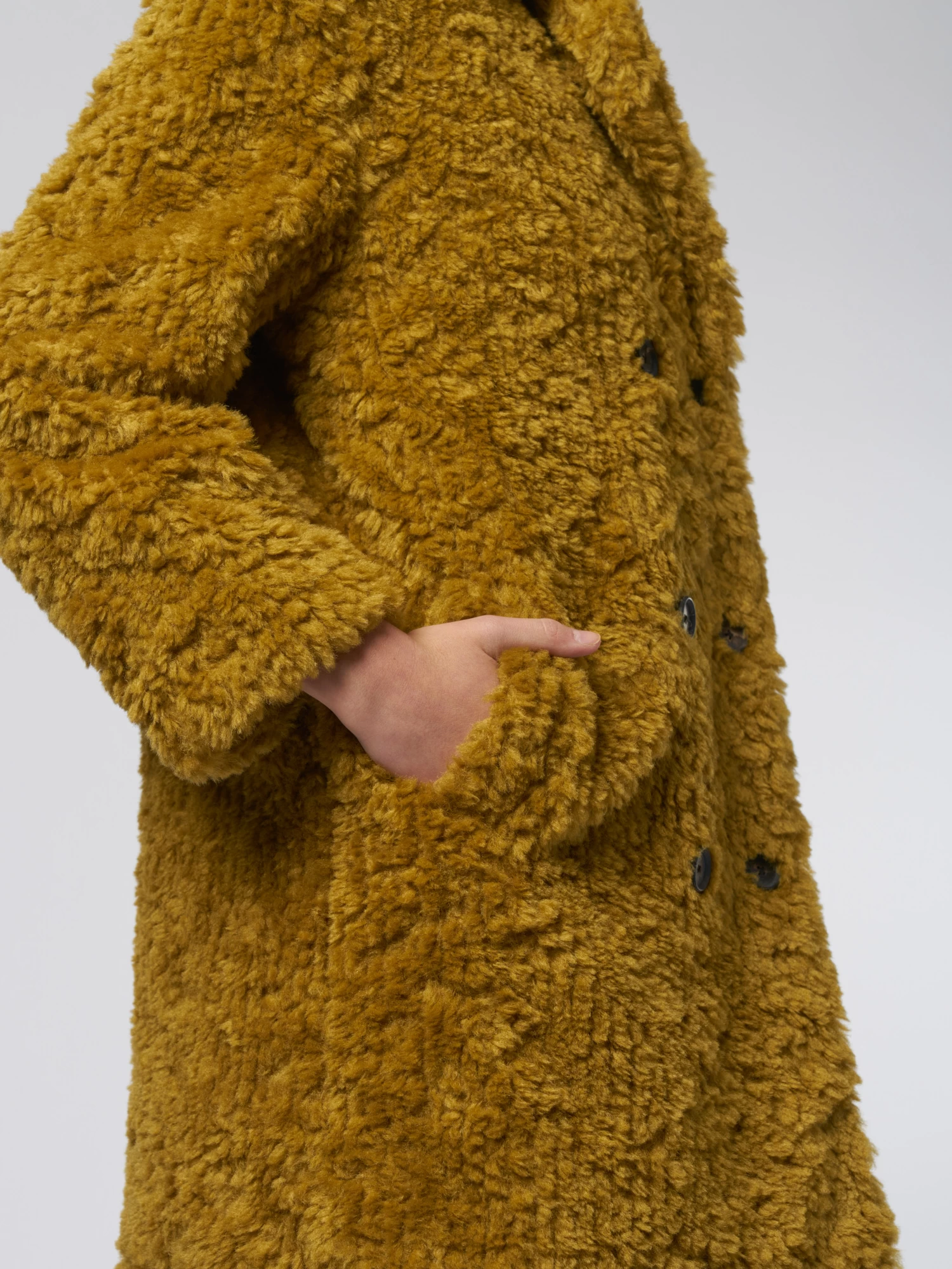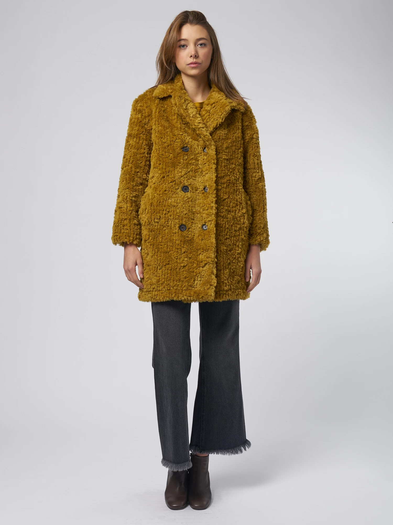 The fluffy double-breasted coat features set-in shoulders, horn buttons, and a tonal interior lining in the softest quilted satin.