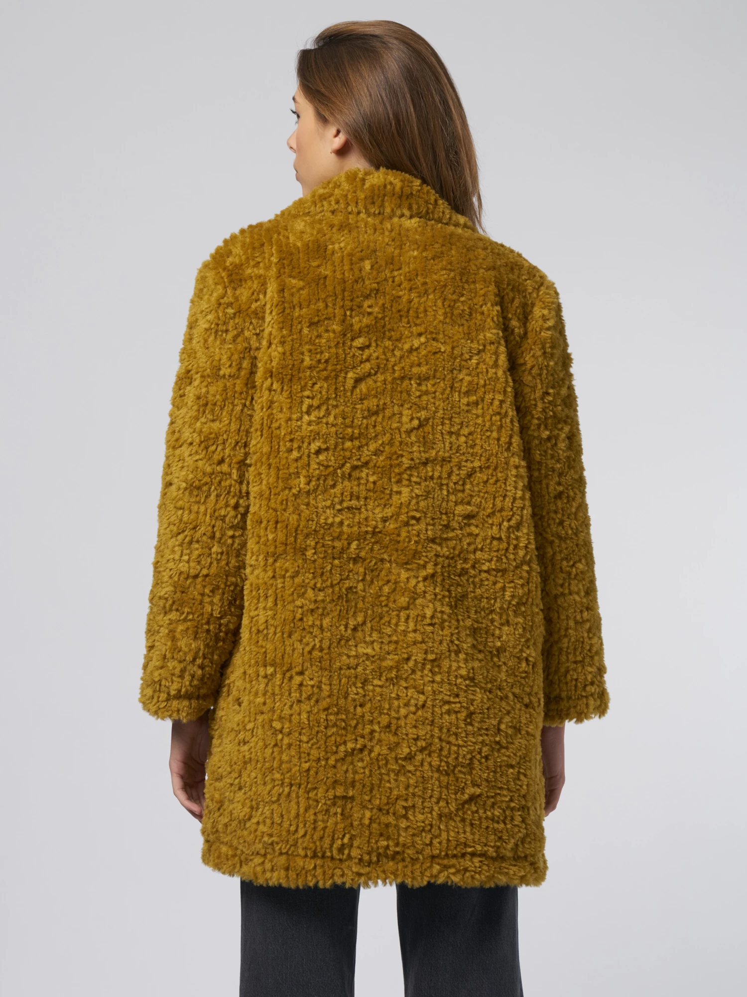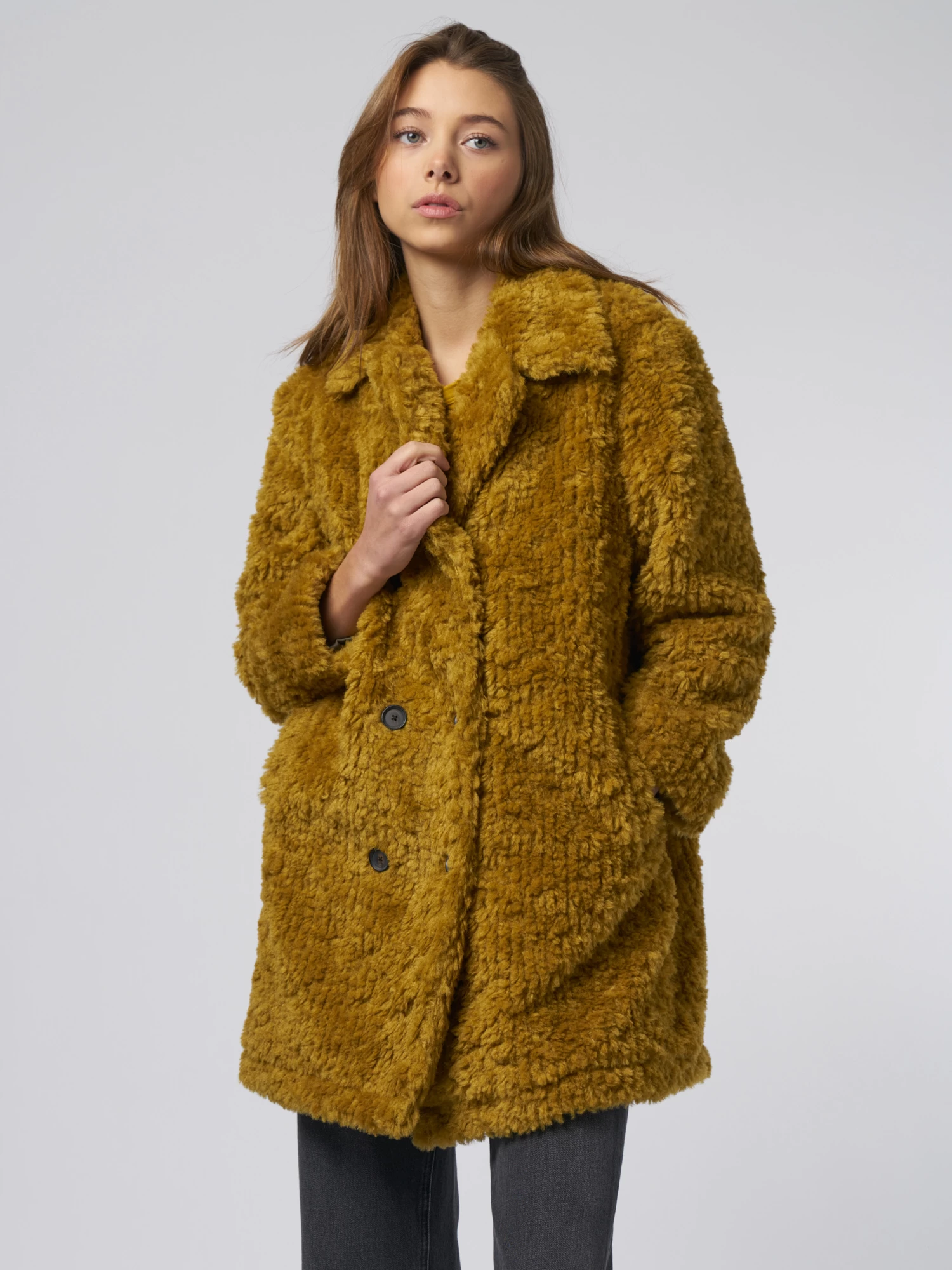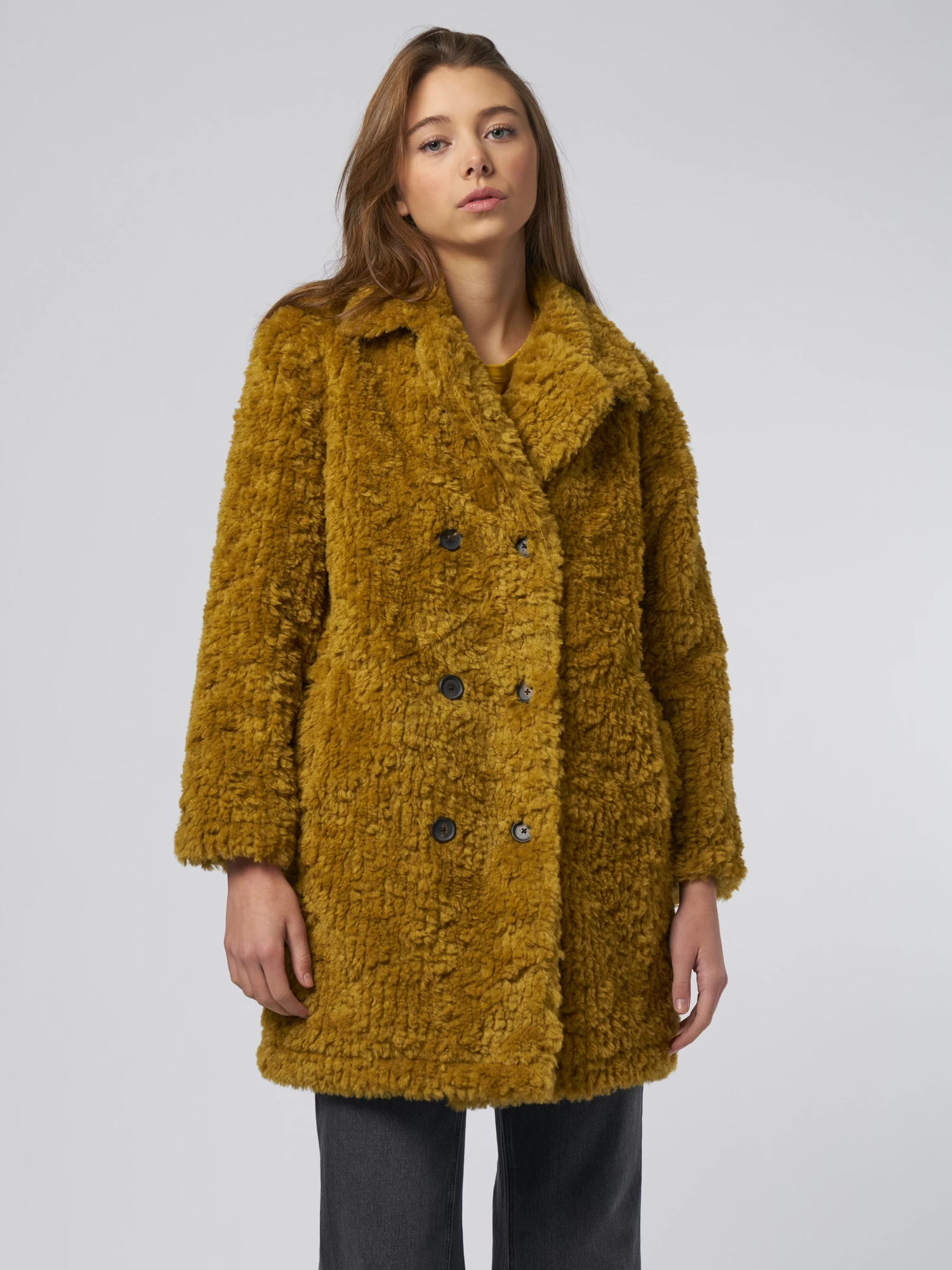 The fluffy double-breasted coat features set-in shoulders, horn buttons, and a tonal interior lining in the softest quilted satin.