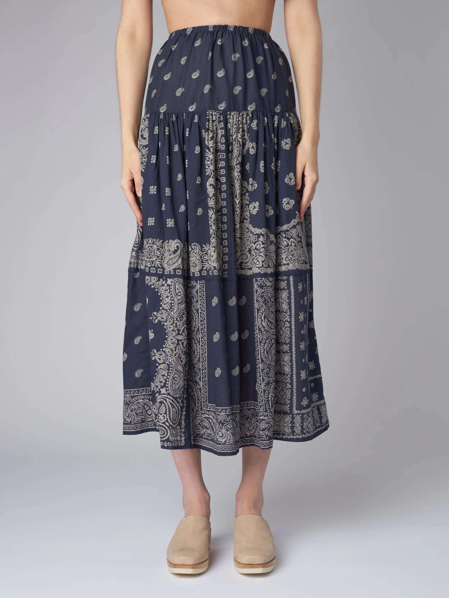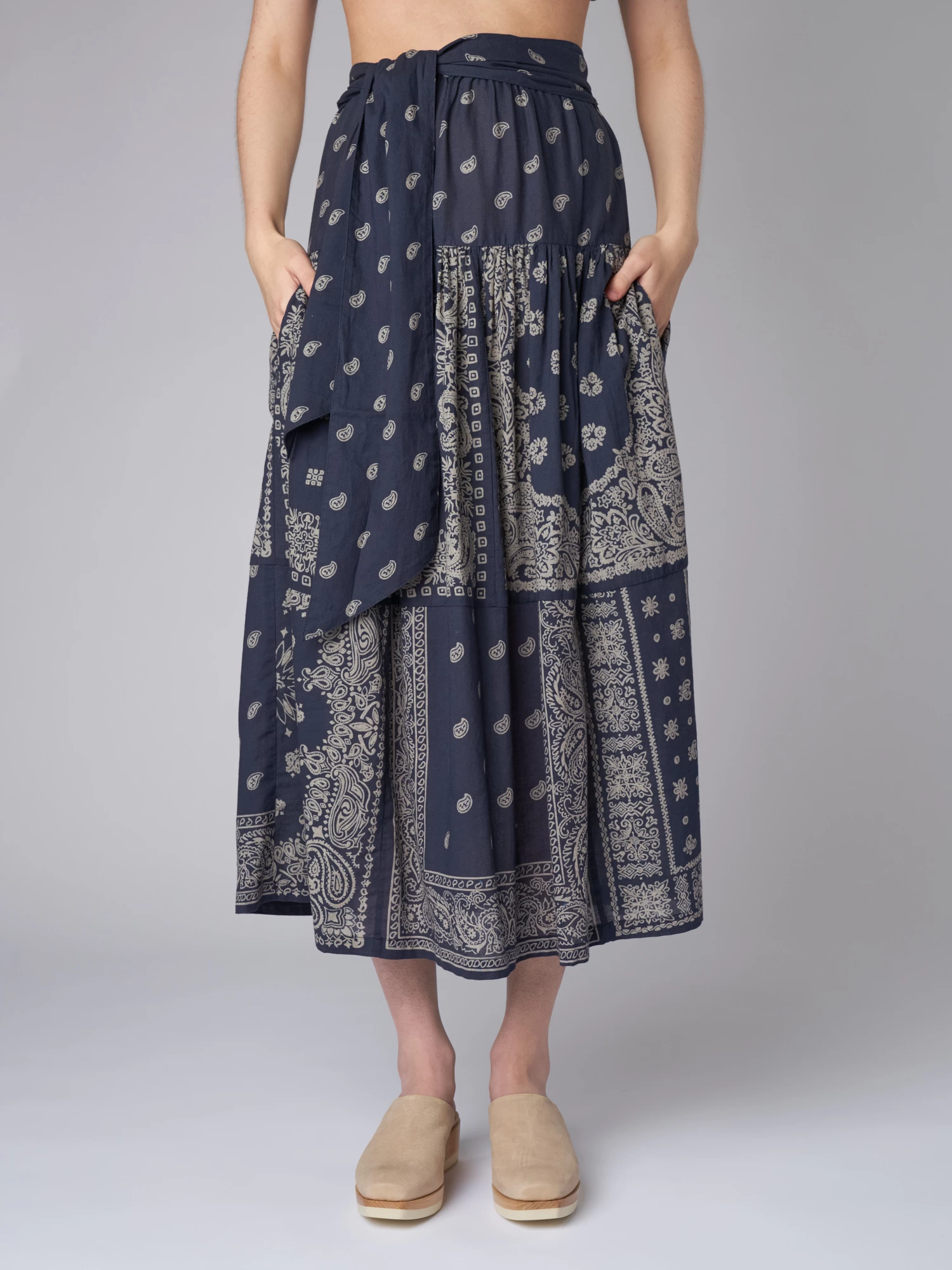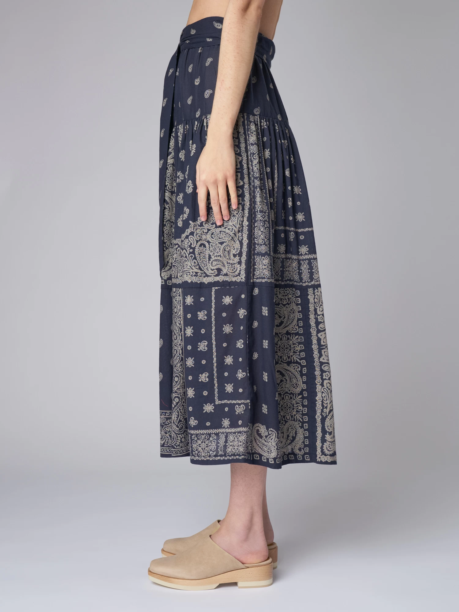 Flowy cotton voile skirt pieced in patchwork squares, it’s designed to be worn high at the waist and falls naturally into an elegant midi hem.