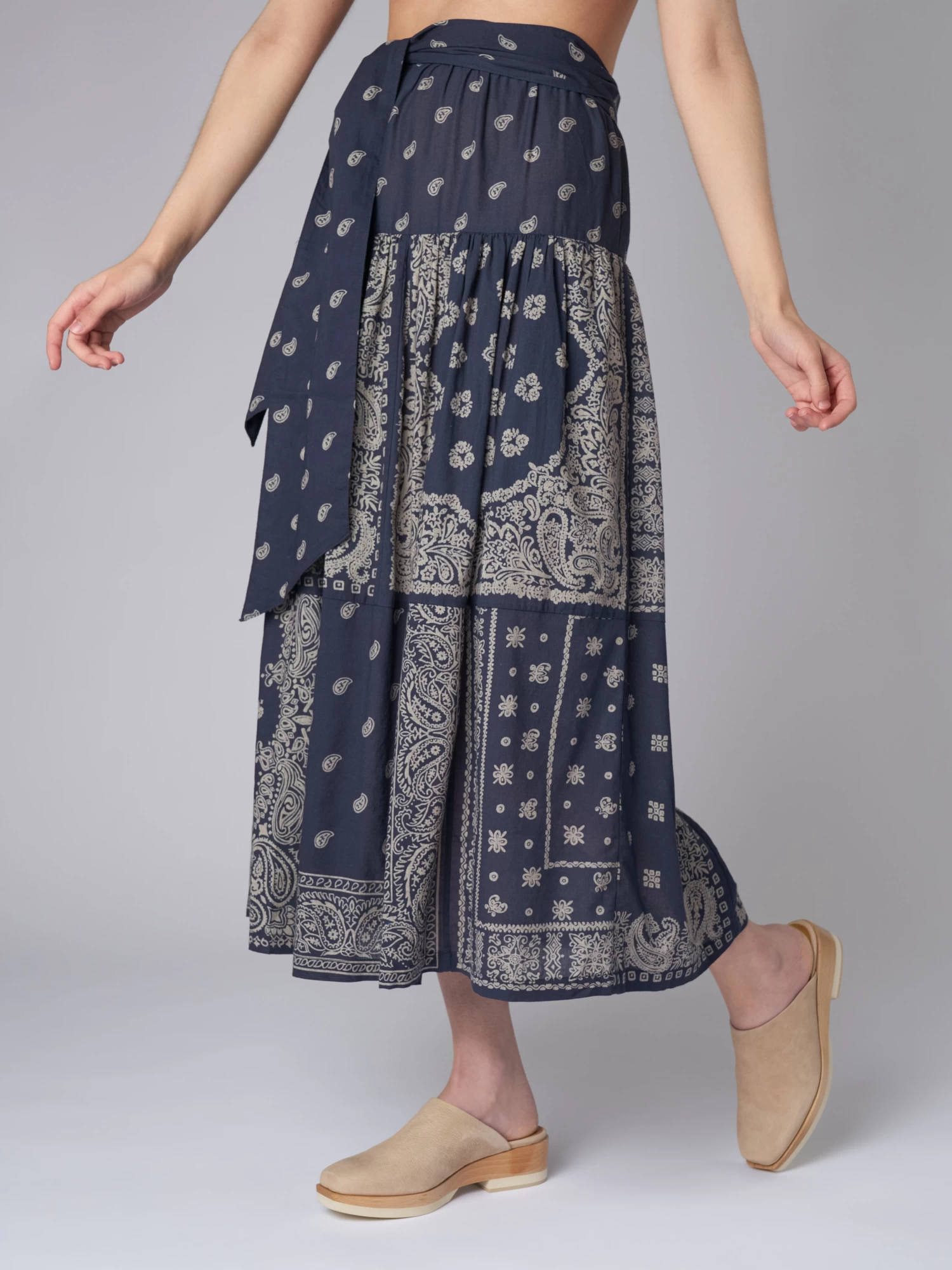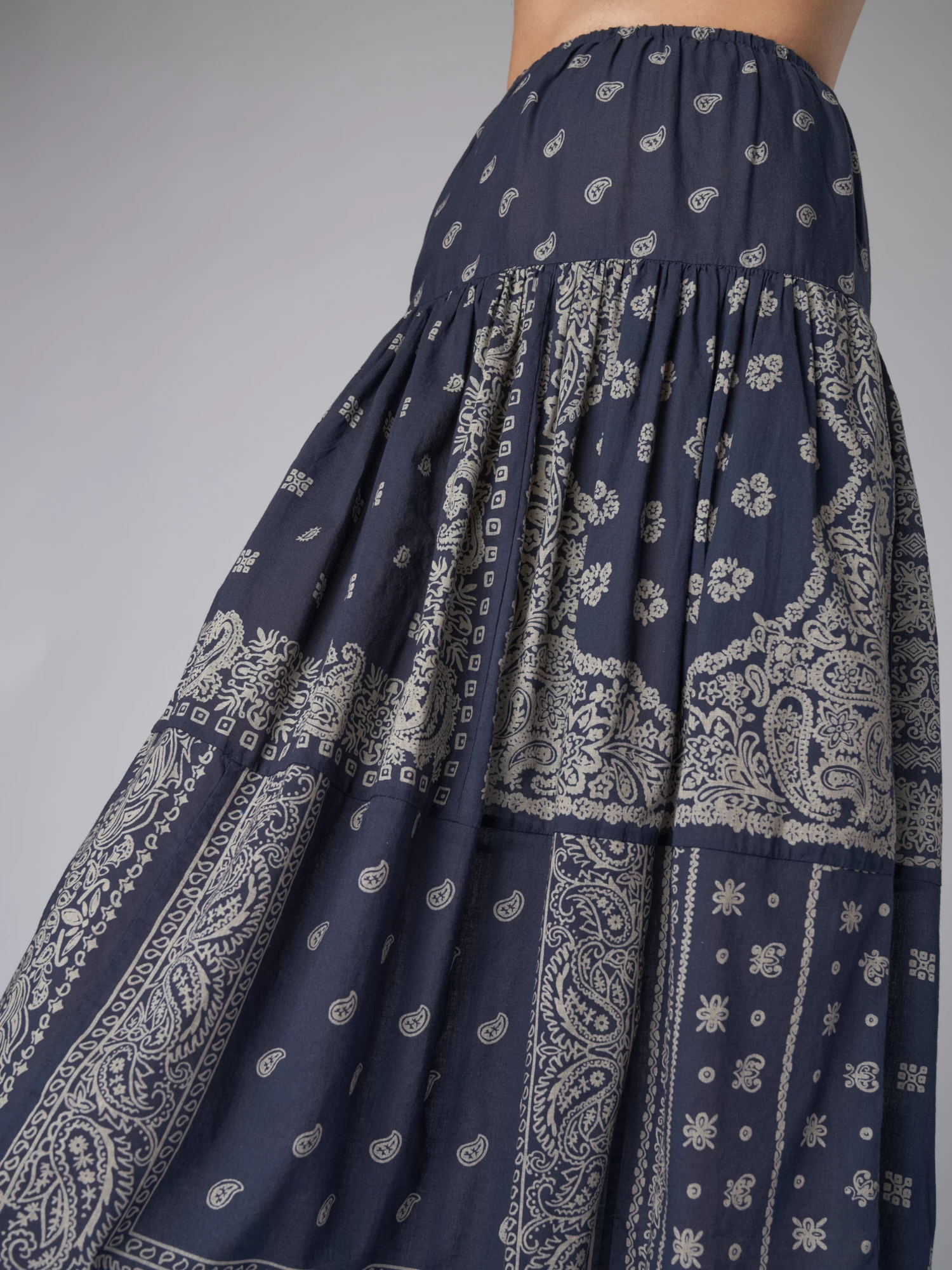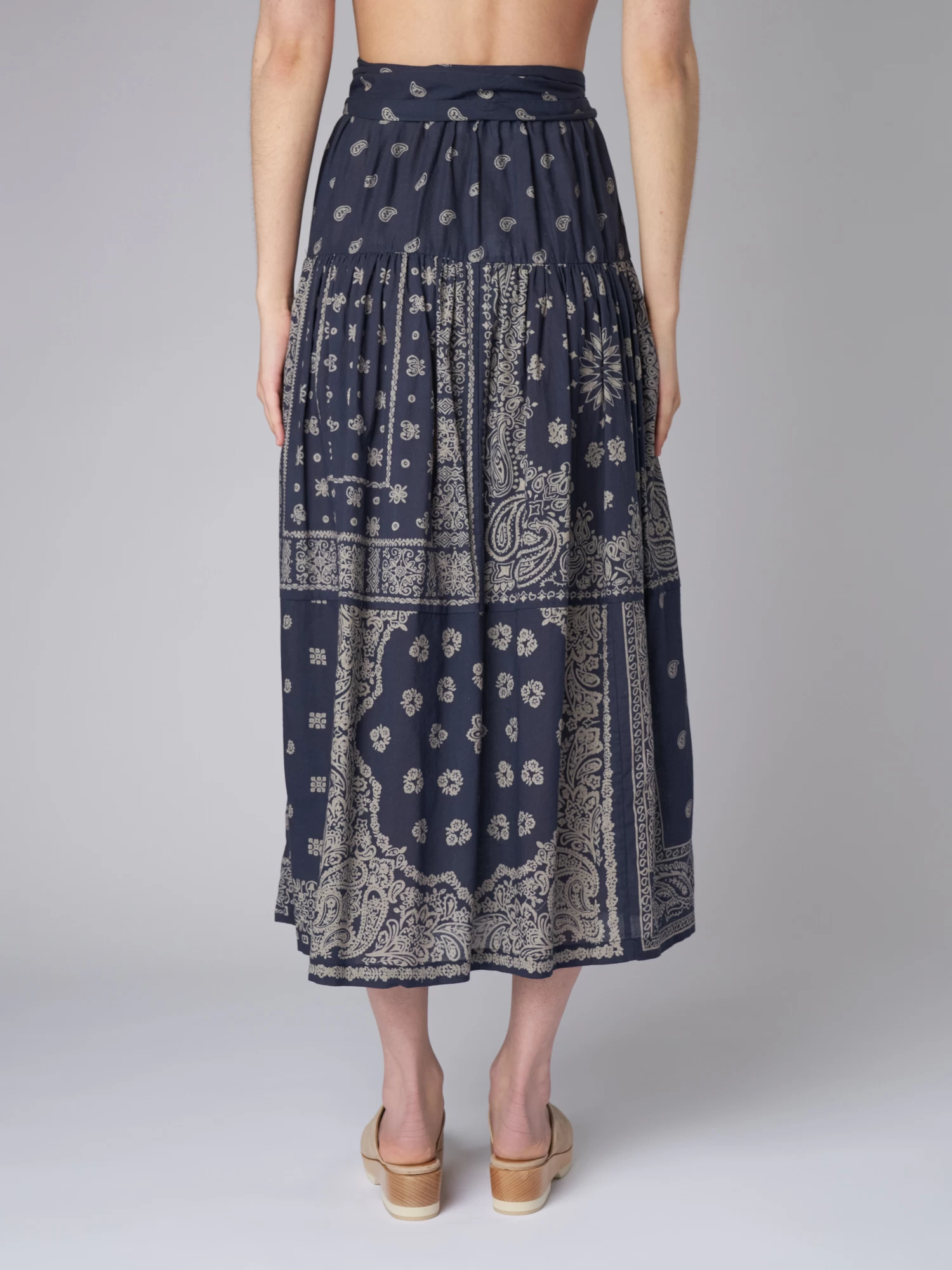 Flowy cotton voile skirt pieced in patchwork squares, it’s designed to be worn high at the waist and falls naturally into an elegant midi hem.