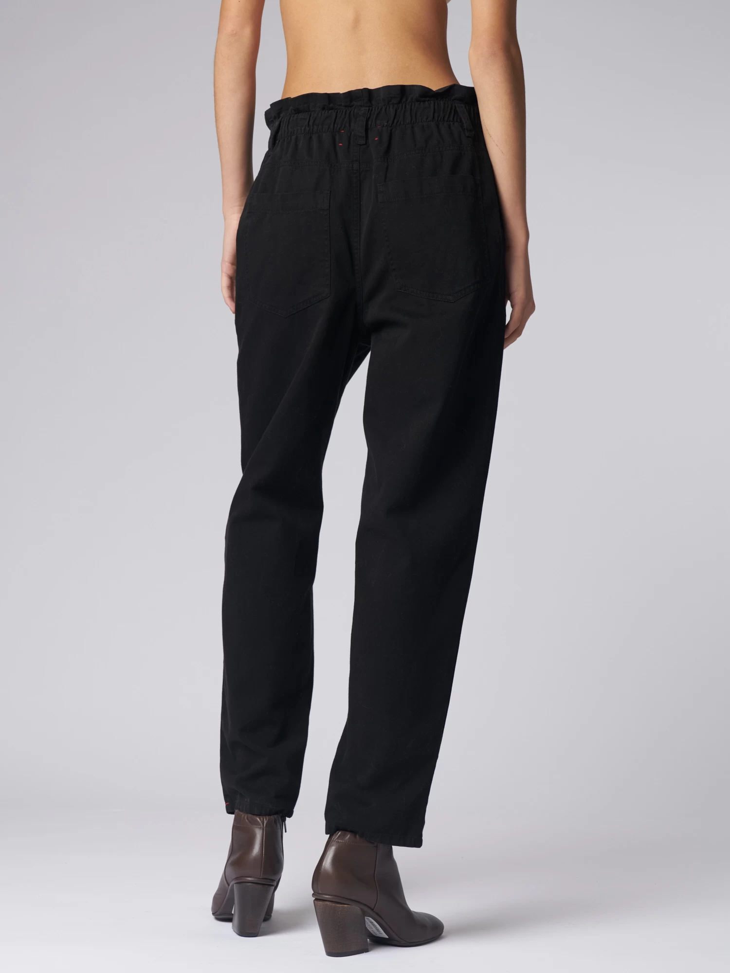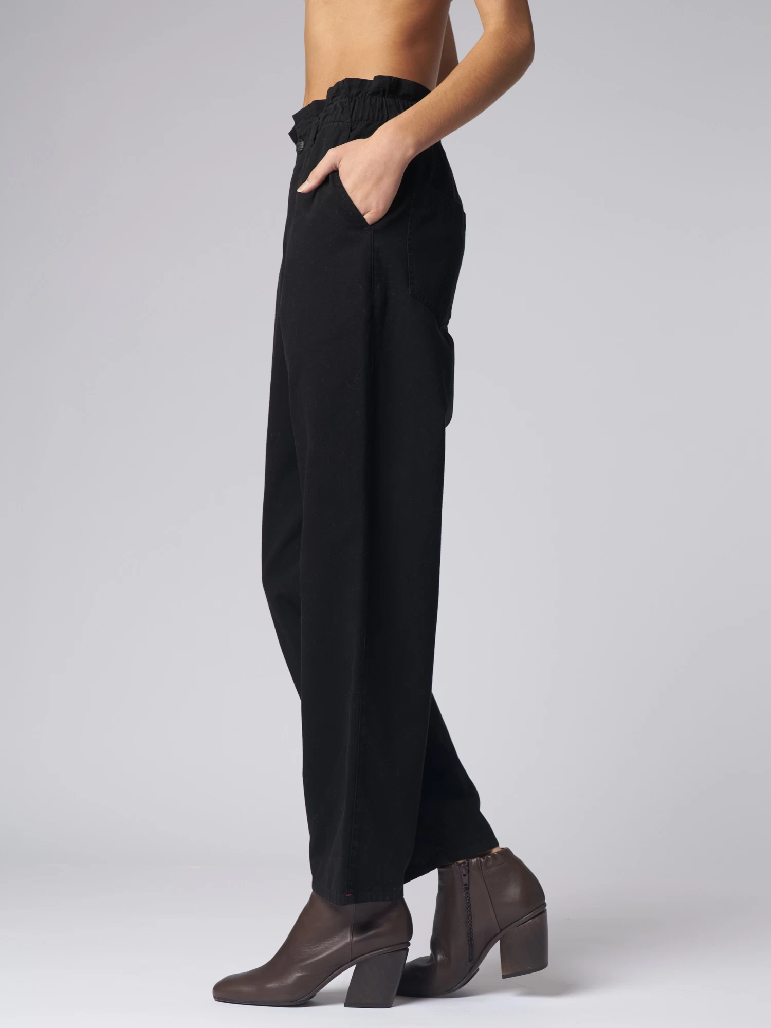 Easy straight leg pant has an elastic paper bag waist with button fly, side seam pockets, and back left pocket.