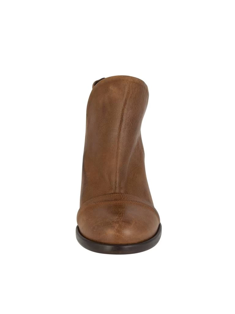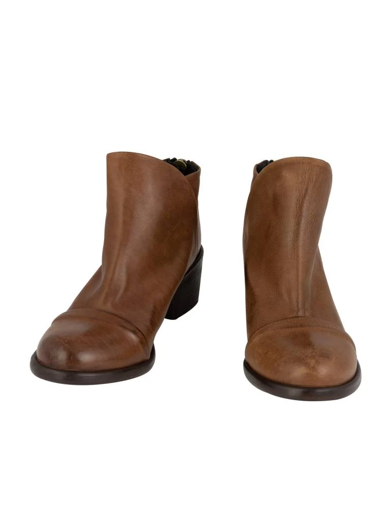 A leather ankle boot with a tulip cut and zippered back.